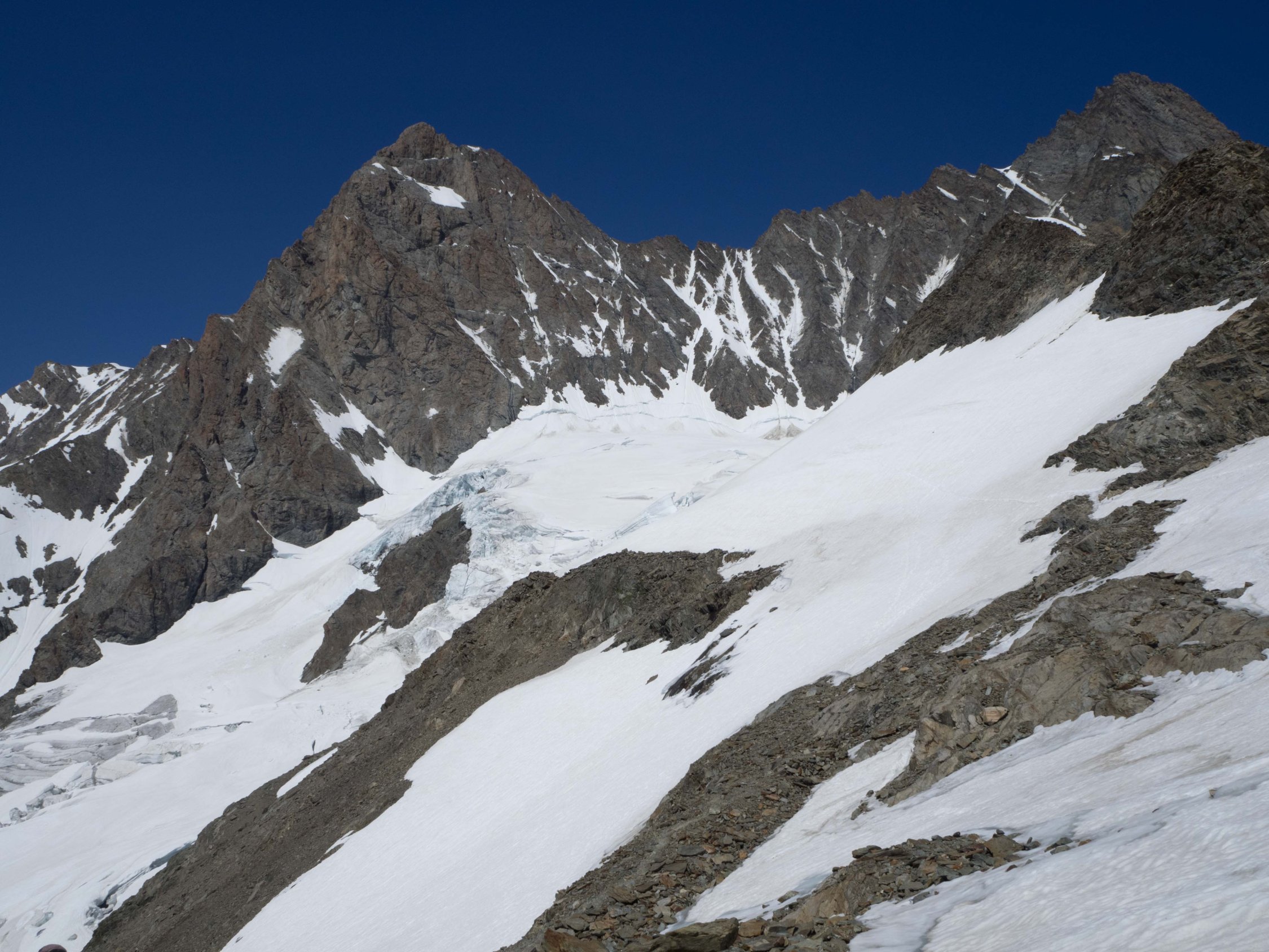 Abstieg über den Schreckhorn Normalweg (SW-Grat): Ebenfalls sehr gute Verhältnisse. Im obersten Teil noch zwei Firnfelder, ansonsten komplett scheefrei. Das Couloir, welches am Schluss der Kletterei vor dem Abstieg auf den Schreckfirn, überwunden werden muss, ist bei den aktuellen Temperaturen am Nachmittag steinschlägig. Der Bergschrund im Übergang vom Schreckfirn zur eigentlichen Kletterroute ist noch geschlossen und kann ohne technische Probleme überwunden werden. Vom Gaagg bis zum Oberen Ischmeer hat es ein fast durchgängies Schneefeld. Man kann durch dieses Abrutschen und die Abstiegszeit sicherlich um 30' verkürzen.