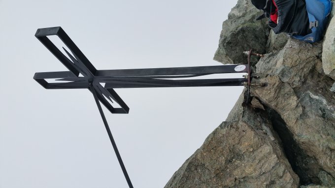 Die Hitzewelle (0°-Grenze seit mehr als einer Woche über 4000m) hinterlässt ihre Spuren: Grat bis zum Gipfel trocken. Firn auf Glacier de la Ruinette nur noch teilweise tragend. Sind daher im Aufstieg ab P. 3470 bis zum Gipfel ständig auf S respektive SW-Grat geblieben. Das Gipfelpanorama blieb uns verwehrt. Ab 3700m Sicht noch knapp 50m. Im Abstieg nach Gipfelaufschwung auf Firnfeld (Abseilstelle mit Reepschnüren eingerichtet) und direkt runter zu P. 3470.