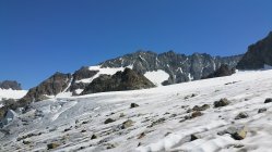 Glacier d'Otemma blank. Nordhänge unter dem Abbruch des Glacier de l'Aiguilette unten mit nicht mehr tragendem Firn und oben blank. Steinschlag aus Hängen unter P. 2935.