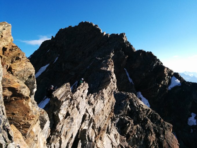 Grat ist wie zu erwarten staubtrocken. Super schöne, teilweise exponierte, aber immer gut absicherbare Kletterei. Wir sind alle Gendarmen abgeklettert, weil uns das schneller schien als abzuseilen. Das geht gut (wenn der Vorsteiger ein paar Sicherungspunkte setzt), es hat aber auch Abseilstände. Man kann sehr gut und effizient mit einem kleinen Set Cams (0.5-2) zwischensichern, ist aber nicht unbedingt notwendig. 30m-Seil sollte ausreichen für die Abseilstellen. Es war recht viel los auf der Route, aber nicht unangenehm, man kommt gut aneinander vorbei. Wir hatten mit 6h auf dem Grat Einiges länger, als im SAC-Führer angegeben (4h), dies scheint aber kein unrealistischer Wert zu sein, wenn man sich diverse Online-Berichte anschaut. Der Abstieg ist im Moment ebenfalls fast aper (es hat ein kleines Firnfeld, für das es sich allerdings lohnt die Steigeisen anzuziehen). Sehr brüchig und generell sehr unangenehmes Gelände. Den Lagginhorn-Normalweg würde ich bei diesen Bedingungen niemandem empfehlen. Der Normalabstieg führt zudem unten über ein Firnfeld, das sehr dem Steinschlag aus der W-Flanke ausgesetzt ist (alle 10min poltert hier etwas runter...). Schnell sein ist angesagt! Alternativ kann man anscheinend auch weiter über den Geröllrücken absteigen, was aber deutlich länger ist, wenn man nach Hohsaas zurück will.