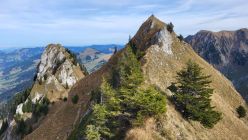 Von der Scharte auf die Fochsenflue ist das Gelände heikler (bis T6). Zuerst kann ein schmaler Grat überklettert werden (spassig!). Danach folgen steilere Gras-Schrofenaufschwünge mit kurzen Abstiegen auf die Fochsenflue. Einige Stellen können in den Flanken umgangen werden. Insbesondere die brösligen Felskuppen.