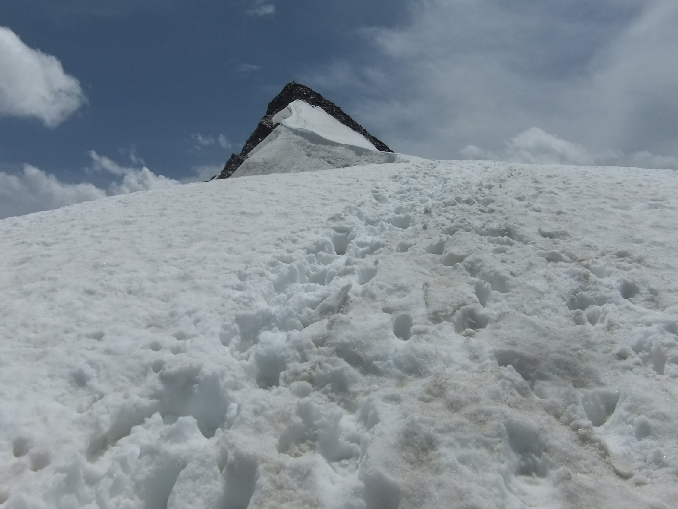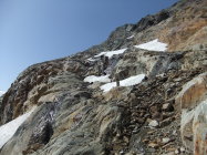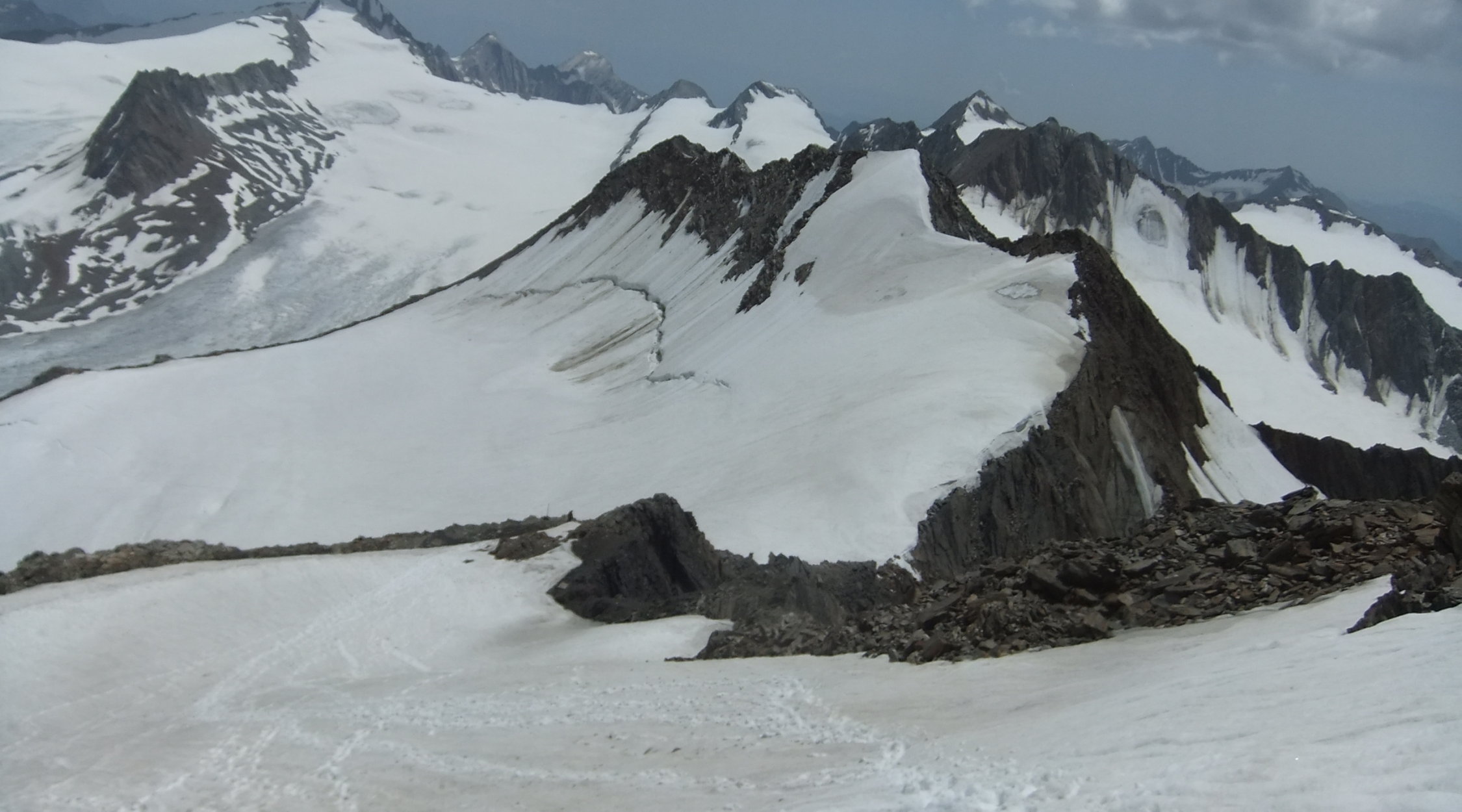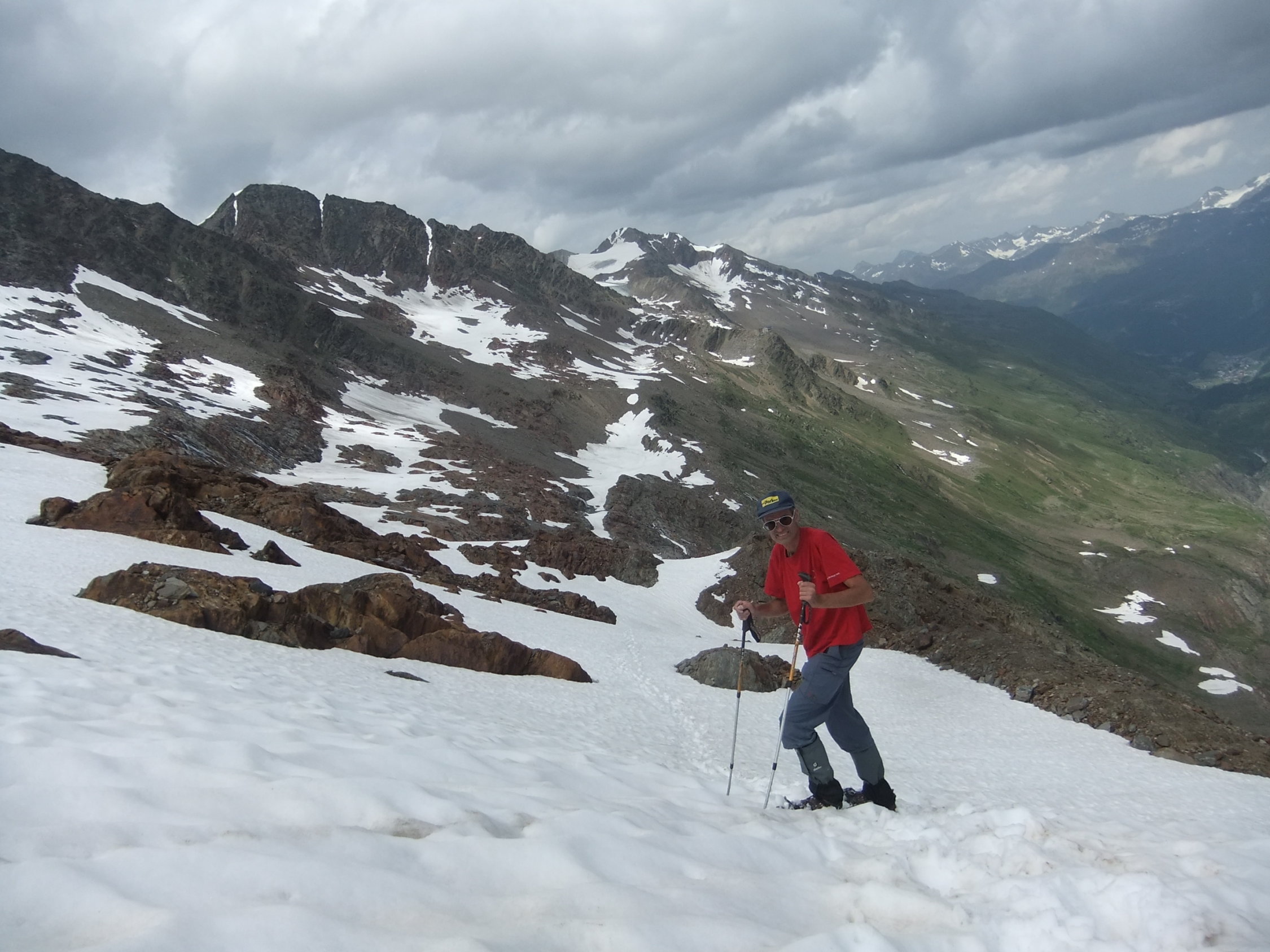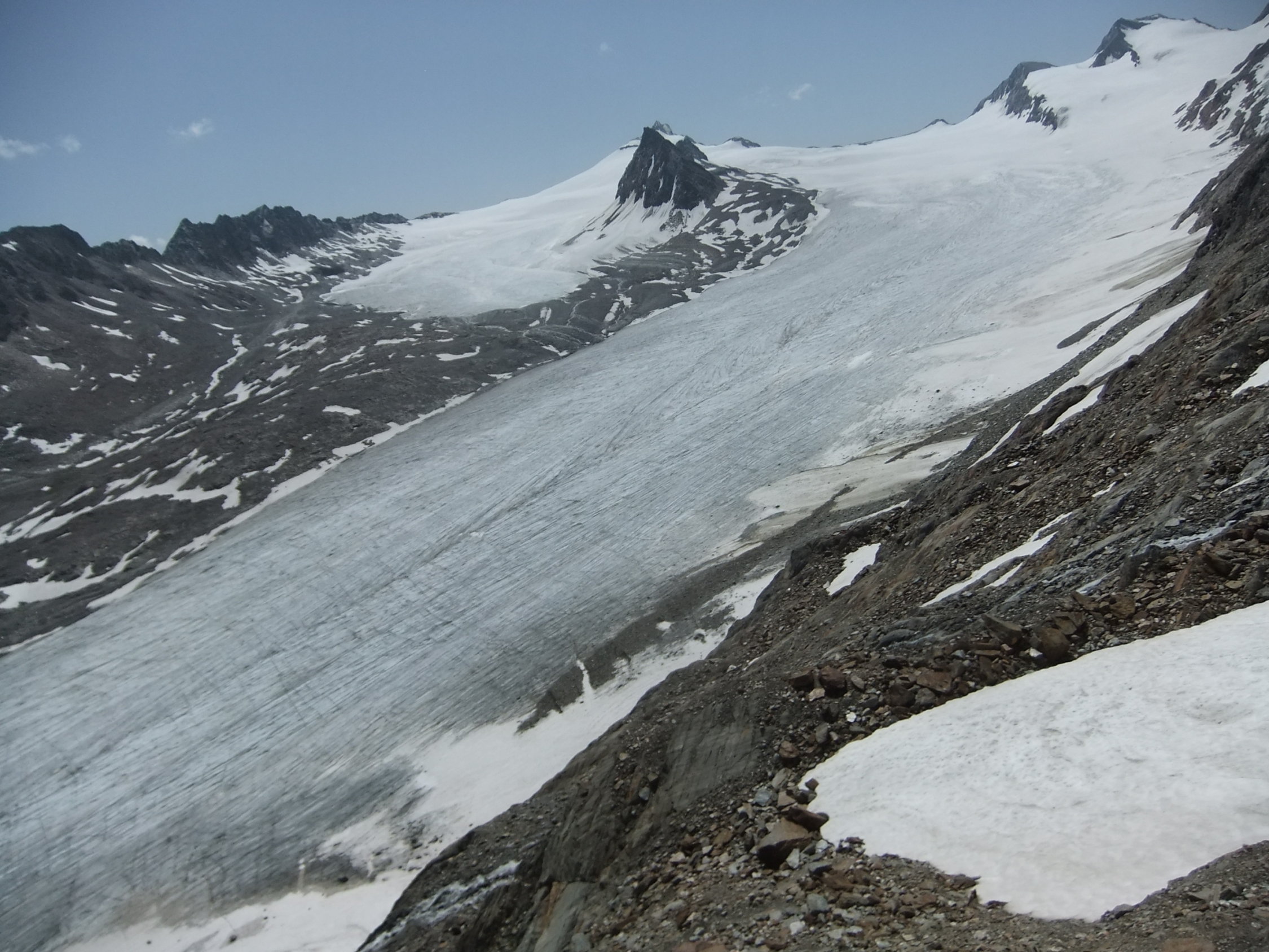 Sehr warmes Wetter auch nachts, so daß auf dem Ferner weicher Trittschnee herrschte, bis auf einige apere Stellen, so daß der Pickel nicht zum Einsatz kam. SO-Grat schneefrei. Nordgrat verwächtet, aber westseitig gut gangbar. Das Bruch- u. Schuttgelände lud mich nicht gerade ein, über den Grat zum Firmisanjoch zu turnen, zumal die Zeit auch fortgeschritten war. Darum stieg ich am Ende verfirnten Nordgrats über das oben steile Schneefeld ab zu den Ferner-Felsbänken.