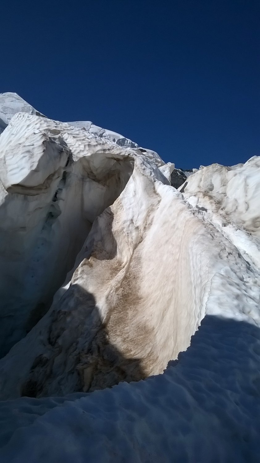 Im flachen Bereich ab Furcla d'Arlas 3083m bzw. Fuorcla Trovat 3019m weist der Persgletscher grössere Wasserpfützen auf, die über Nacht nicht gefrieren. Im Bereich 3250m .. 3600m sind grosse Spalten vorhanden, die nur noch auf dünnen Schneebrücken passiert werden können. Entsprechend muss die Seilhandhabung sein, damit ein Sturz sofort aufgefangen werden kann. In wenigen Tagen ab heute (24.07.2015) wird die Normalroute ohne technische Mittel (Leitern, Brücken) nicht mehr machbar sein .
