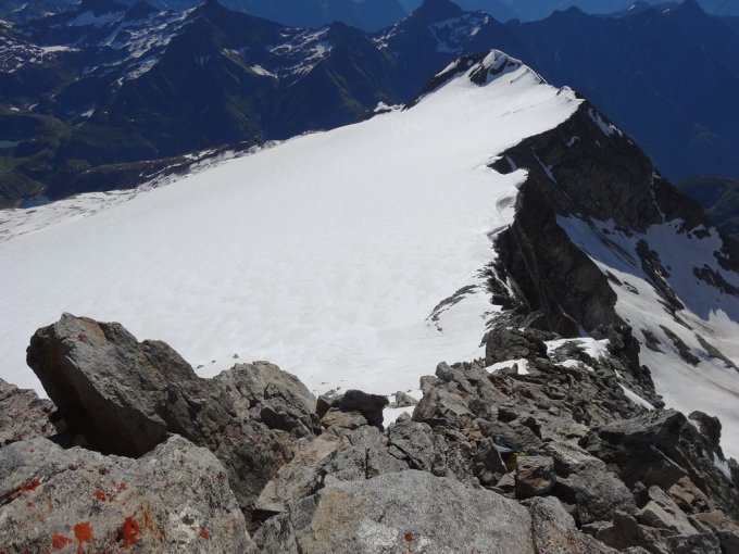 Gletscher gut eingeschneit und Schnee ist tragend. Für Gratzustieg und Grat Steigeisen erforderlich. Im unteren Teil ist das Queren der Bäche problematisch wegen nicht mehr tragender Schneebrücken und hoher Wasserführung