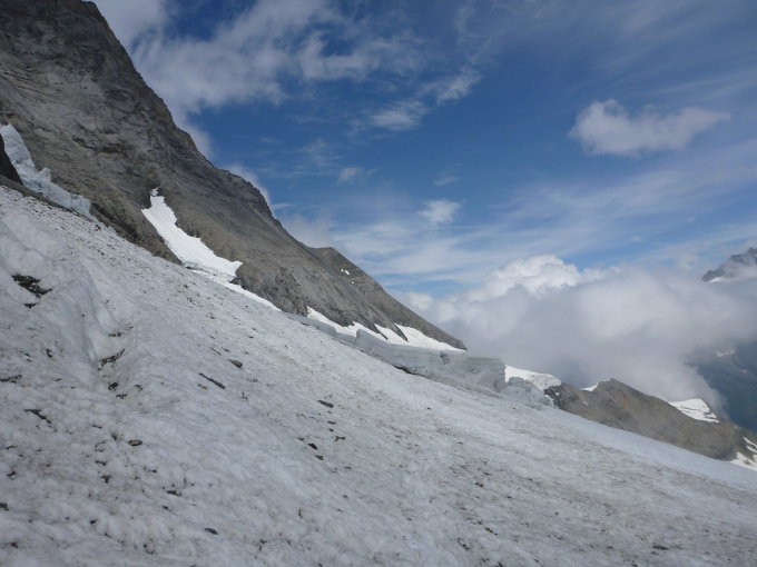 Heute ausgezeichnete Verhältnisse. Bergschrund auf dem Hüttenweg zu Beginn der Felsflanke öffnet sich langsam ist aber momentan noch gut machbar.