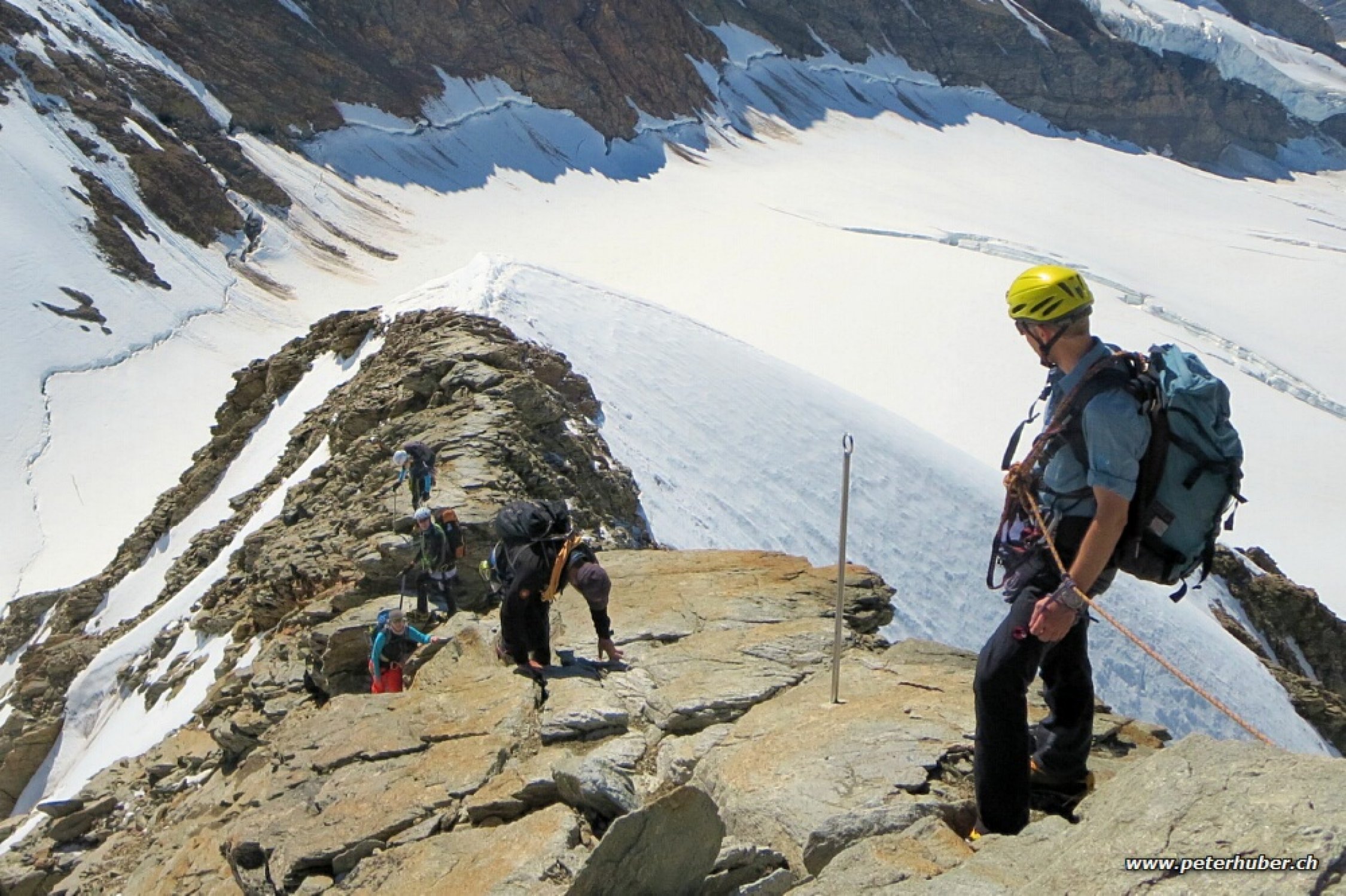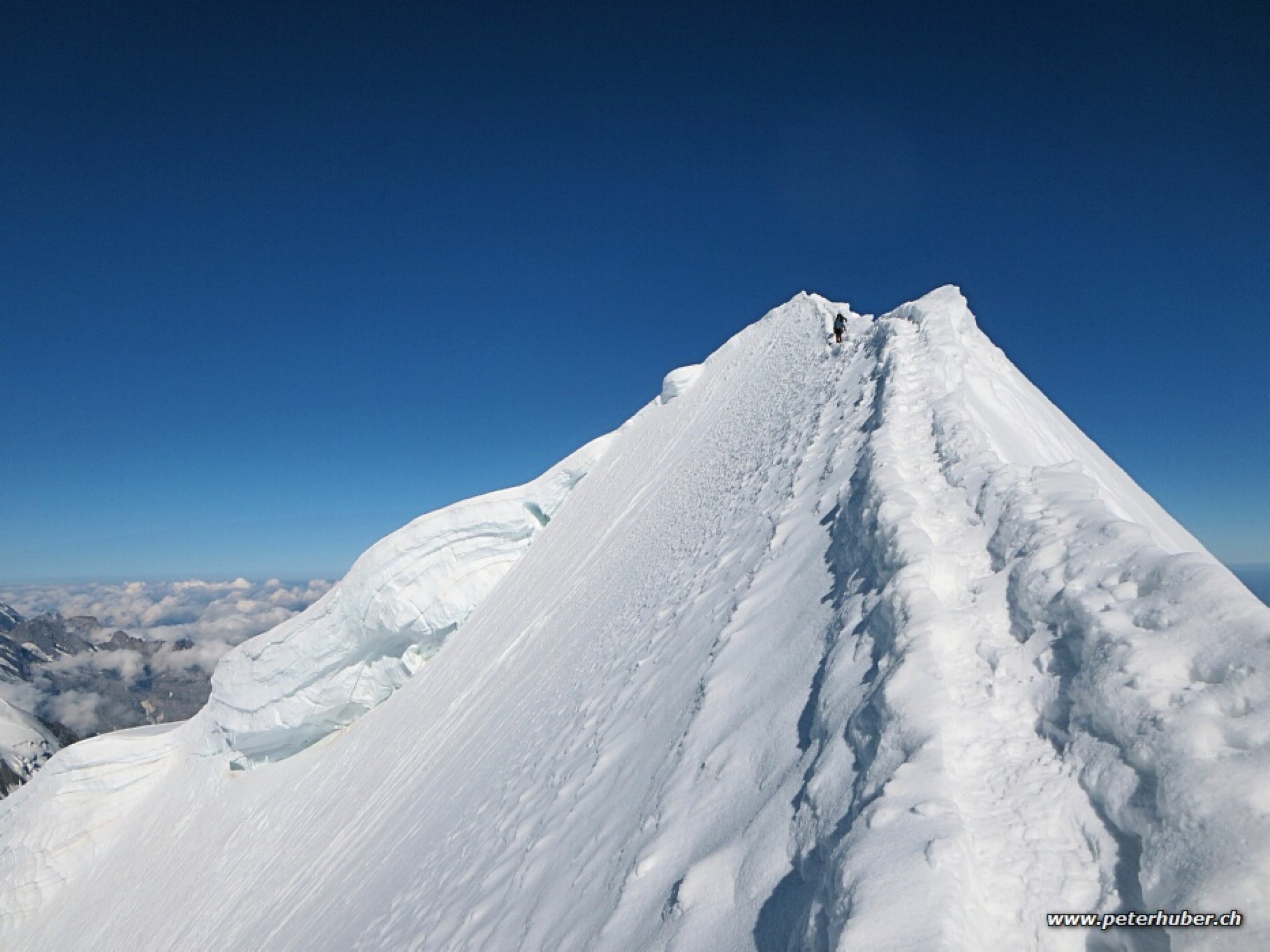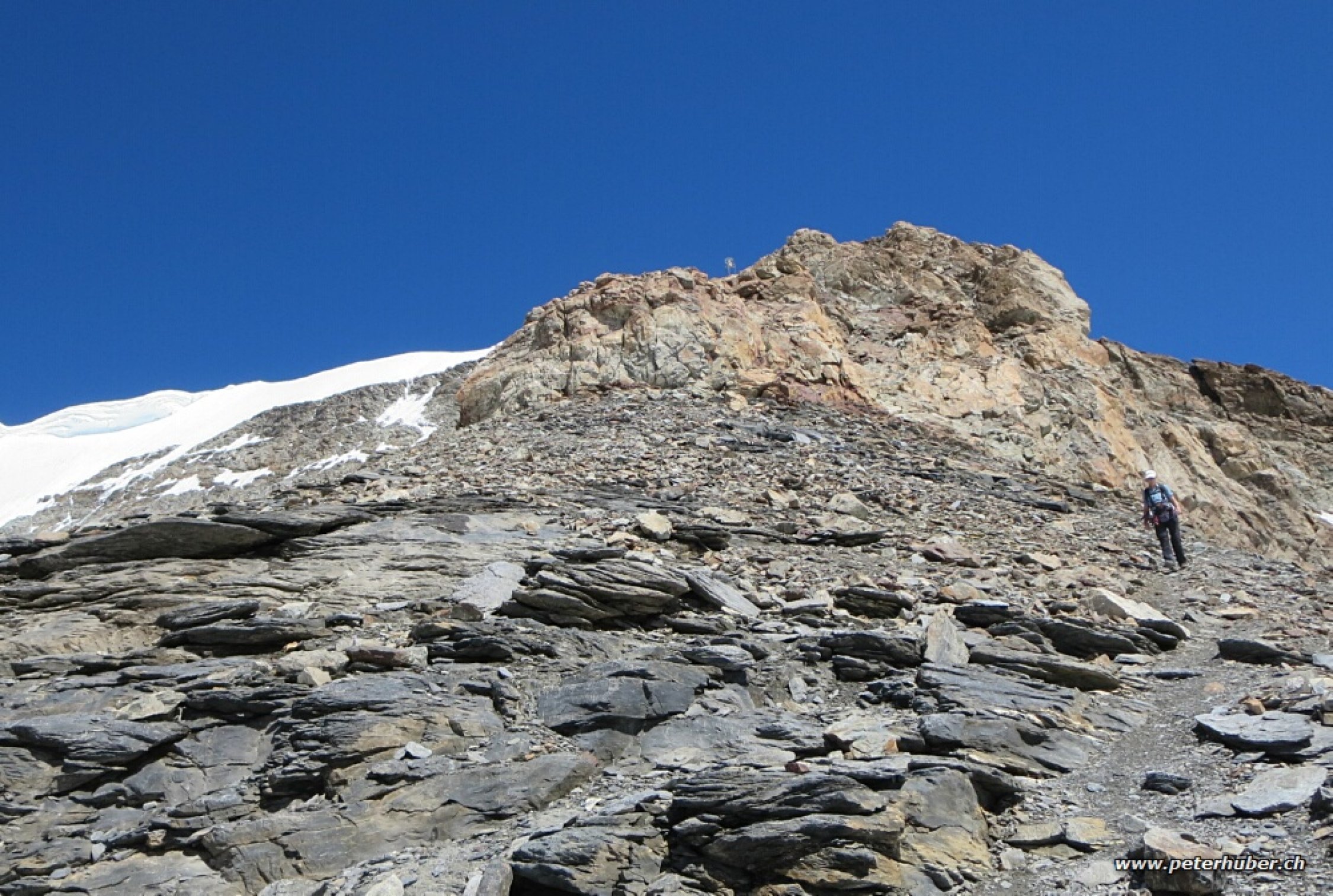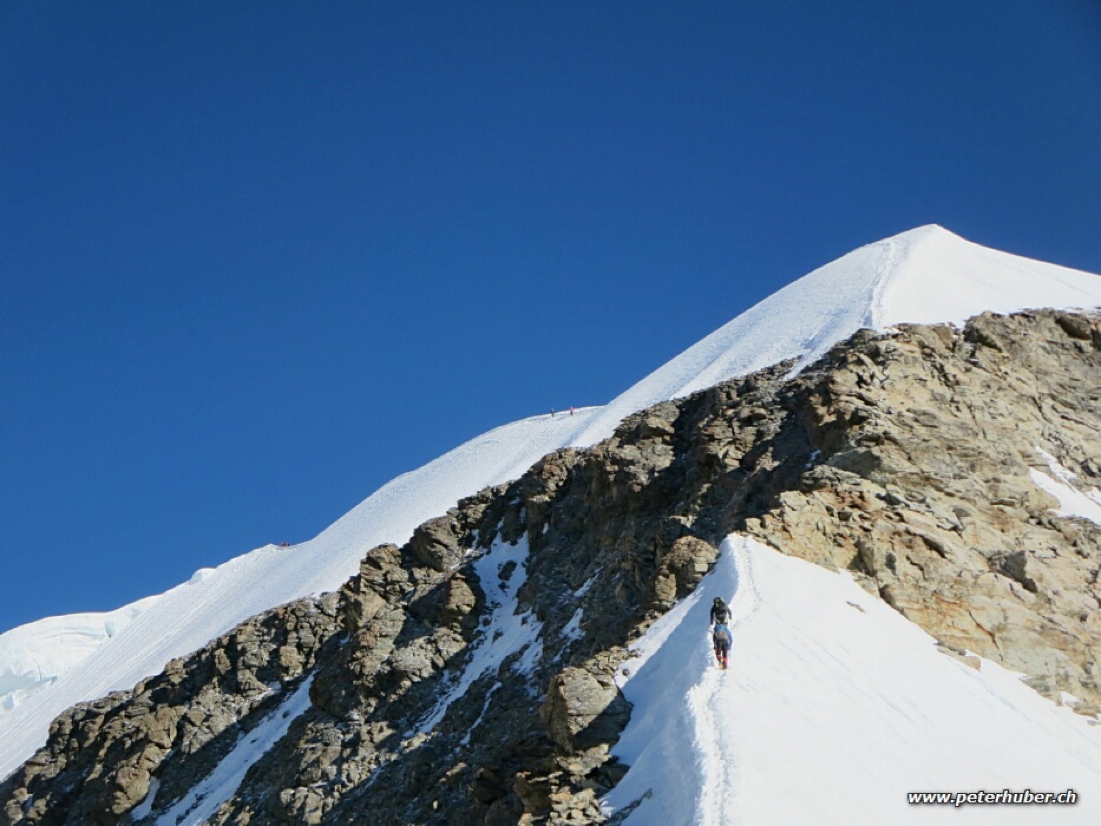 In der Nacht hat es geregnet. Der Schnee war mit einer harten Eisschicht überzogen. Auf den Felsen lag stellenweise Klareis. Mit der Sonne ging es schnell weg. Übrige Felsen trocken. Im Schnee hat es eine gute Spur, guter Trittschnee. Am Gipfelgrat hat es zwei kurze schmale Stellen im Schnee - Tirttsicherheit ist gefragt. Auf dem Abstieg um ca. 10 Uhr war der Schnee unten schon starkt aufgeweicht.