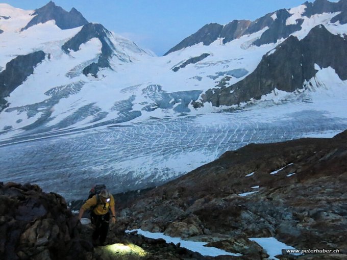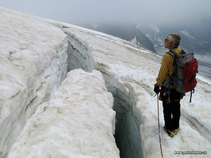 Schönes, sehr warmes Wetter. Der Gletscher unterhalb des Frühstücksplatz ist recht blank und hat etliche kleinere Spalten, die umgangen werden müssen. Querung oberhalb des Frühstücksplatz etwas heikel - Randspalte und hartes Eis. Oberhalb des Hugisattels nur noch wenig Firn in der Flanke - wir sind dennoch mit Steigeisen geklettert. Der Fels ist tocken und angenehm warm.