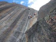 Zufällig haben wir an diesem Tage die Erschliesser dieser Route, Claude und Yves Remy, vor uns angetroffen, welche noch zusätzlich nachrüsteten. Pro Seillänge hat es im Schnitt nun ca. 2 Bolts mehr, die alten vorhandenen Bolts wurden belassen. Sie haben hierbei die Plaisir-Variante rechts der Crux-Seillänge 7 nachgerüstet. Den Stand nach der 1.Seillänge haben die Remy's ca. 5 m nach rechts unten versetzt.