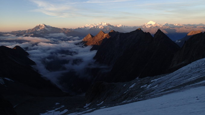 Anhaltend trockenes und warmes Wetter beschleunigt Vereisung des Firns unterhalb der Westgratkuppe P.3719m und macht allenfalls Schraubeneinsatz notwendig.