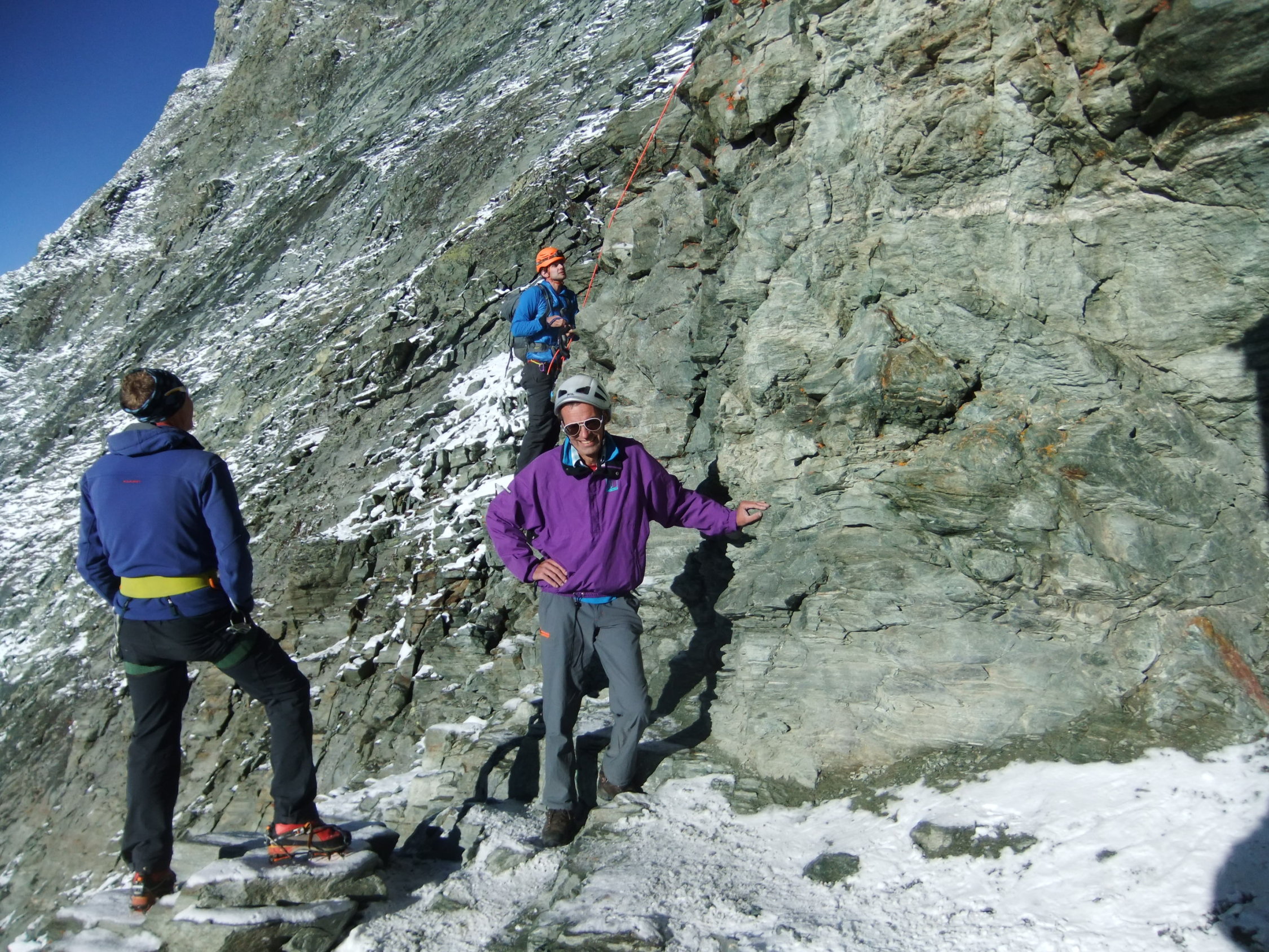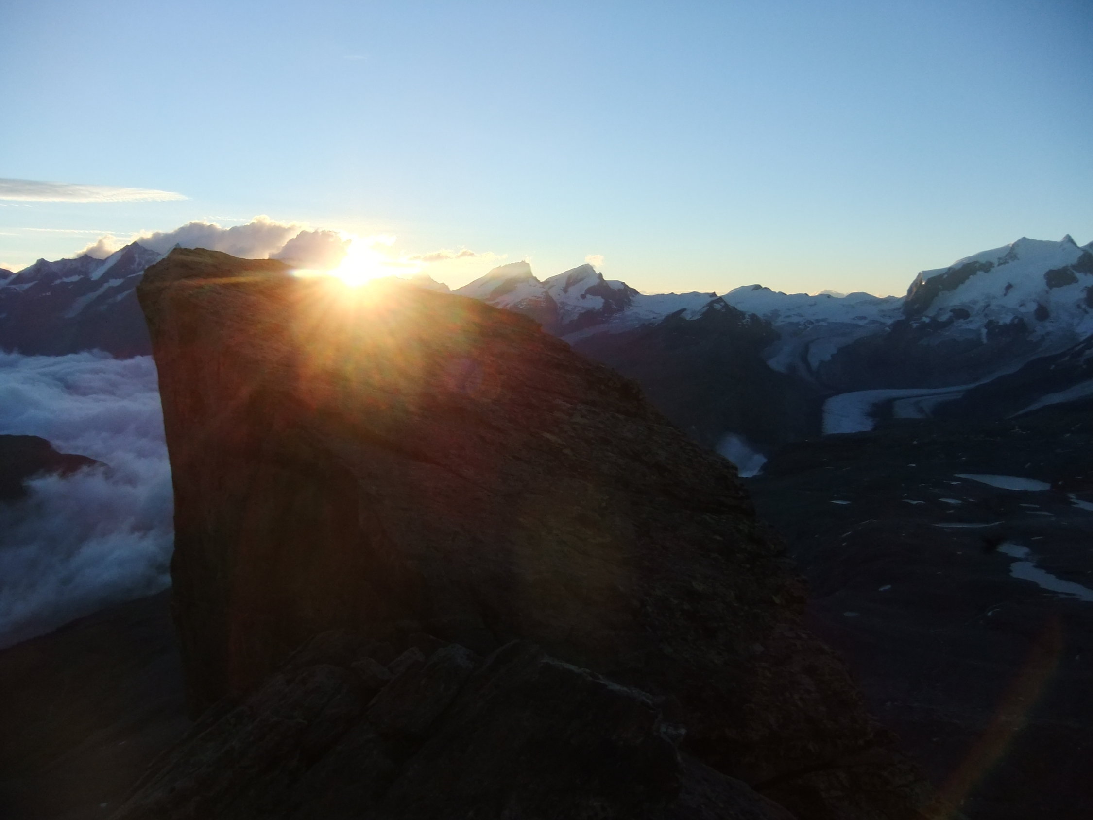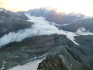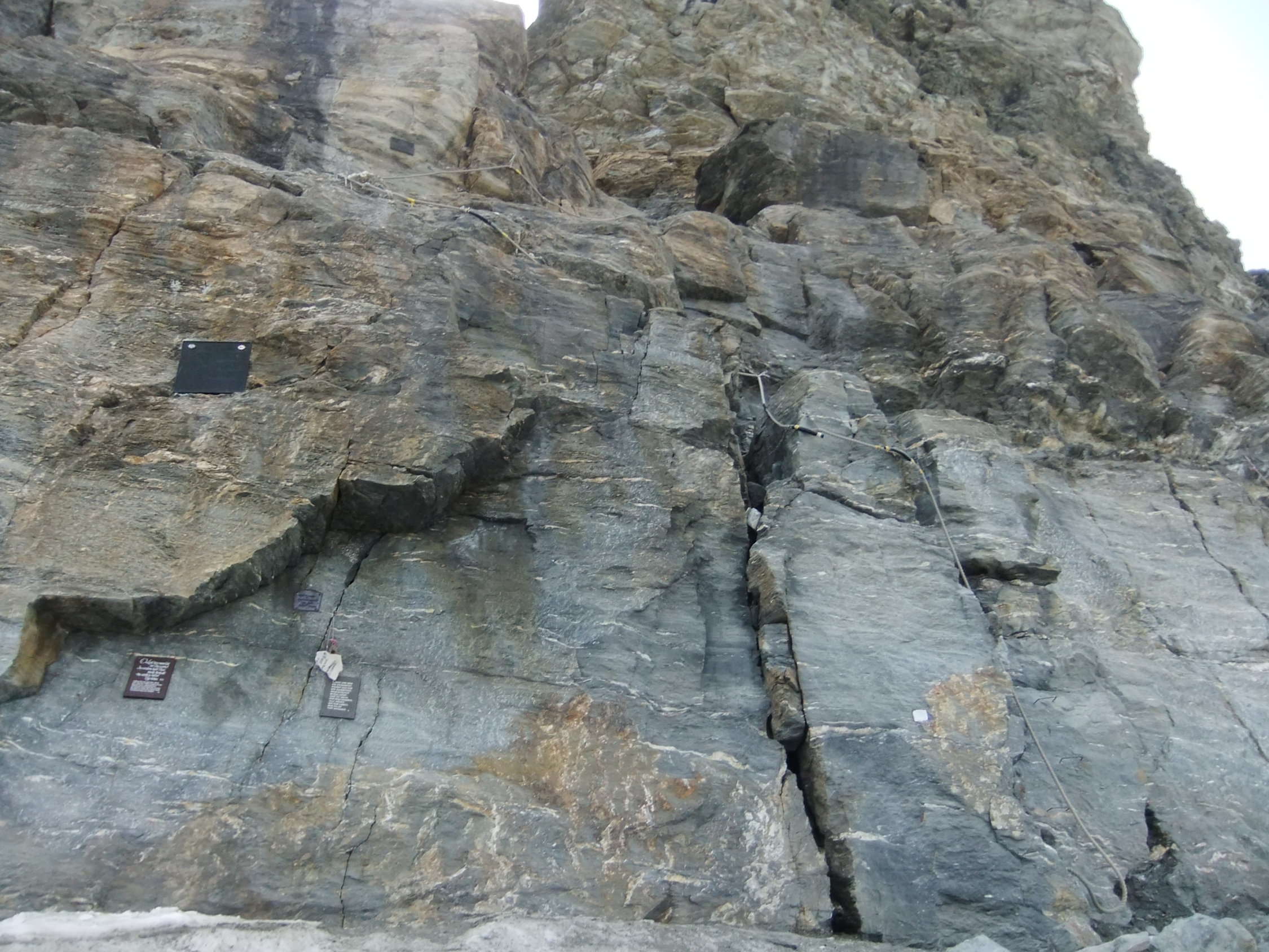 Am Sonntagabend begann es zu nieseln bis in den frühen Morgen. Die neue Holzterrasse der Hörnli-Hütte war leicht angefroren. Ebenso die neue Treppe zum Zustieg des Bergs hinterm Haus. Ab ca. 3600 m war der Berg frisch eingeweißt durch leichte Grieselauflage, die im unteren und südlichen Bereich mit Zunahme der Sonneneinwirkung zum Mittag verschwand. Der Fels war zum Klettern jedoch trocken und nicht vereist. Zumindest bis zur Solvay-Hütte. Allerdings herrschte starker Wind am Morgen bis zu 50 km/h. Dabei gab’s noch stärkere Böen dazu. Wenn solch Wind nicht wäre, sind derzeitig die Kletterbedingungen fast schon ideal. Bei den Wetterprognosen sollte man darum auch immer zu den Angaben über die Windböen schauen. Wegen Windböen bis zu 90 Km/h brachen die Bergführer die Tour ab. Denen schloß ich mich an, auch wenn die Engländer weiter stiegen.