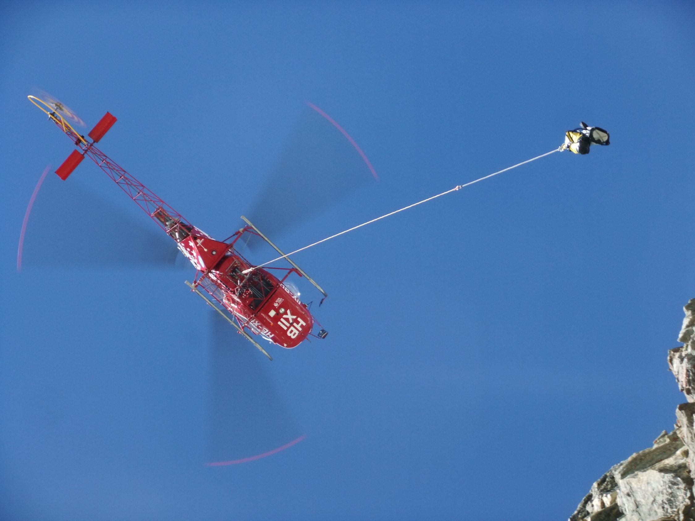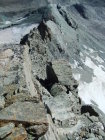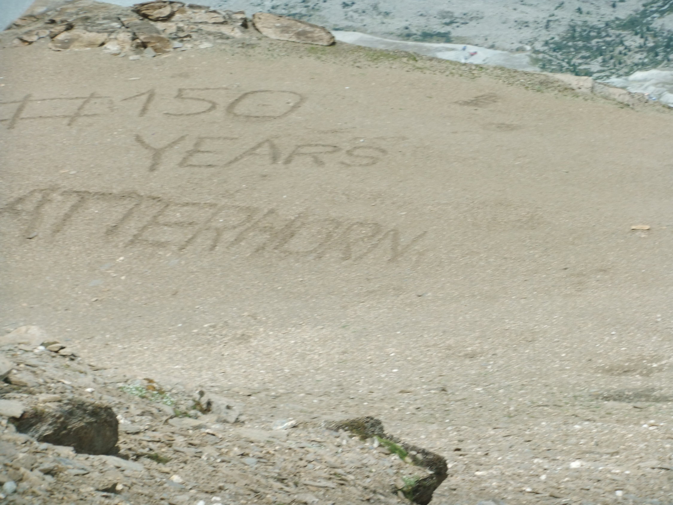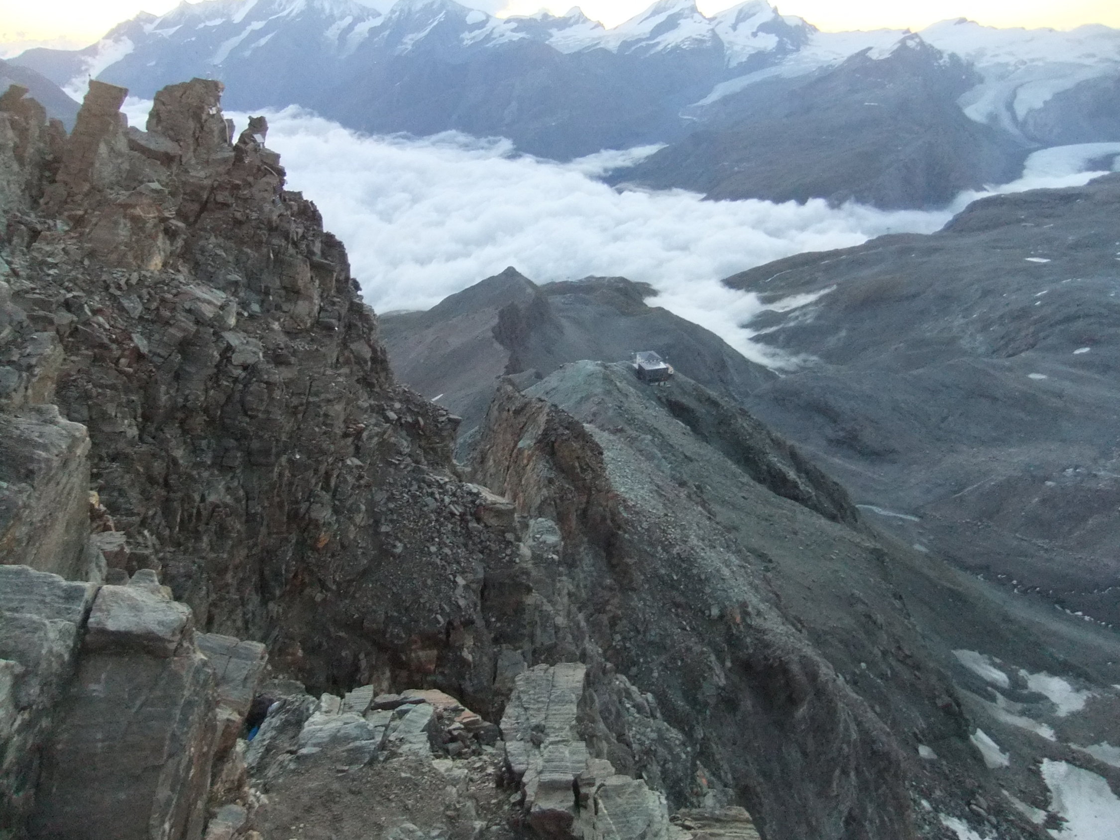 Bereit gestelltes Frühstück gibt es ab 03:30 Uhr (ohne Personal). Früheste Startzeit: nicht vor 03:50 Uhr. Beim „Einchecken“ wurde ich am Vortag freundlich darauf hingewiesen, daß man (wie ich ohne Bergführer) den Gruppen mit Bergführern beim Tourenbeginn die „Vorfahrt“ geben möchte. Dem konnte ich problemlos zustimmen, da ich eh nicht vorhatte, im Dunkeln zu klettern. Aktuelle Wetterentwicklung trägt wohl meist sowieso dazu bei, das Thema zu entschärfen. Ca. 26 Bergsteiger starteten heute morgen. Wegen dem Nieselwetter gingen die Bergführer auch erst weit nach 4:00 Uhr los. Ich lief erst mit dem Morgengrauen nach 05:00 Uhr los, da ich kein Freund des Felskletterns im Dunkeln bin. Nach einem Drittel überholten mich 2 englische 2er-Seilschaften, die offensichtlich auch lieber bei Tageslicht klettern, aber dann mit „Vollgas“, und zudem offensichtlich gar keine Orientierungsprobleme hatten und obendrein zügig durchkletterten. Ich hängte mich in deren „Windschatten“ und erreichte die Solvay-Hütte um 07:30 Uhr. An der Mosley-Platte direkt unter dem Biwak war Stau, weil die Bergführer mit dem Abseilen begannen. Sie hatten entschieden, wegen den Windböen-Verhältnissen nicht mehr weiterzulaufen. Die Engländer stiegen weiter hoch. Doch als Fliegengewichtler ohne Seilsicherung lege ich mich nicht mit den Windböen an und entschloß mich ohne lange zu fackeln, umzukehren. So packte ich dann mein Halbseil aus zum Abseilen. Der obere Abschnitt läßt dies zu mit diversen T-Ankern, Schweineschwänzen, Stangen und Karabiner-Haken. Auch über kürzere Strecken (15 m). Nach mir folgten noch 6 weitere Seilschaften wieder hinab. Ankunft an der Hörnli-Hütte um 11:15 Uhr.