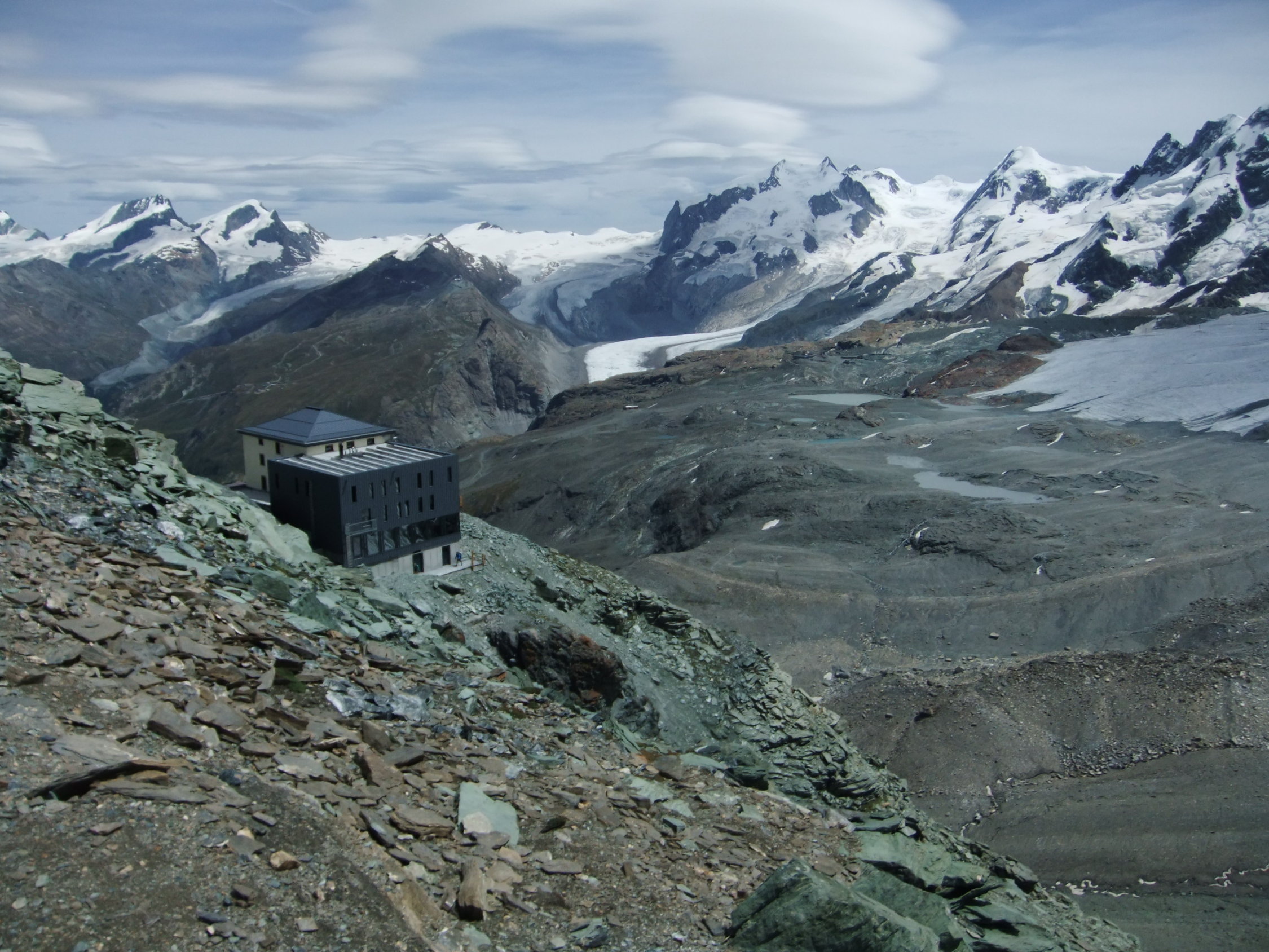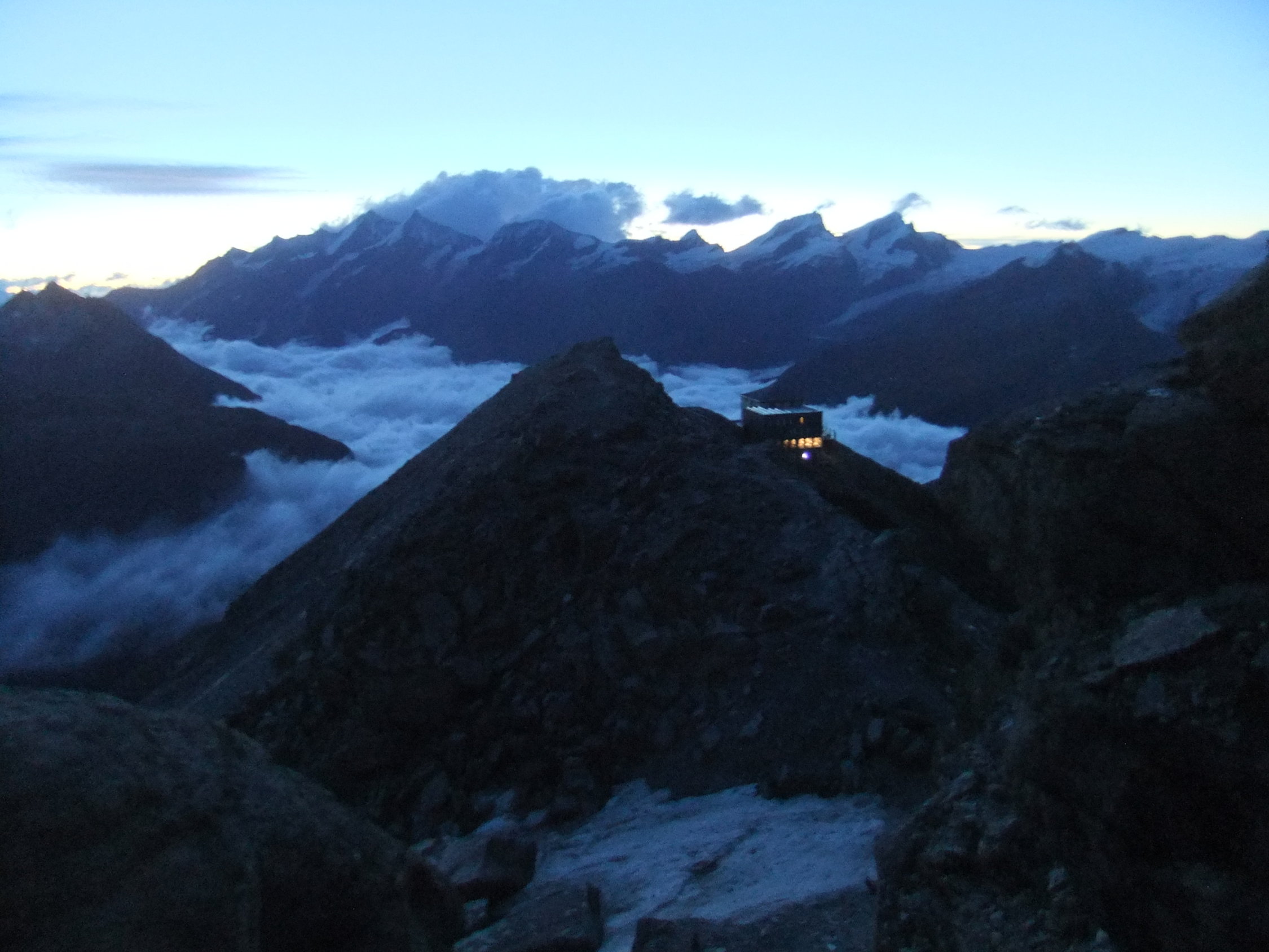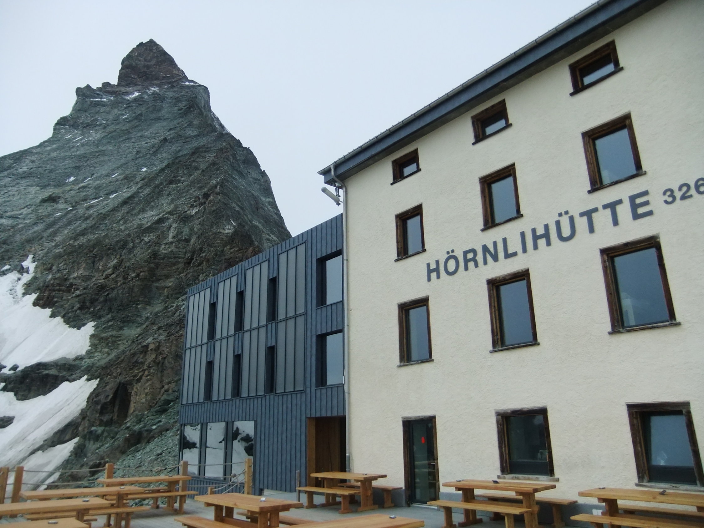Der neue Anbau an alte Hörnli-Hütte ist seit Juli in Betrieb. Er bietet ungewohnt praktischen Komfort in dieser Höhe. In ihr friert man nicht. Die Fensterfront und die Beleuchtungstafeln sind gut abgestimmt mit den Sitzgarnituren aus Holz. Auf der Westseite sollte der mittlere Regenspeier verlängert werden, von dem es von neuem Anbauflachdach auf den Zustiegsweg zum Berg hinabströmt und diesen vereist bei Frosttemperaturen. Lobenswert sind die Doppelstock-Betten in kleinen Räumen, so daß nicht das „Matratzen-Lager-Ambiente“ aufkommt. Die Logistik ist gut aufgestellt. Das Abend-Essen ist sehr gut. Die Engländer holten sich Nachschlag. Lediglich das Frühstück für die Bergsteiger ist etwas rar. Die letzten 4 (zu denen ich auch gehörte) bekamen kein Brot mehr ab. Dafür zog ich mir die Joghurts rein, welche von den anderen verschmäht wurden (keine Ahnung warum). Preis für eine Übernachtung mit Abendessen und Frühstück für AV-Mitglieder: CHF 137,50 zzgl. Kurtaxe CHF 2,50. Preis für Berg- u. Talfahrt mit der Luftseilbahn Zermatt-Schwarzsee: CHF 50,00 (ohne Ermäßigung), Preis für den Shuttle-Zug von Täsch nach Zermatt und retour. CHF: 16,40. Preis für 2 Tage PKW im Parkhaus am Bahnhof von Täsch: CHF 26,00 (Stand 2015).