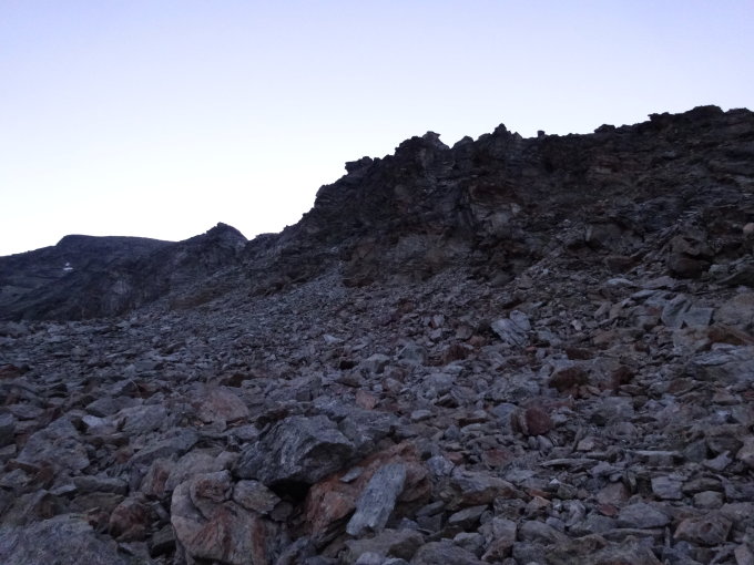 Die obere Schuttflanke ist weitgehend kompakt und gut zu gehen. Trotzdem möglichst in Richtung Pkt. 3405 zielen, um den kompakten Gipfel-Grat möglichst schnell erreichen zu können, auf welchem dann der weitere Anstieg erfolgt. Im Verbindungsgrat einige IIer Kletterstellen, welche wenig ausgesetzt und weitgehend übersichtlich sind.