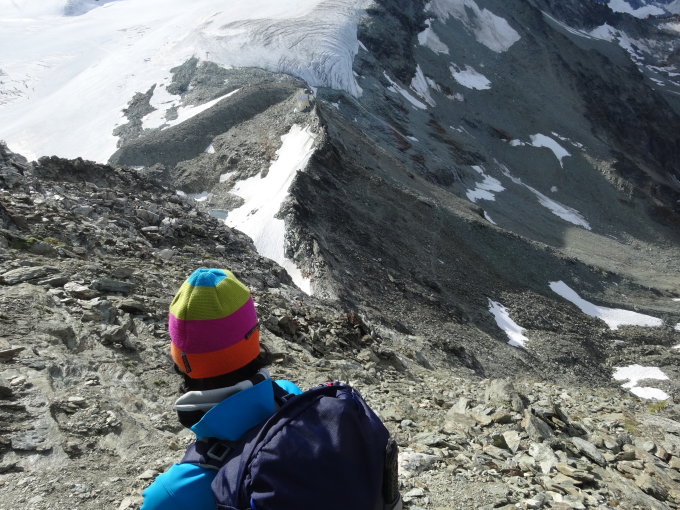 Der Verbindungsgrat zwischen den beiden Gipfeln ist derzeit komplett schneefrei, bzw. Restschneeflächen können problemlos umgangen werden. Dürfte zu Beginn der Saison mit Firngrat und Wechten, sowie den IIer Kletterstellen mit Steigeisen deutlich heikler zu gehen sein.