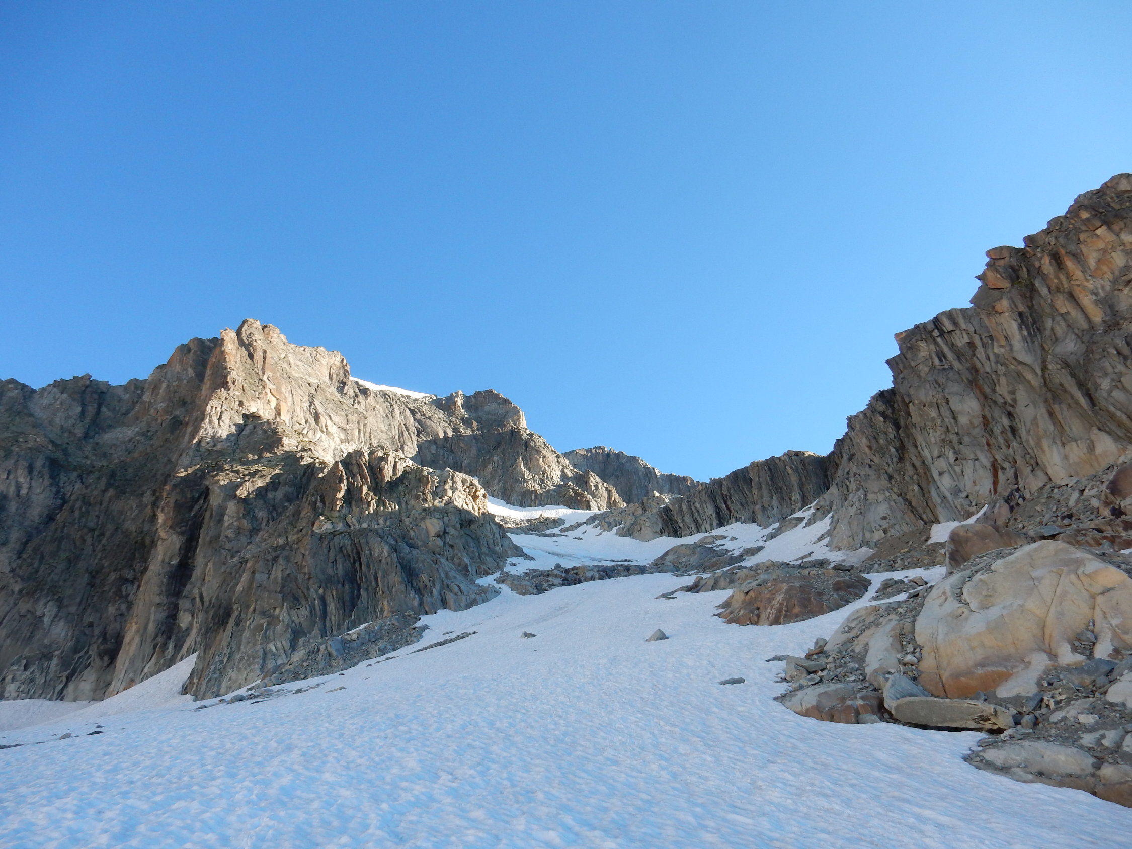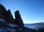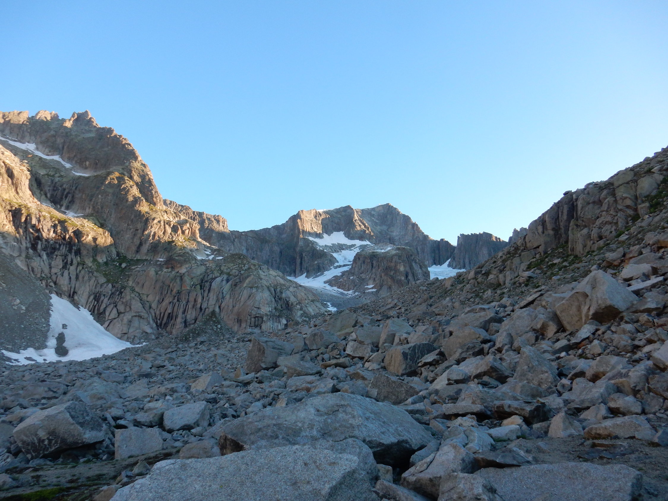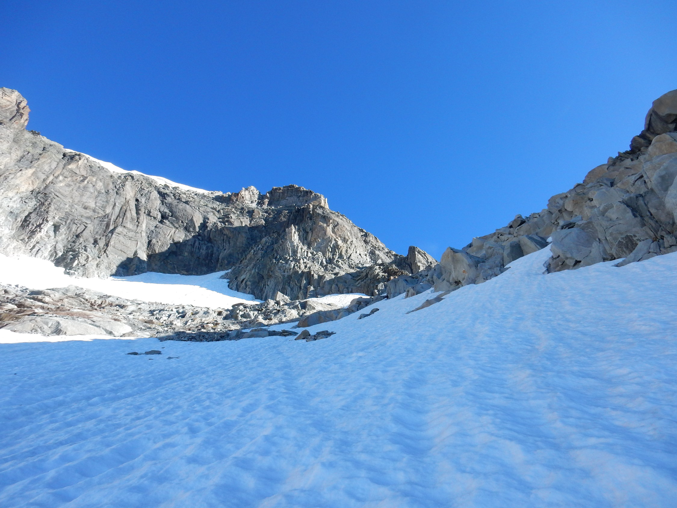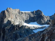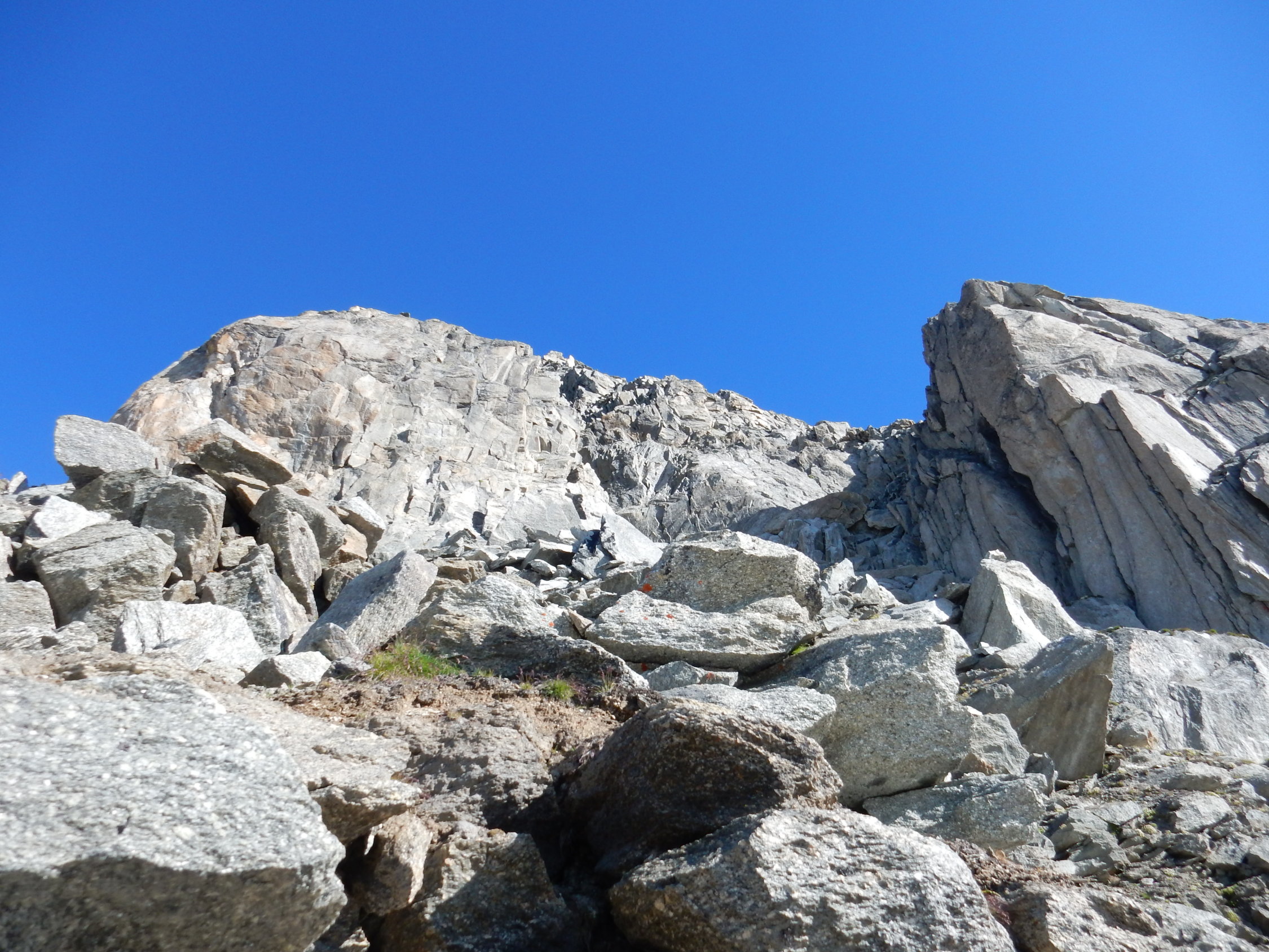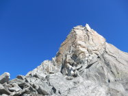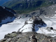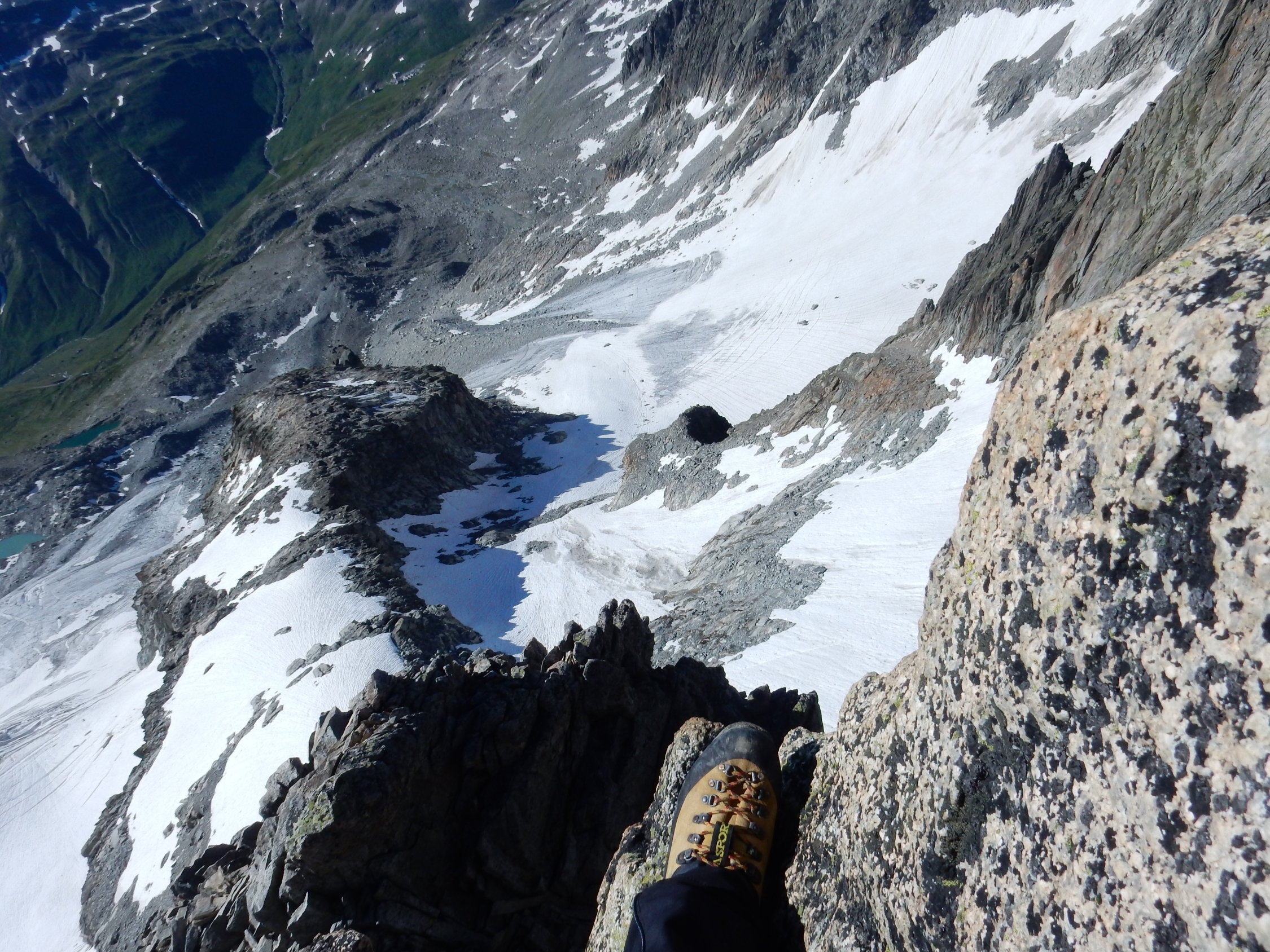War aber eigentlich nirgends kritisch, ausser bei der 1.Schlüsselpassage zu Beginn (noch nicht warm...) und bei der Ankunft an der Randkluft am Ende der Abseilpiste. Habe dort kurz meinen Halt verloren konnte mich aber mit der Pickelbremse wieder stoppen. Wäre dort ca. 30m in eine Geröllhalde gerutscht, hätte sicherlich einige Blessuren gegeben...!?