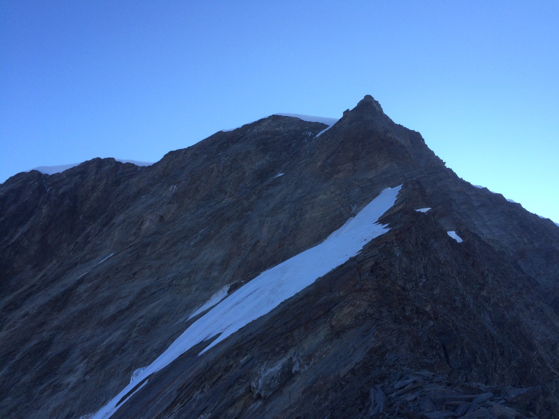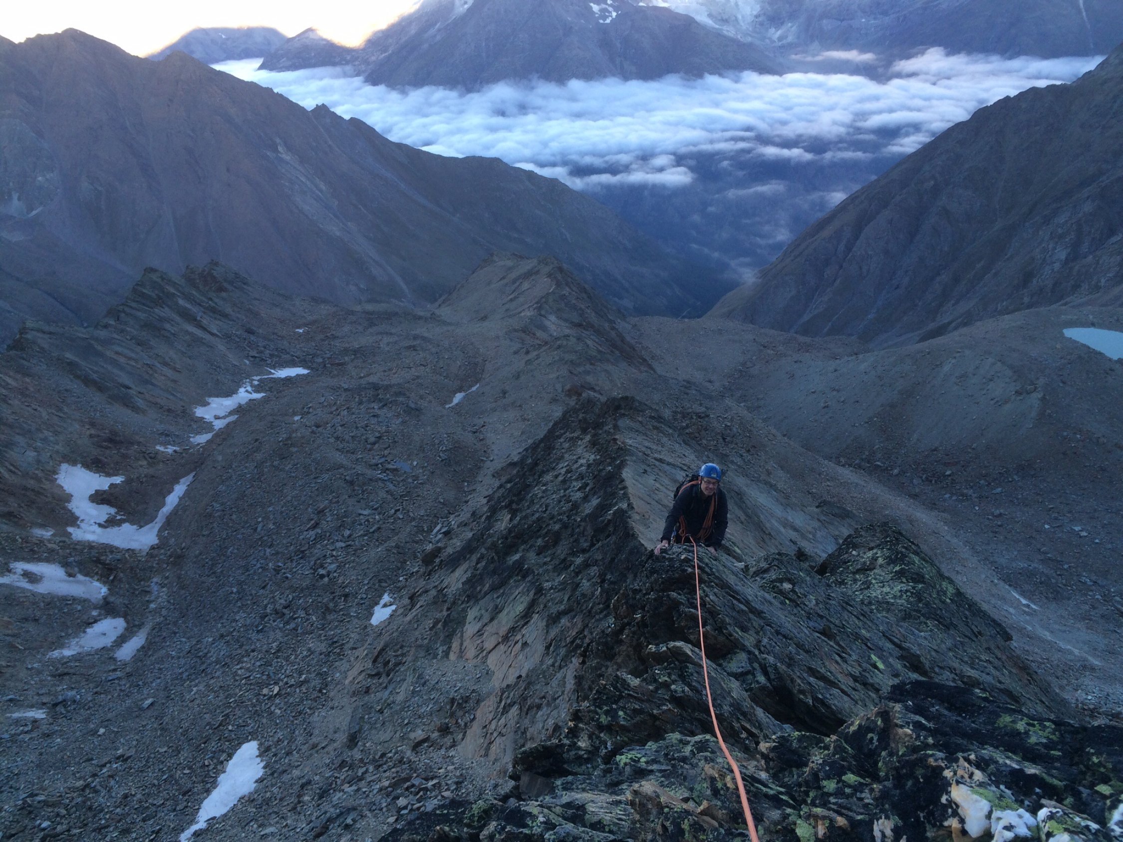 Absolute Top-Verhältnisse im Fels, keine Steigeisen nötig. Schneegrate im unteren Teil teilweise am ausapern. Die Tour ist relativ anhaltend in Schwierigkeitsgraden 3a bis 4a und wir haben uns ein paar Verhauer geleistet, was Zeit gekostet hat.