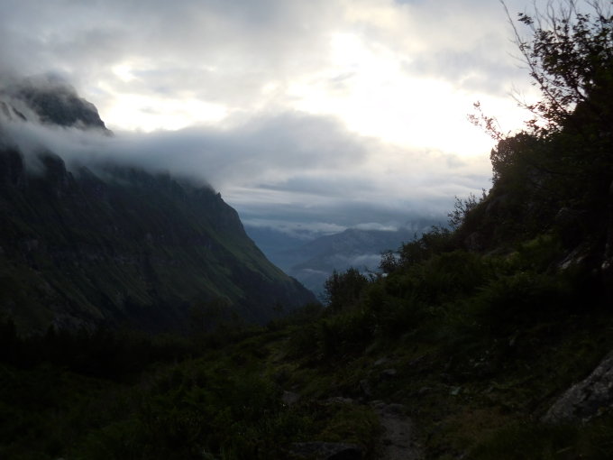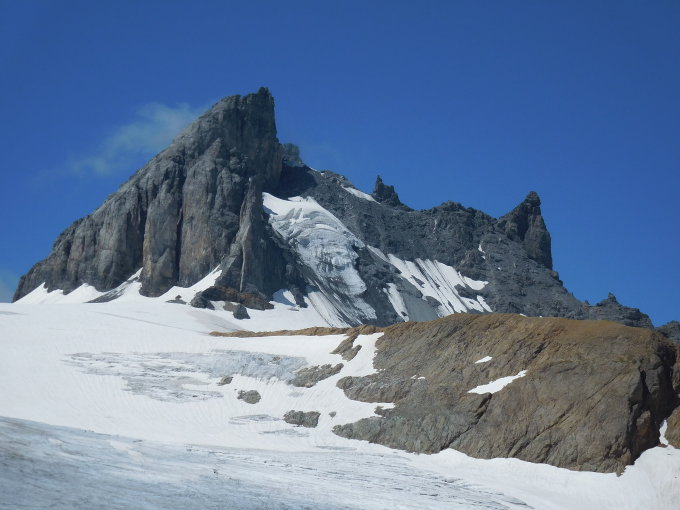 Start der Tour am 5.45 Uhr beim Bodenberg, bei bewölktem Wetter, entlag dem frisch gemähten Weg zur Kröntenhütte, der Weg zum Glatt Firn ist Blau-Weiss markiert, er war schon gut trocken, der Untereteil des Glatt Firns war schon blank, die Steigeisen waren da erforderlich, beim Gipfelgrat dann dichter Nebel, aber trotzdem gut zu finden dank Wegspuren bis zum Gipfelaufbau, für den Gipfelturm ist ein Seil erforderlich, die Schlüsselstelle der Tour sind die letzten 10 Meter zum Gipfelturm, durch einen sehr engen Kamin