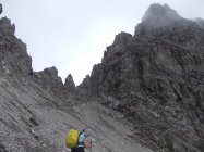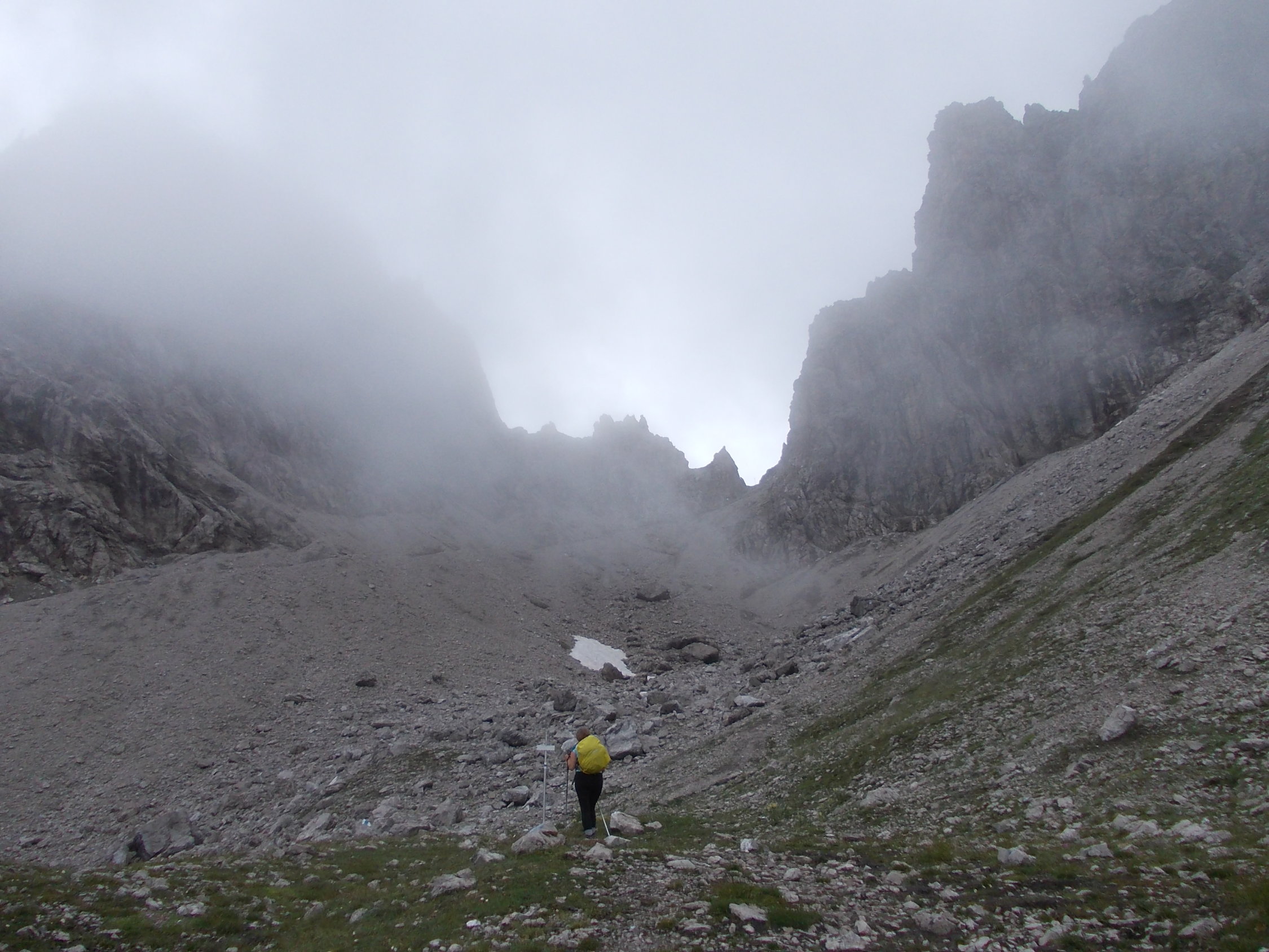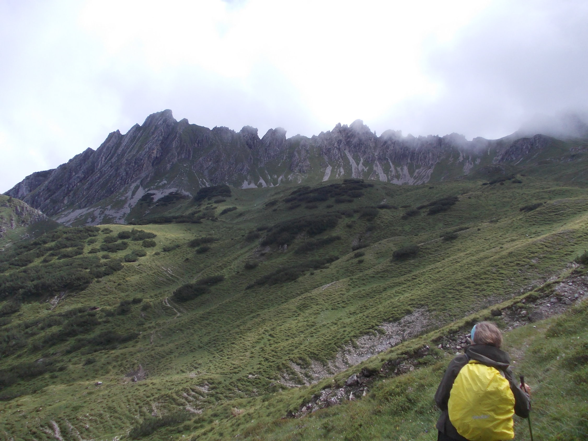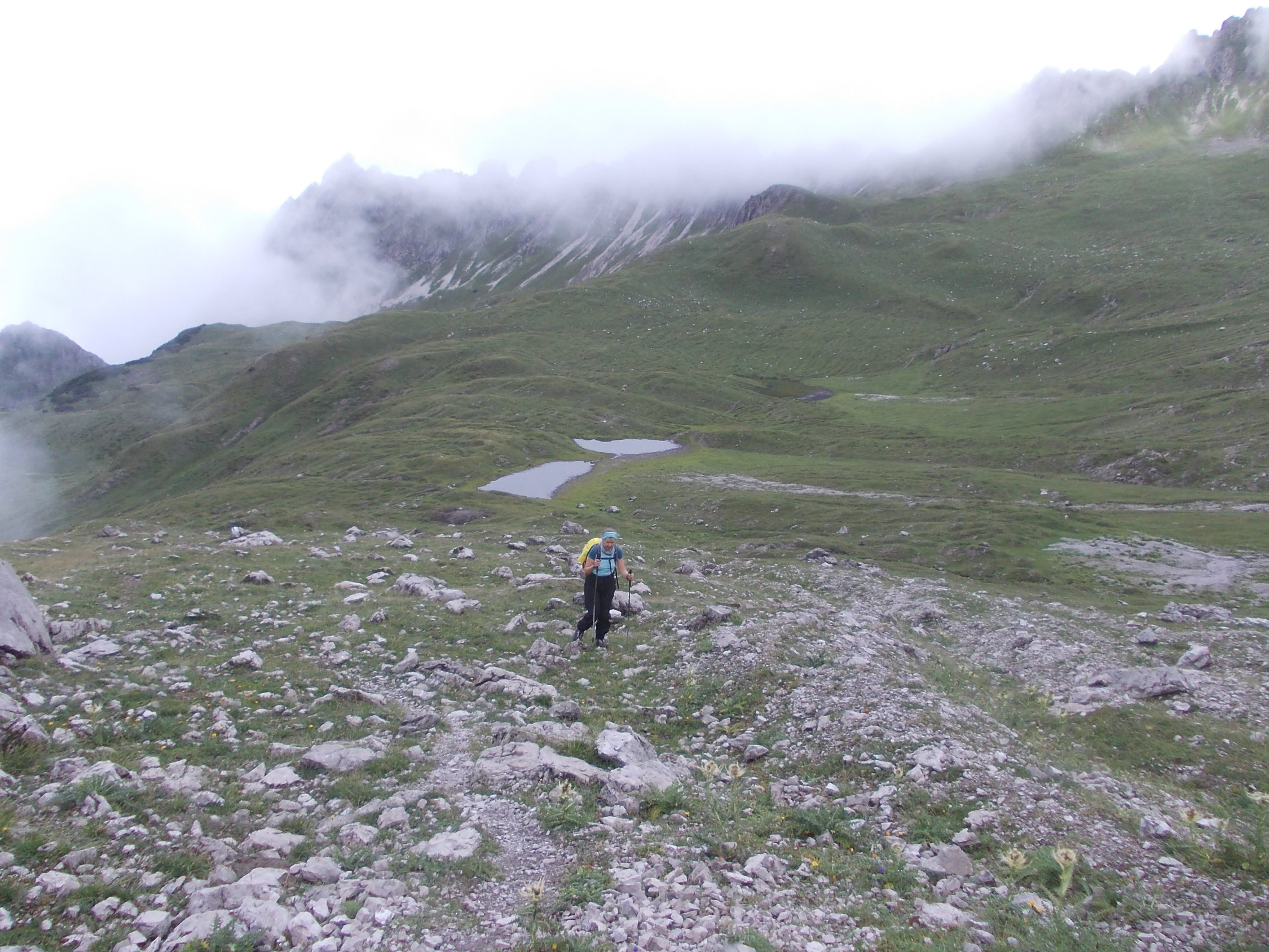 Morgens noch leichter Regen, danach nur zögerliche Bewölkungsauflösung aus dem vorhergehenden Frontendurchzug. Etwas unangenehm war die Begehung des grasig-erdigen Aufstiegspfades zum Zwölferjoch. Im Abstieg begangen, wäre diese Route heute nicht nur unbekömmlich, sondern auch gefährlich gewesen. Somit sind wir dem Wirt der Sarotlahütte sehr dankbar, dass wir aufgrund seines Anratens die Rundtour in der beschriebenen Richtung durchgeführt haben, und nicht etwa via Zwölferjoch, sondern übers Eiserne Törle wieder auf die Sarotlaseite zurückgekehrt sind.