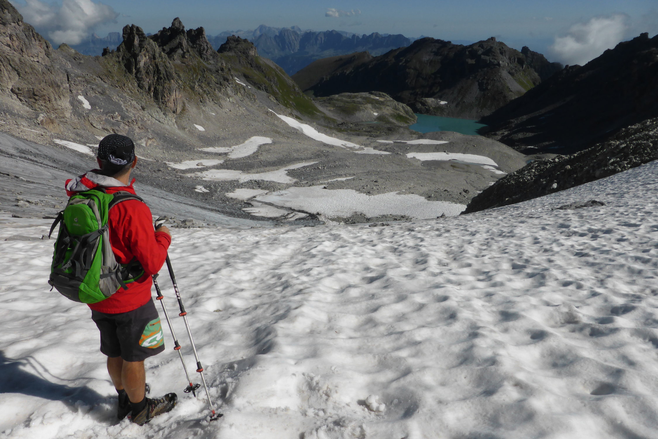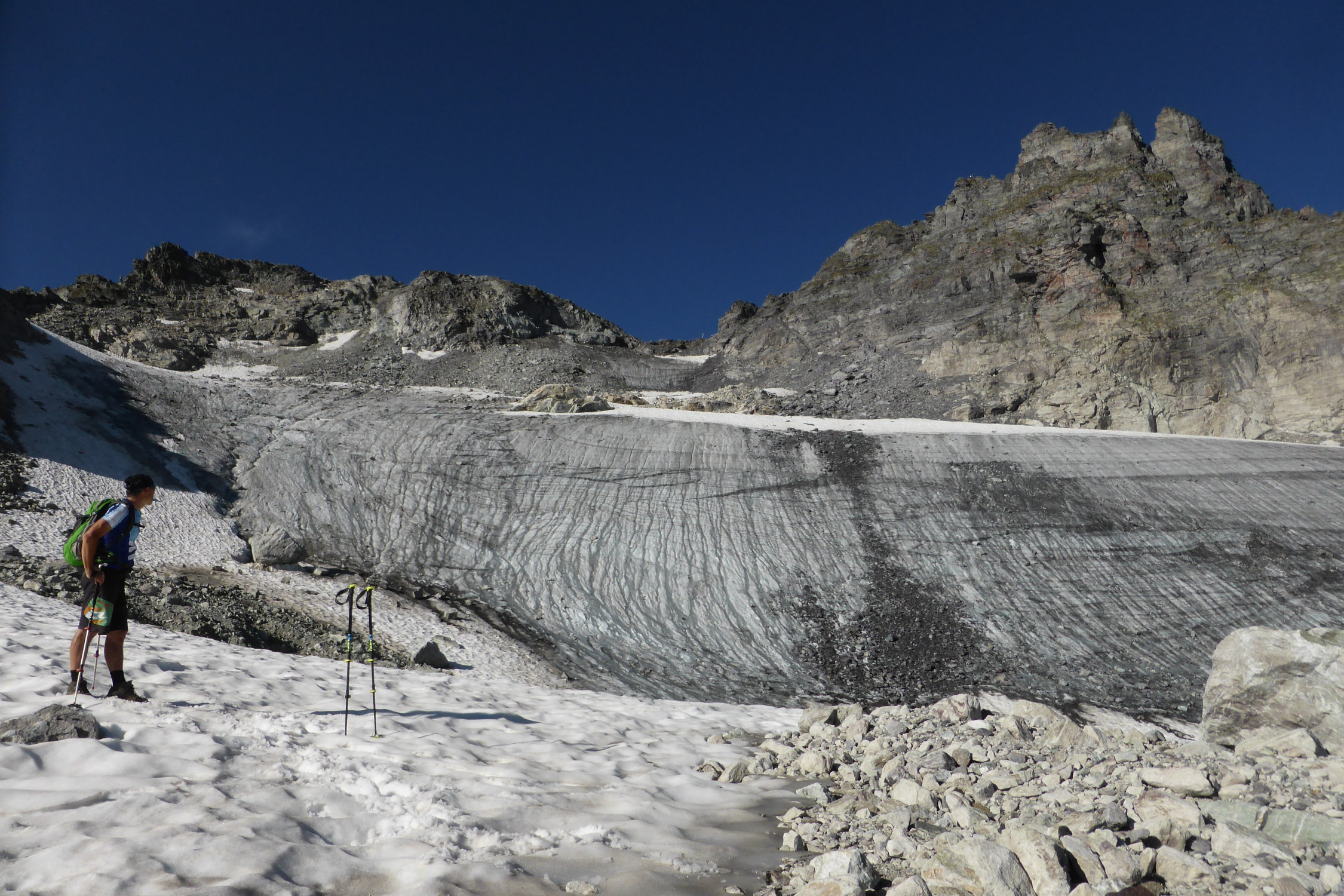Trocken und nur noch wenig Schnee auf dem Gletscher. Daher Steinschlag vom Grat auf den Gletscher, besser auf dem neuen Weg bleiben.