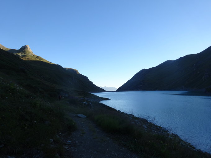 Der Abstieg erfolgt ebenfalls entlang einer weitgehend guten Spur. Im schuttigen Gelände kommt man schnell vorwärts. Danach folgt Wiesengelände.