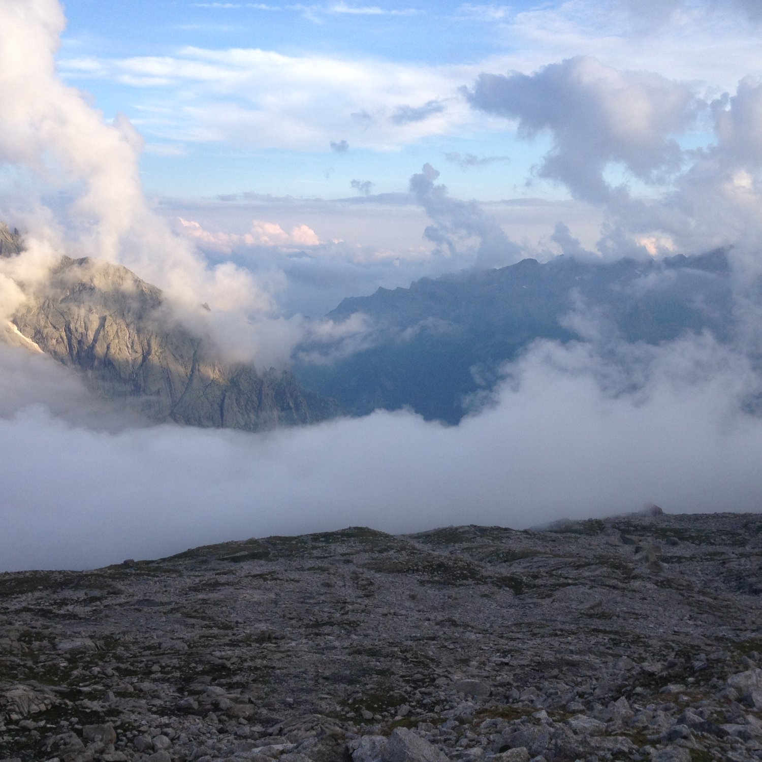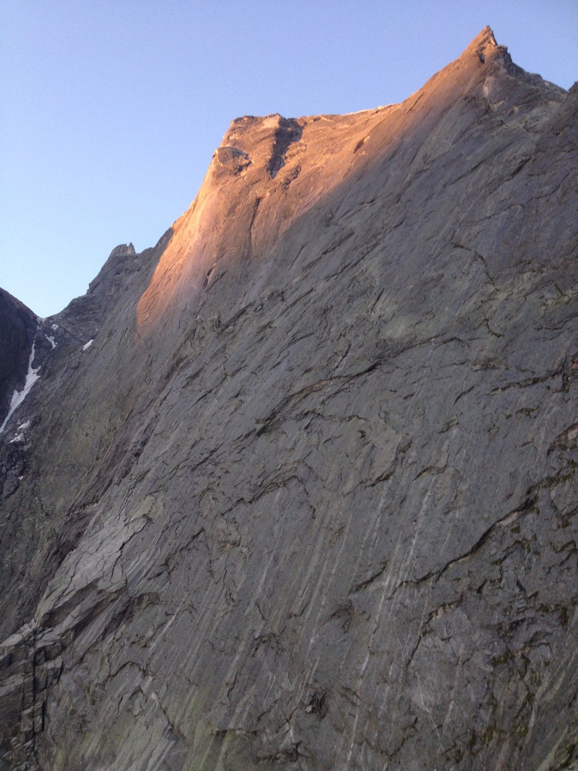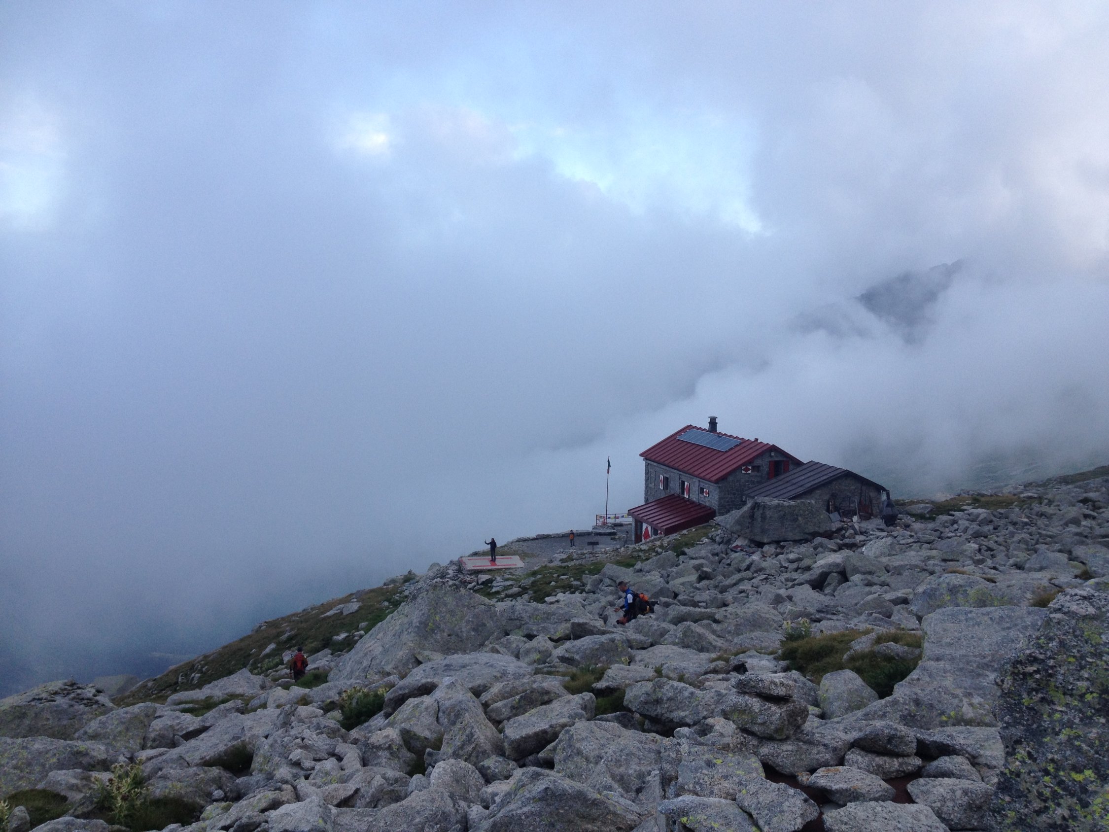 Nach den Regenfällen in der Nacht war die Nordost-Wand (Cassin) nass. Drei Seilschaften, die ursprünglich in die Nordost-Wand wollten, sind auf die Kante ausgewichen, nur eine (blitzschnelle, sehr geübte) Seilschaft ist die Cassin geklettert.