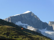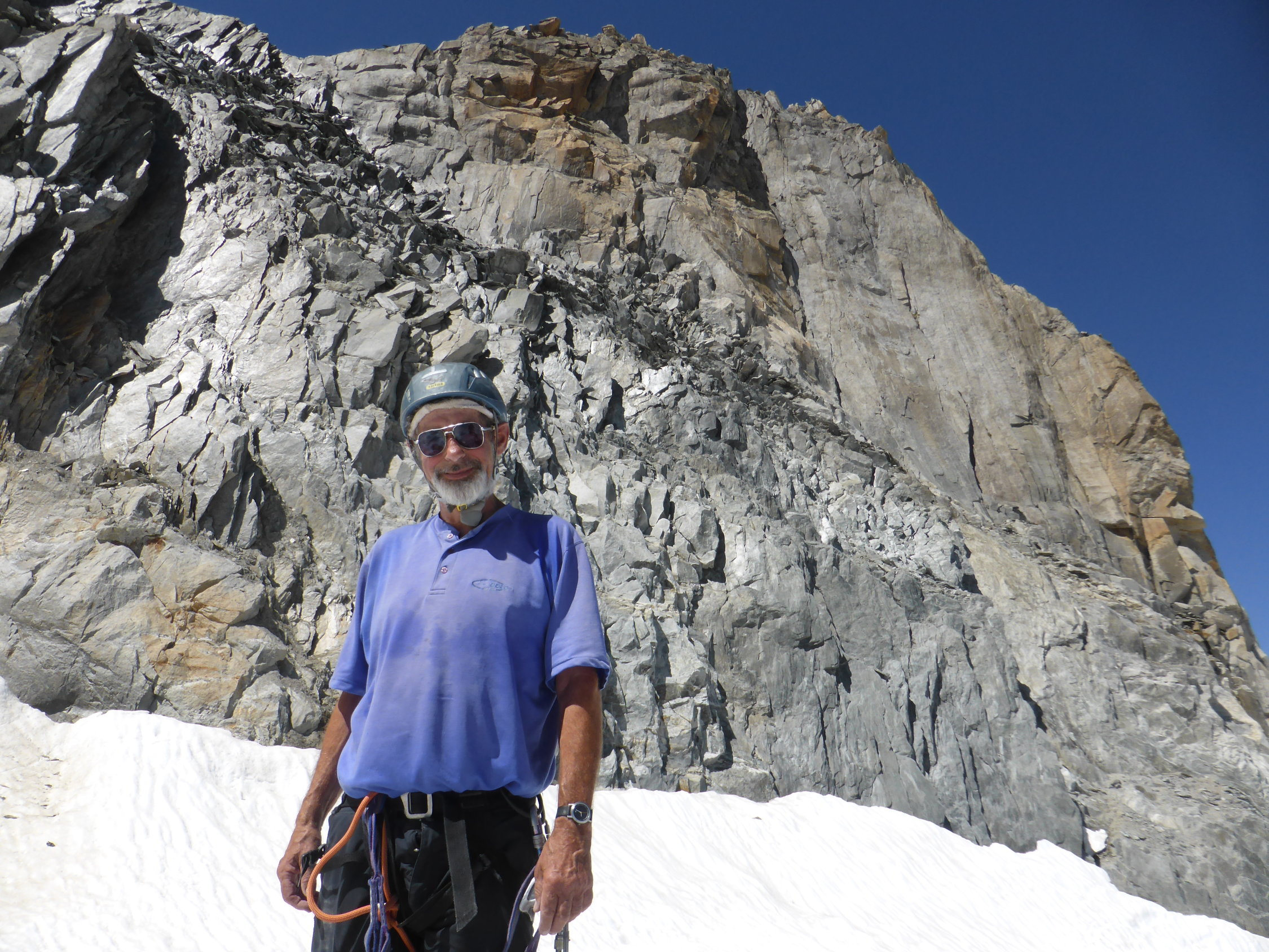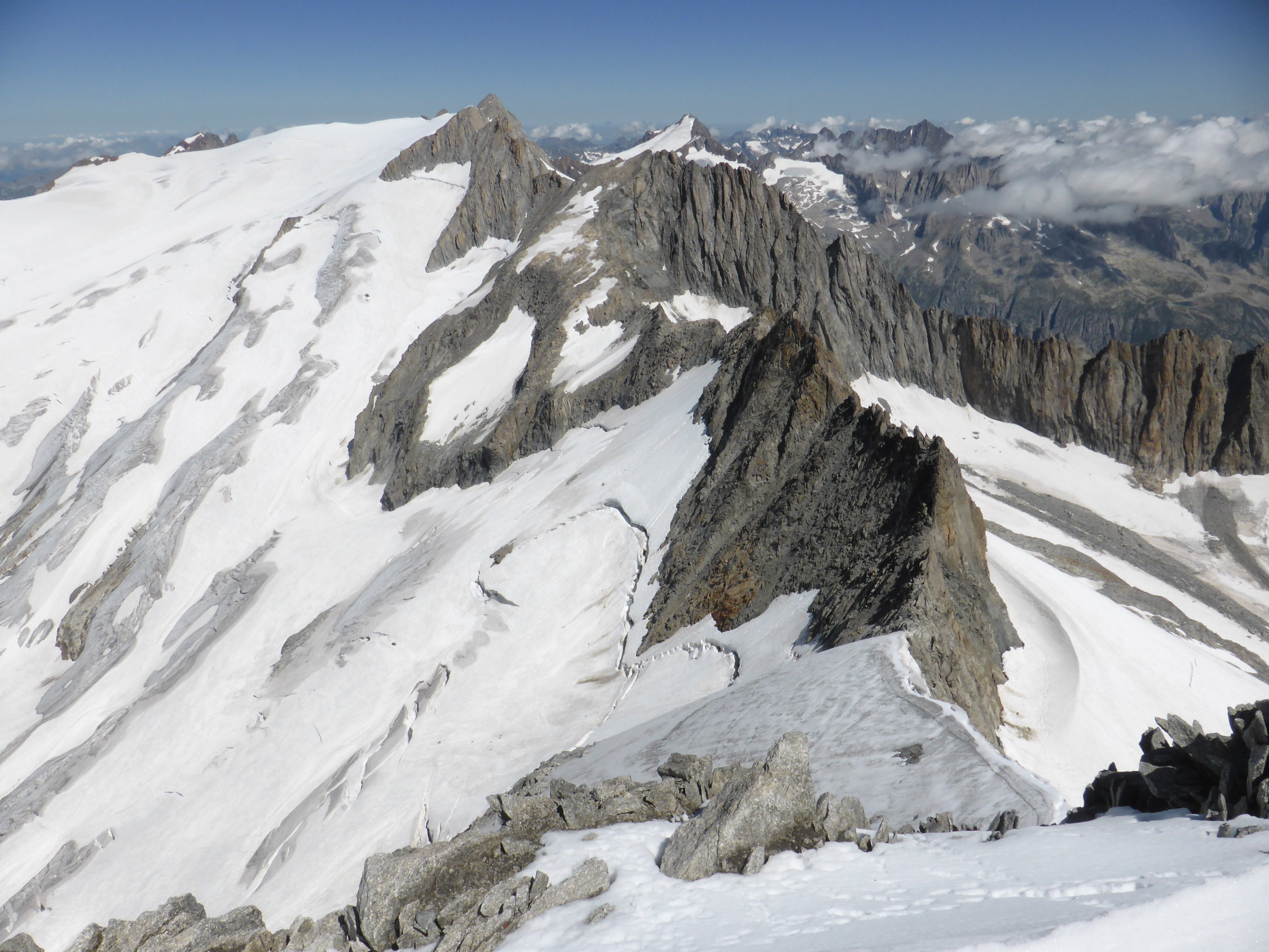 AHeimhütte-Einstieg 3h, Gipfel 4h, total 7h. Abstieg über den bestens mit Eisenstangen und Bohrhaken abgesicherten Nordgrat problemlos, flacher Firnteil praktisch blank aber gut ohne Eisschrauben machbar zZeit. Danach gehts noch eine Weile auf dem Grat, Schwierigkeiten links westseitig umgehend (mehrere BH), an dessen tiefste Stelle und von dort ostseitig runter, viele BH, auf einer Rampe linkshaltend gegen N runter bis zu einer Eisenbügelleiter, die auf den Gletscher führt, Uebergang über den Schrund problemlos, dann nach S zurück zur Aufstiegsroute, die auch am Nachmittag 14h30 noch problemlos begehbar war.