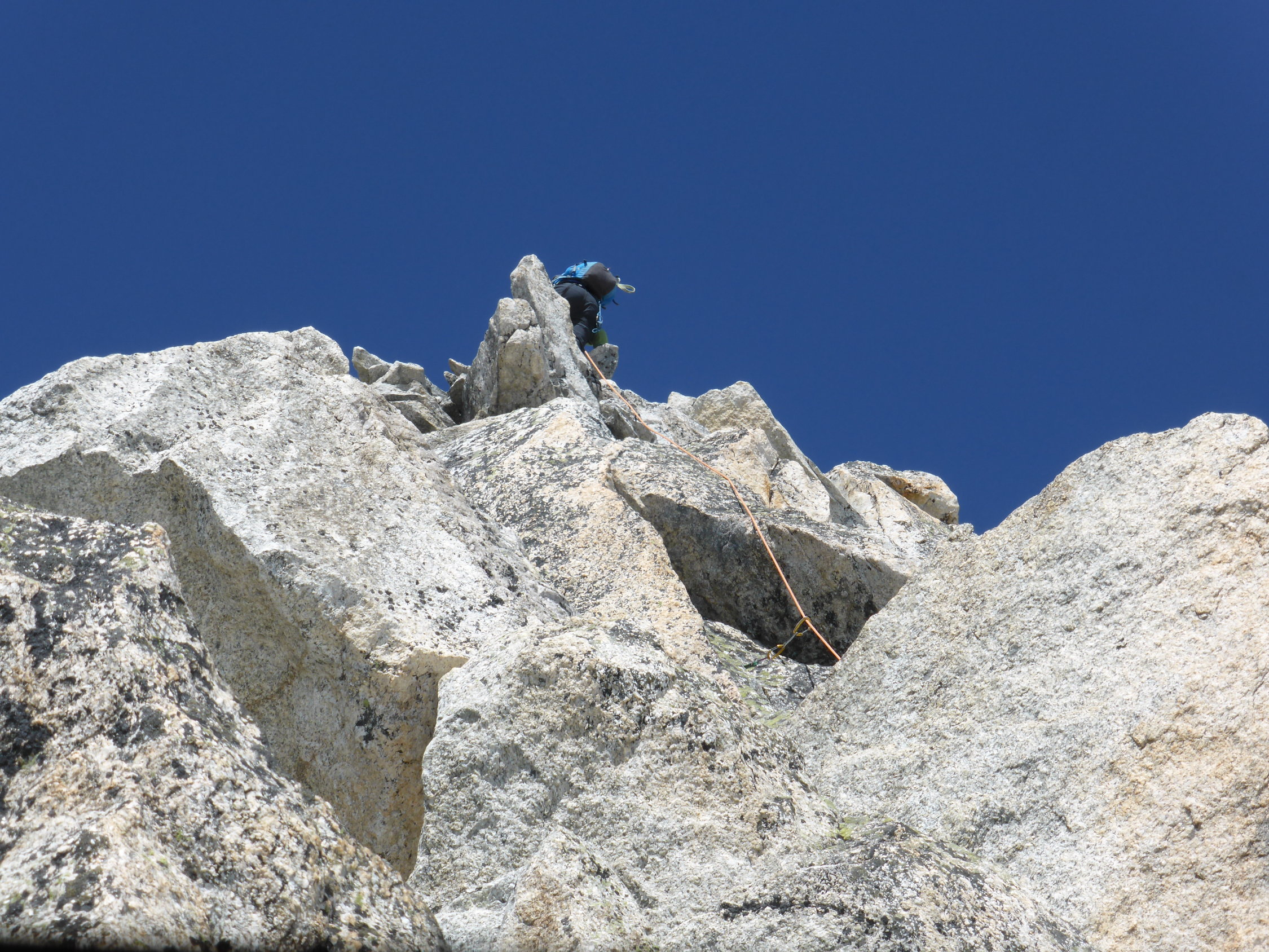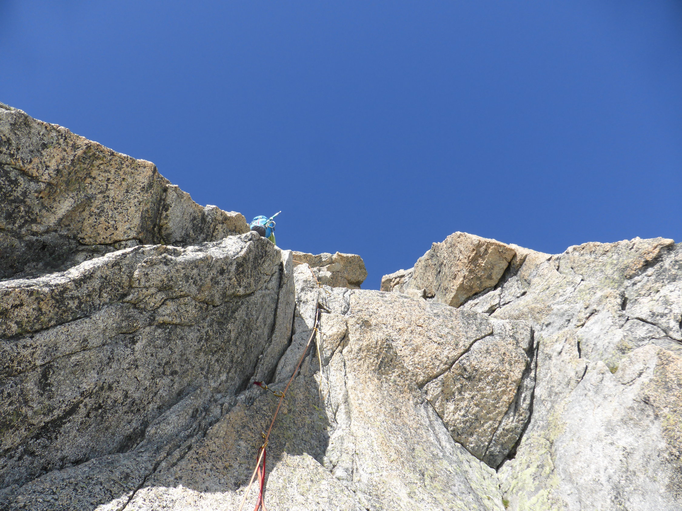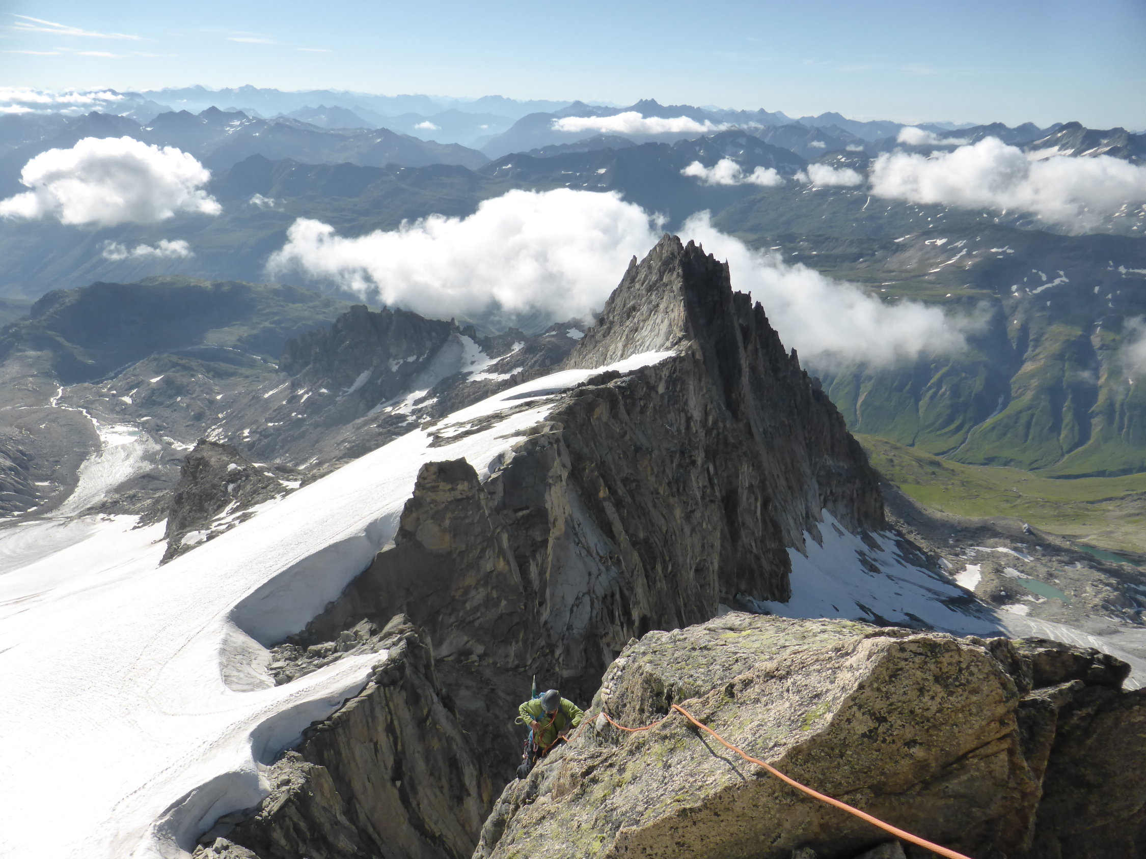 Zustieg zur Ob. Bielenlücke 3248m über Tiefengletscher problemlos, Spalten erkennbar und noch gut gedeckt. SE-Grat mit Bohrhaken und Klebeankern grosszügig abgesichert, genügend Express(8)mitnehmen, wir hatten zu wenig dabei. Auch etwas mittlere Friends und Klemmkeile gut brauchbar. Schlüsselstelle, die den grossen Turm rechts in einer breiten Rinne umgeht, für uns in den schweren Bergschuhen nur mit Schlingenstand A1 machbar, hier wären Kletterfinken von Vorteil. Weiter im Blockgratgelände problemlos, Gipfelgrat noch knapp nicht blank. Unser Zeitbedarf: