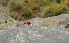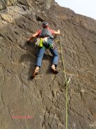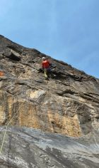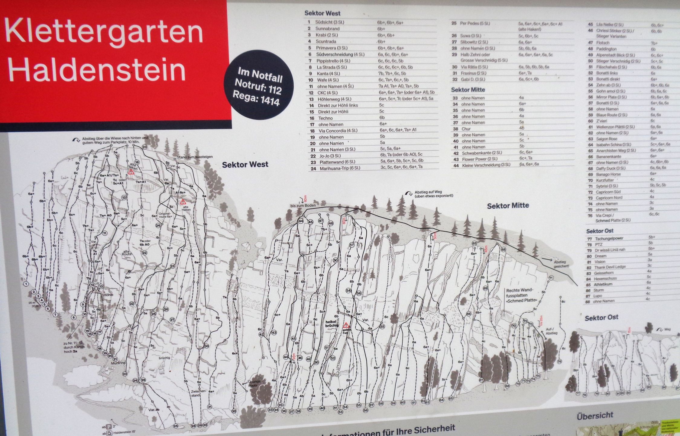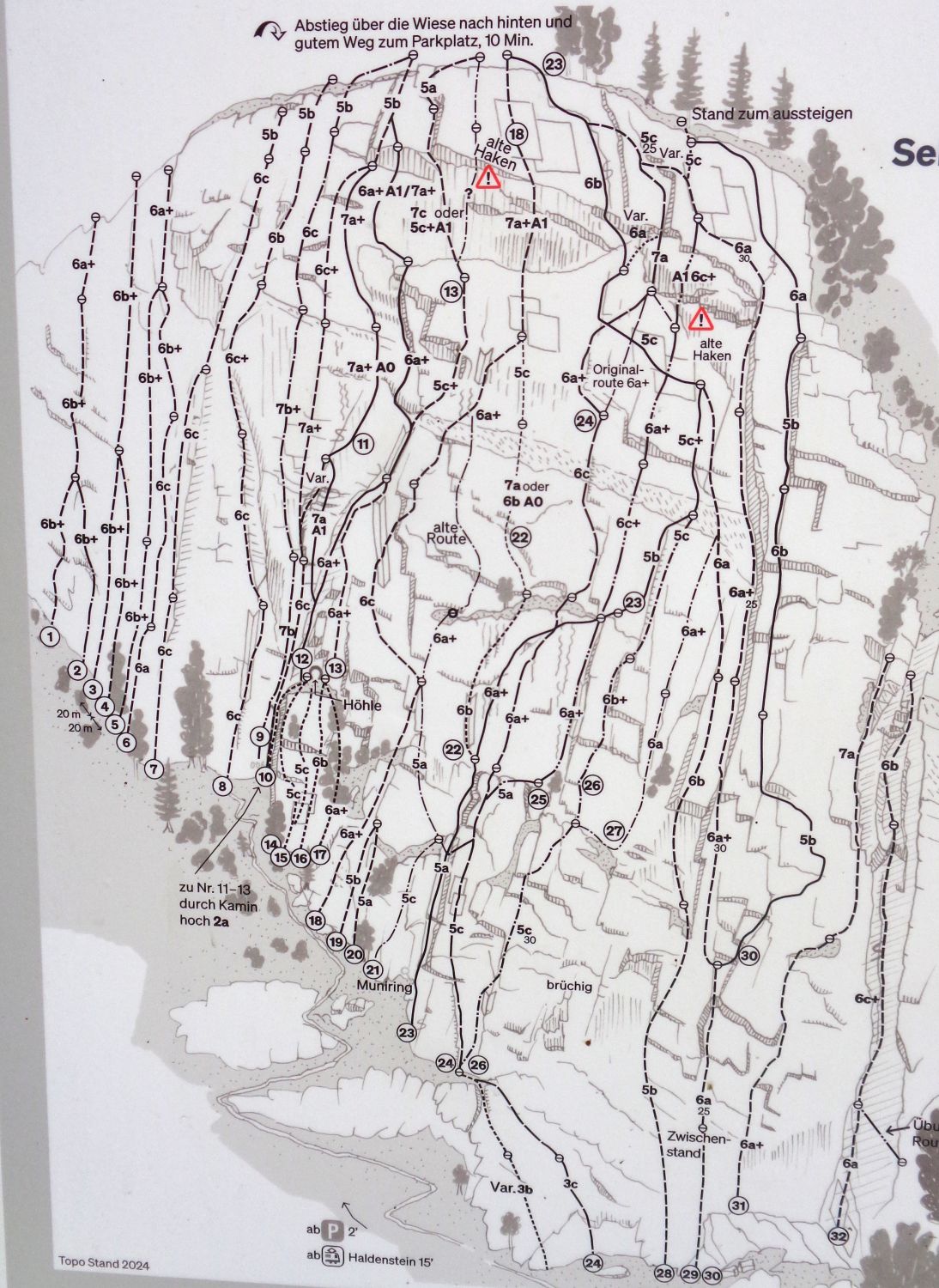 SL1 (6a+, 25 m): Cooler Start (siehe Bild, toller Fels), den 2. Bh zu überklettern erfordert gutes Stehen. Es gibt zwei Baseclimbs R nebenan (17 m lang, oben Kette) zum warm machen. Nach einem kurzen Band, nochmal hoch zum Stand. Nicht an der Kette der Baseclimbs Stand machen)