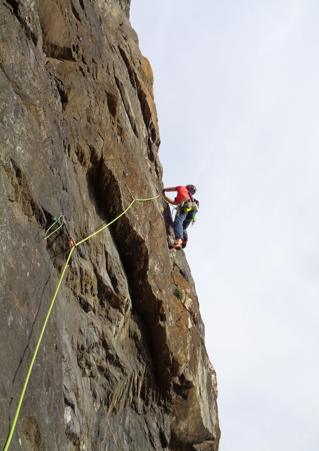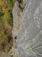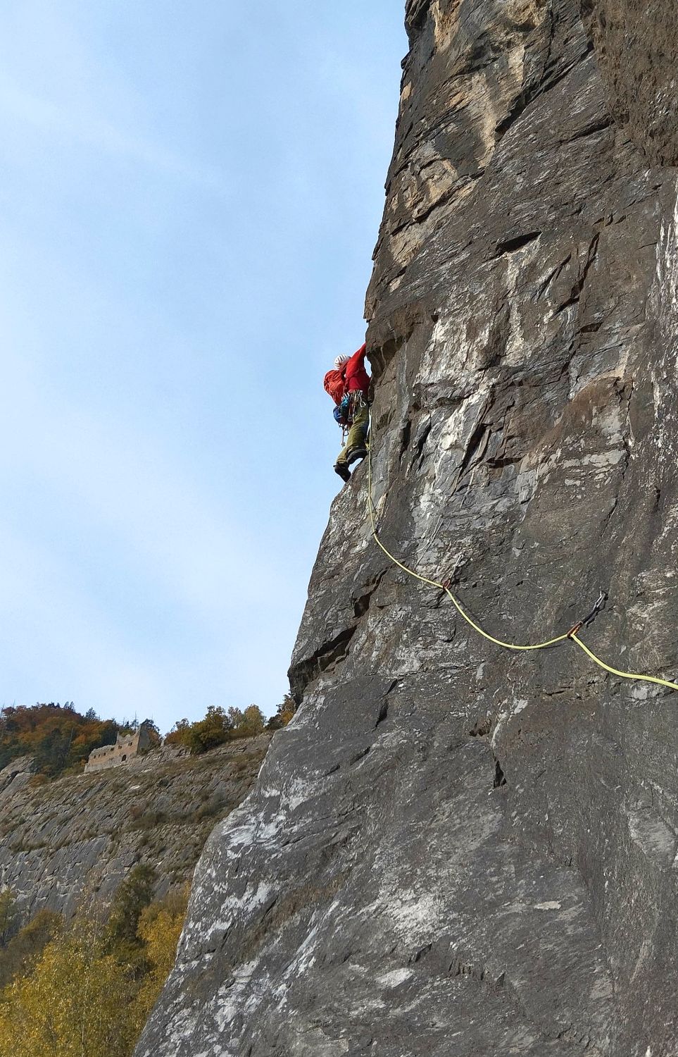 SL2 (6c, 25 m): Vom Stand weg lange Querung nach L, den Bh entlang, dicht gesichert (die Alte Route ging in die Überhänge hoch). Nach 10 m geht es an der Kante hoch (Crux ist ein etwas griffloser Aufsteher, milde Bewertung), im Rest der SL steiler und griffiger nach R oben.