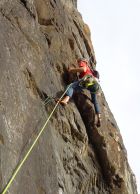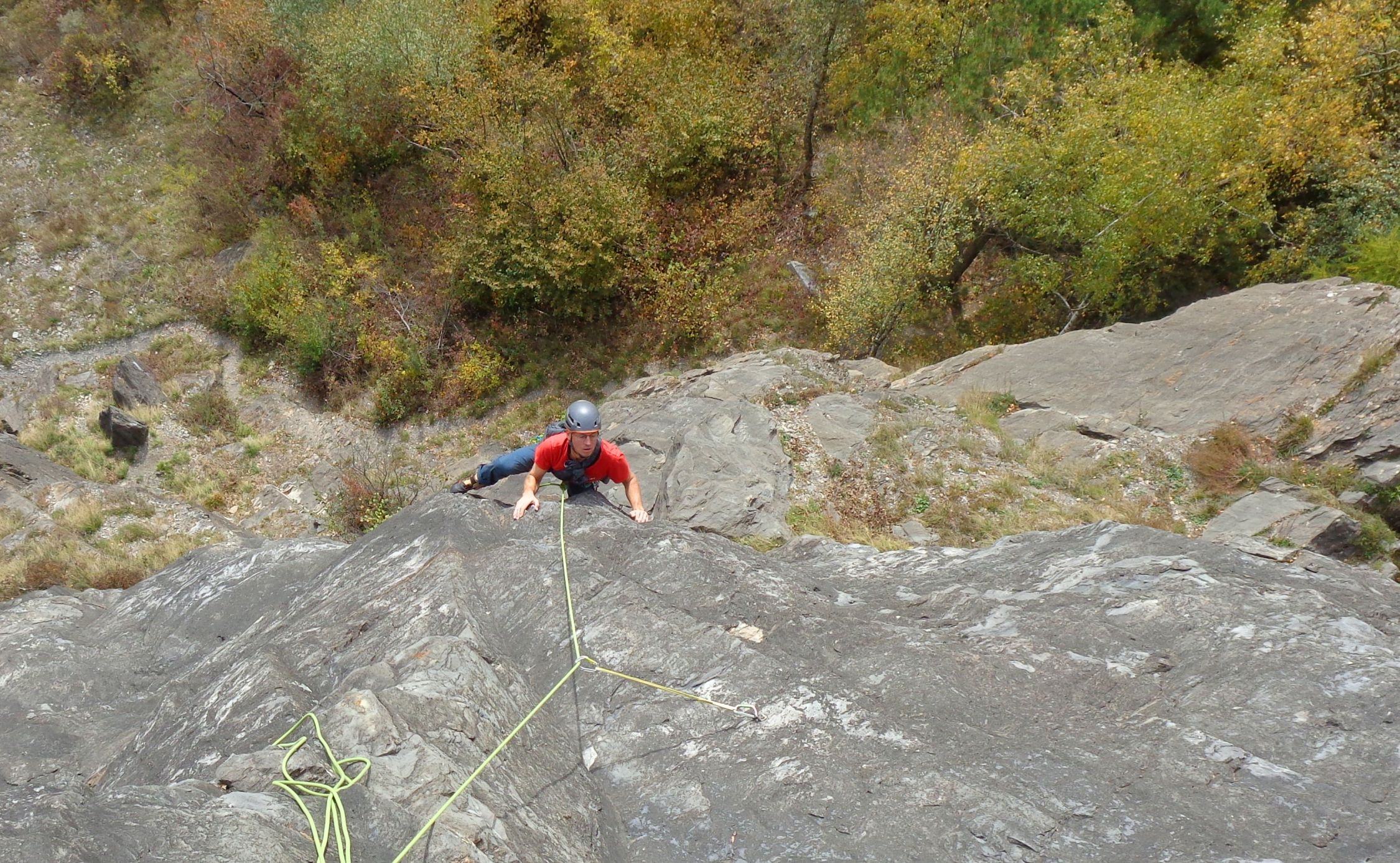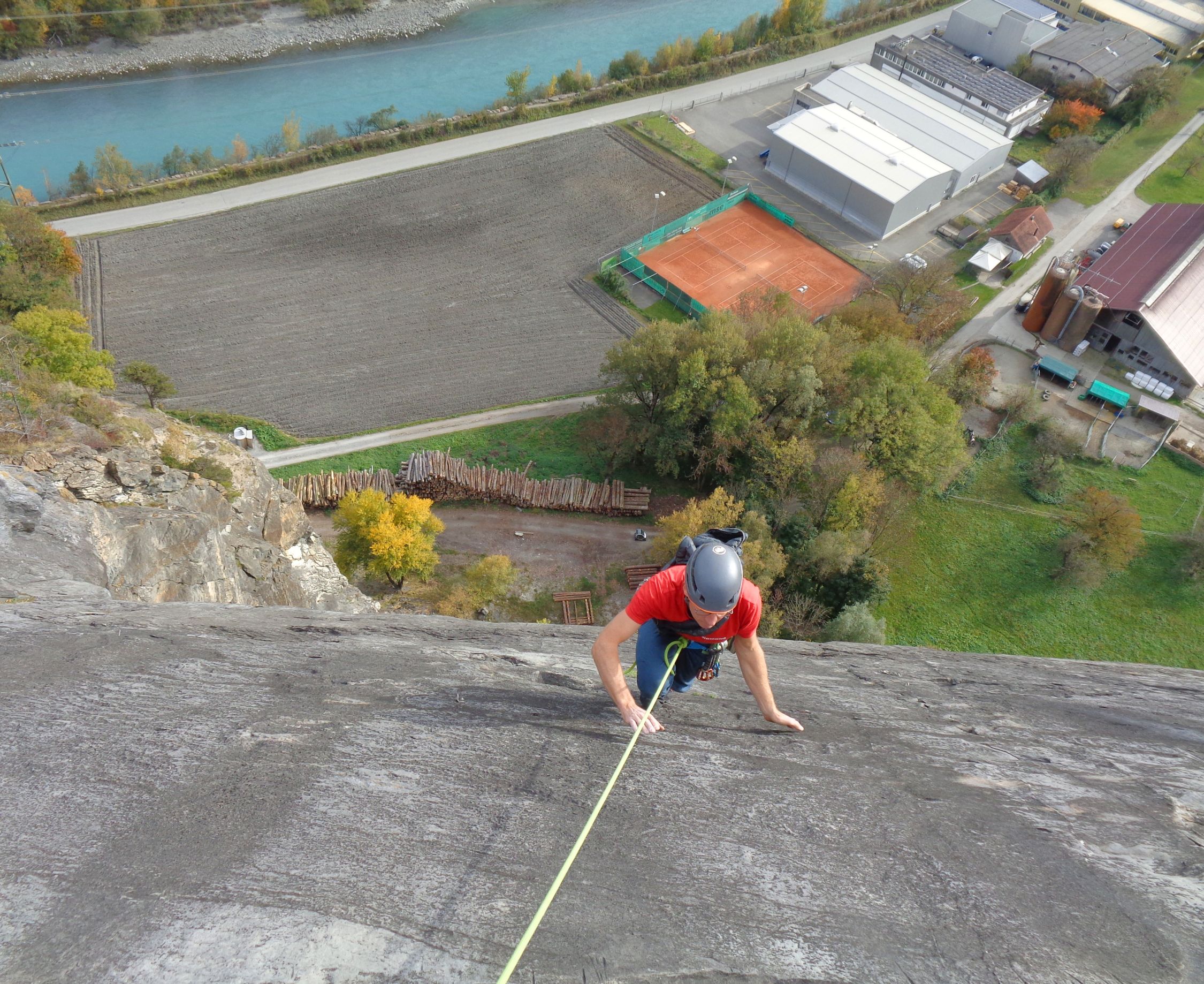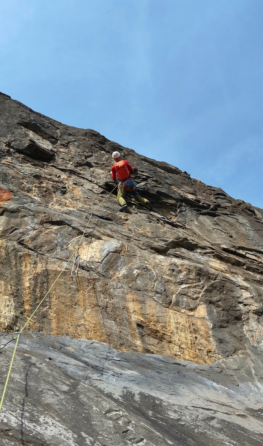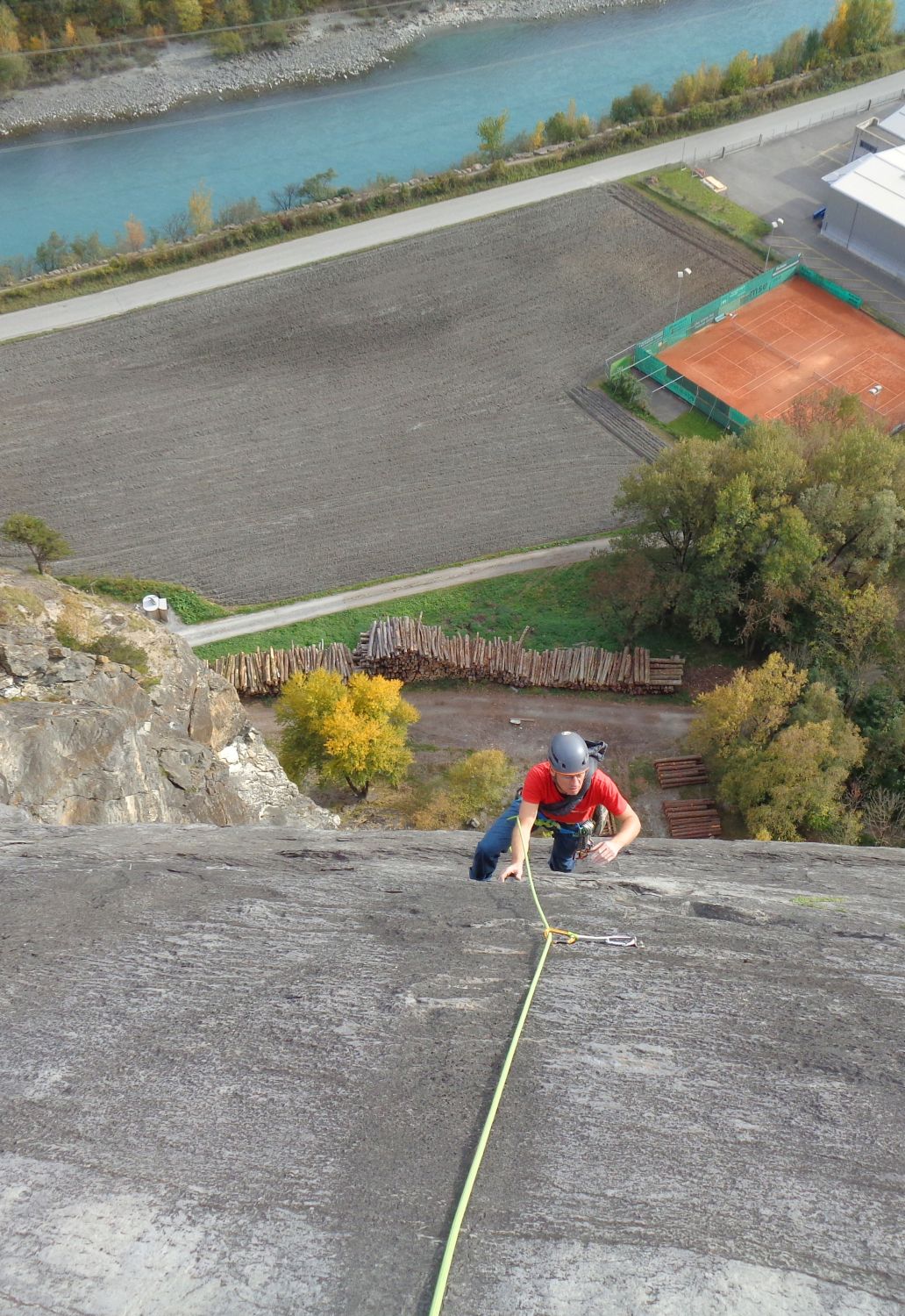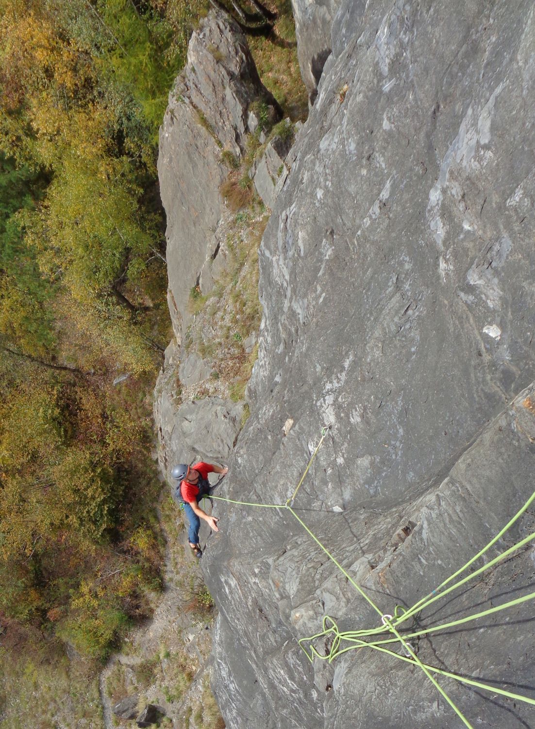 SL4 (30 m, 6a, p.a.) Zunächst „flach“ nach oben, daher kommt der 1. Bh auch erst 4-5 m höher. Dann zum Überhang. Dort 5-6 Bh möglichst flott durchziehen. Wer groß ist (und kräftig) klettert das locker A0 durch. Sonst, 2 mal Trittschlingen nehmen (Alpin-Exe geht dafür gut). Über die Dachkante gibt es zwei OK Griffleisten, um sich in der Platte zu etablieren. Dort nochmal 15 m hoch. Ganz am Schluss ist es am glattesten (da sitzen die Bh auch dichter), aber man muss es klettern.. also Achtung wegen Seilzug).