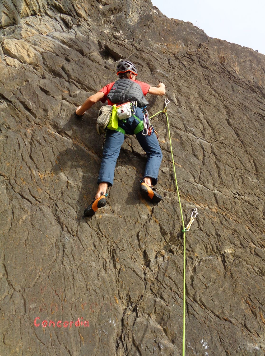 Jetzt zur weiteren Orientierung für den Ausstieg: es gehen mindestens 3 Routen über den großen Überhang. Concordia ist die am weitesten R (es hängen dort zwei große weiße Schlingen für die p.a. stelle). Danach kommt 20 m nichts und dann kommt der Ausstieg der Plattenwand