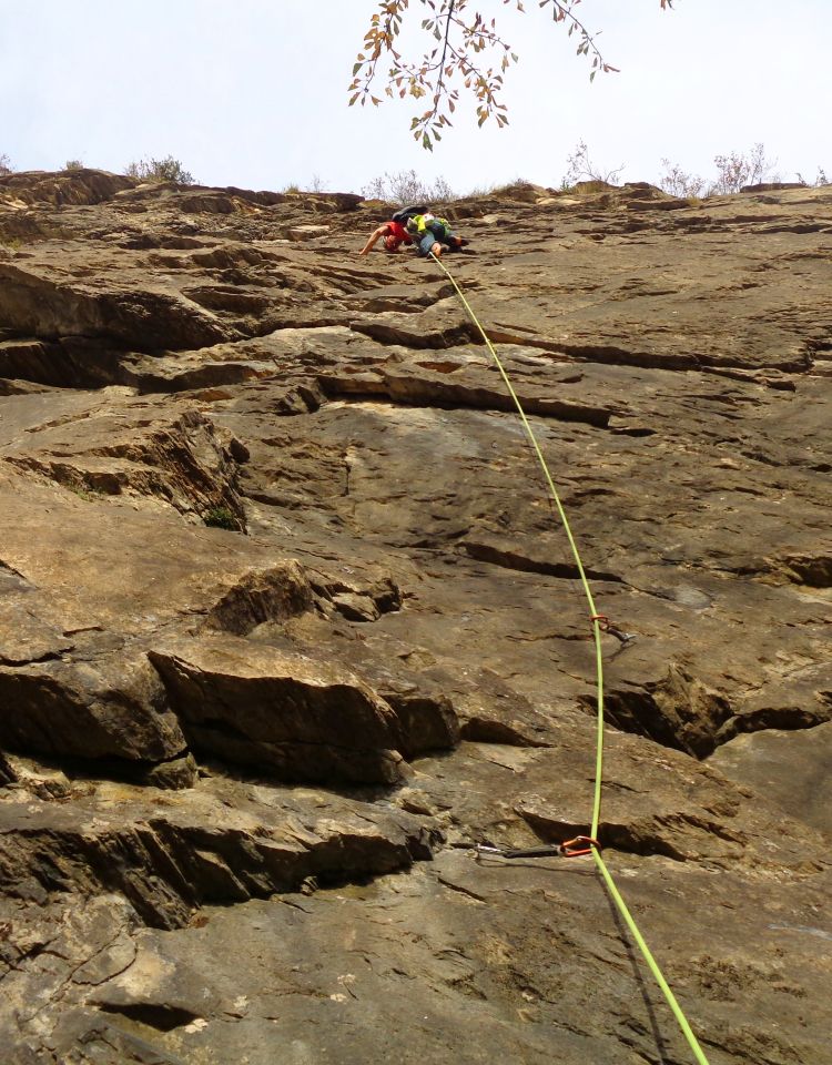 SL2: Vom Stand weg ist es erst mal recht einfach. Der Fels auf den nächsten 10 m sieht an einigen Stellen splittrig aus. Wer das nicht mag, läßt die Länge lieber weg. Wenn man alpines Gelände gewöhnt ist, stört es nicht sehr. Man hat nie das Gefühl, dass ein Tritt brechen könnte, und man kommt durchaus nach oben, wenn man nur die soliden Griffe anfaßt. Achtung wegen Seil zickzack und Dachkanten. An der Crux ist ein künstliches 2-Fingerloch, vermutlich sind auch ein paar der Tritte in der Route geschlagen. Das Ganze klettert sich trotz Steilheit recht gut (dichte Absicherung, lange Schlinge im Bh an der Crux, der sonst unangenehm hoch wäre). Nach den Dächern kommt schöner, gelb-brauner Fels (voll solide) und es wird immer griffiger und leichter. Netter Ausklang und Stand an großem Baum in der flachen Wiese. Die Bewertung in SL2 ist deutlich milder als in SL1.