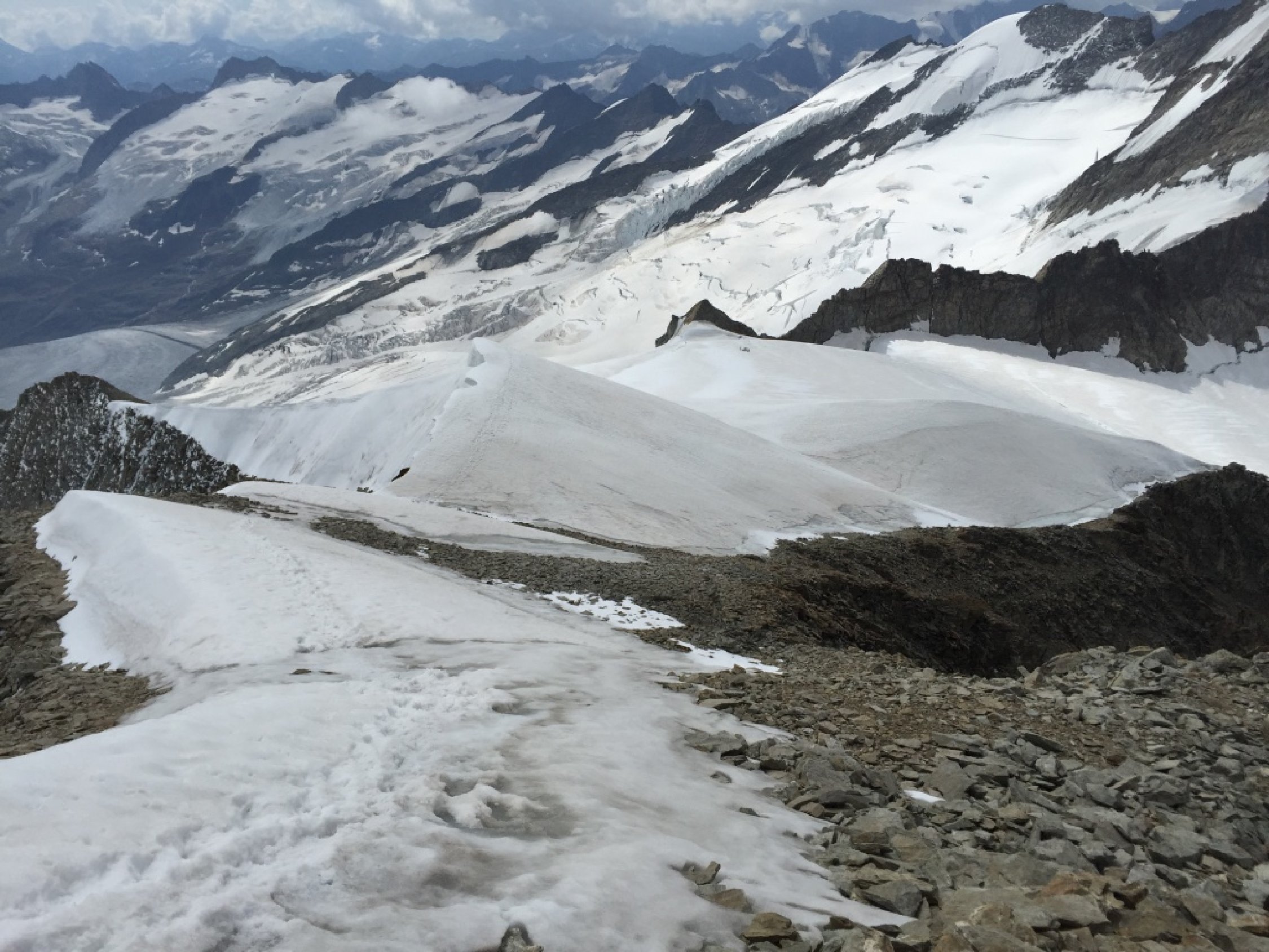 * Firn in gutem Zustand; zwei Brücken sind im Aufstieg zum Sattel zu überqueren; sie halten noch; allerdings sehen sie nicht sehr vertrauenswürdig aus. Ansonsten ist einiger Umweg in Kauf zu nehmen.