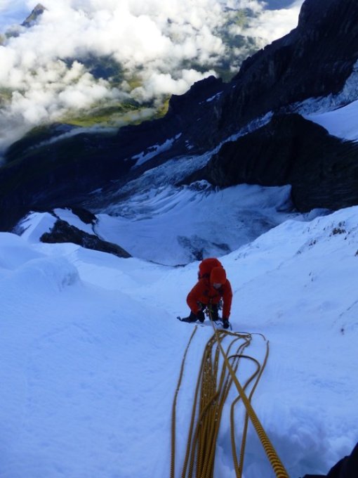 Oben dann am Bergschrund rechts wie in dem vorherigen Eintrag bereits geschildert. Wir sind dann auch hoch bis zu den Felsen und dann darüber aufgestiegen. Der Gipfelhang hatte dann wieder ganz gute Verhältnisse.