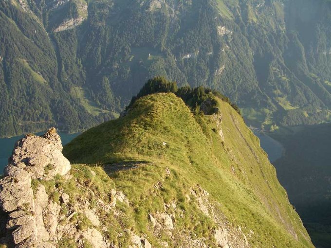 beim imposanten, über 1000m hohen nordpfeiler des ruchen-glärnisch handelt es sich um eine äusserst eindrückliche linie in leider typisch glarnerischem fels: die passagen in festem gestein lassen sich an einer hand abzählen. klettern in nicht immer zuverlässigem fels sollte einem also nicht allzuviel kopfzerbrechen bereiten. grenzwertig ist der braun-rote grat im oberen drittel - obwohl er zwar nur leichte kletterei aufweist, benötigten wir die halbe kletterzeit für diesen teil: jeder griff und jeder tritt will auf seine brauchbarkeit überprüft werden...