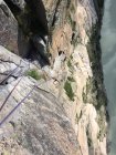 Sanieren ist toll, nur sollte man es können! Rätselhafte Standplatz-Setzerei. Offenbar ist man nicht über das 45m Seil weggekommen. Schade. Konkret für die Nichtwissenden: Hängestand entweder 3m oberhalb oder unterhalb eines perfekten Bands. Wir hörten das heute auch von der Route Gletscherweib (o. ä.). Ebenfalls sehr fragwürdig ist die 6b+ Variante wenn nur 2m daneben eine zur Route passende 5c Variante vorhanden ist. Wie wärs mit einem Standplatz auf diesem Band, dann könnte der Sicherende wenigstens sehen, was der Erste macht. Sorry aber das ist nicht sehr gelungen. Noch was: 3 Bohrhaken mehr und das Ganze könnte ohne KK und Friends angegangen werden. Ich für mich hatte unterwegs 3 unnötige Bohrhaken. Zum Schluss denke ich, dass alpines Ambiente im Eldorado mit rostigen Bohrhaken gleichgesetzt wird. Nehmt doch die alten Remy-Rostgurken mal raus (1. Stand Motorhead: Wirkt so erbärmlich die Reepschnur zum rostigen Ringbohrhaken. Zur Beruhigung der Nerven wurde dann unmotiviert 1 m daneben noch ein BH gesetzt!).