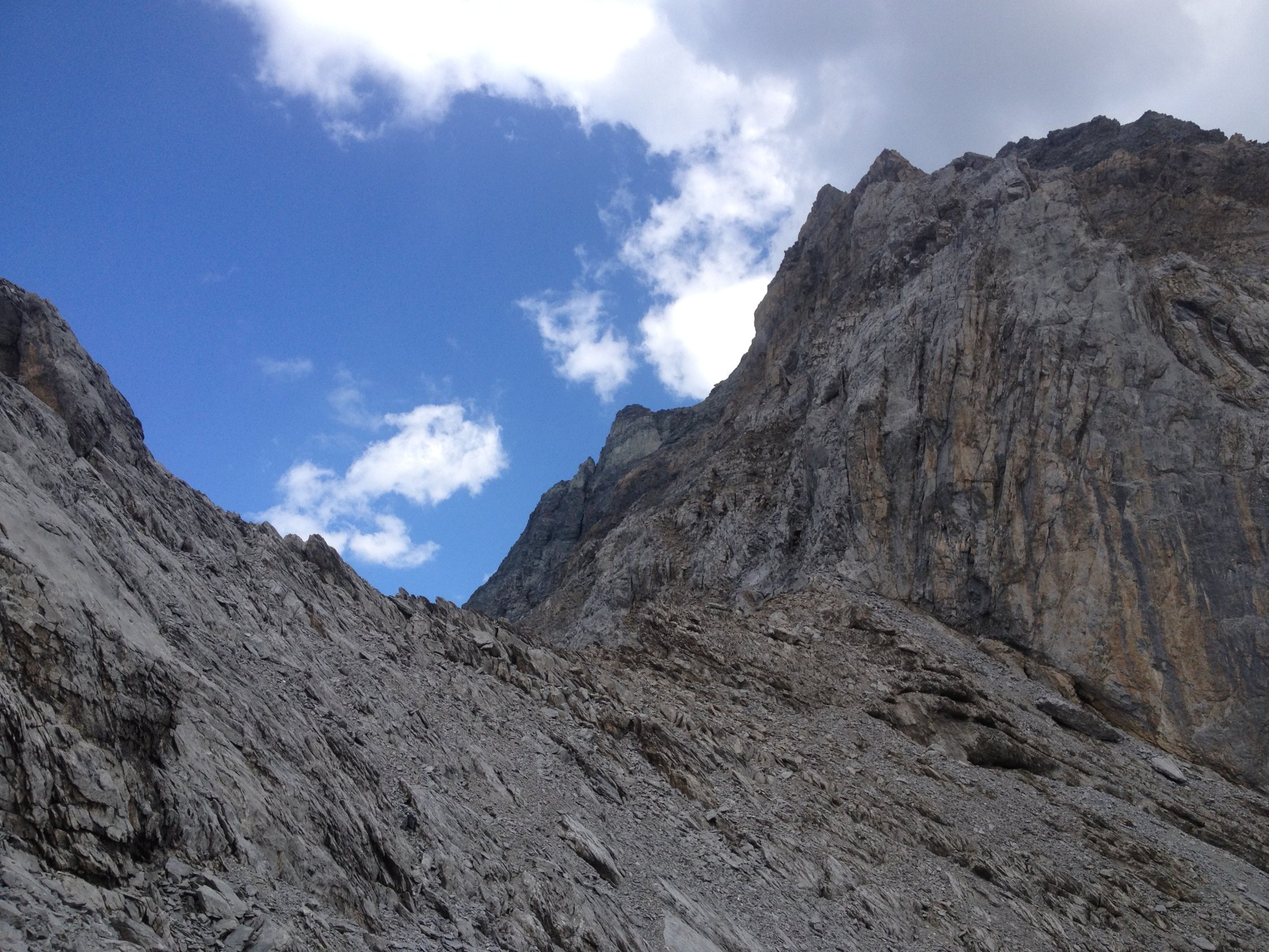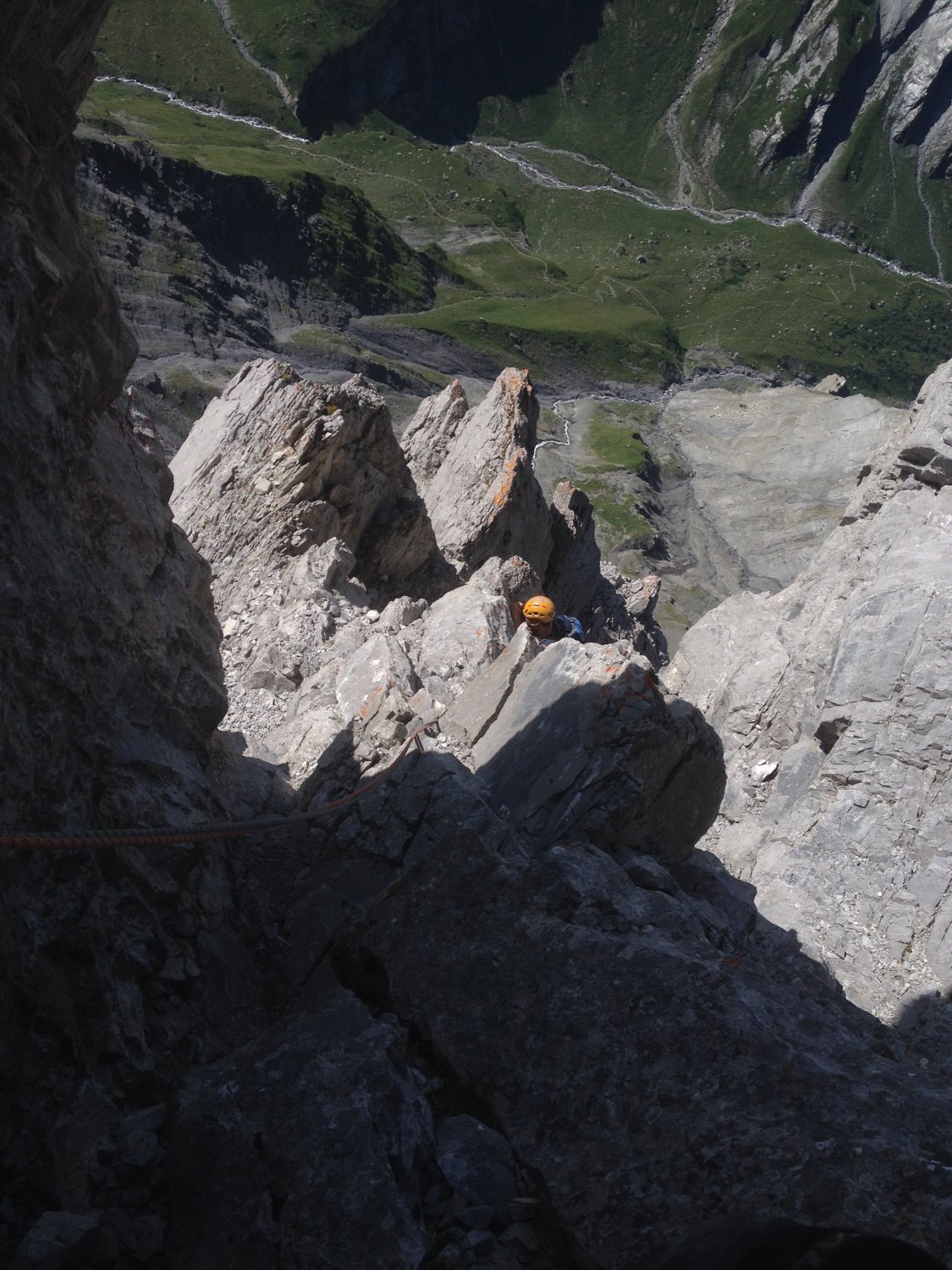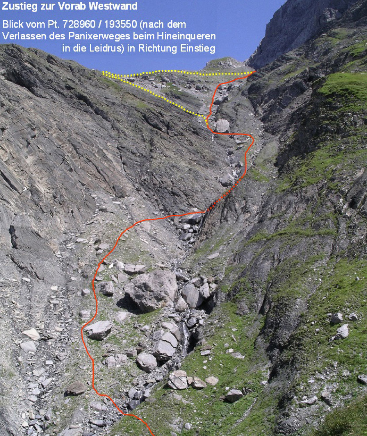 Zustieg hat häufig schwach ausgeprägte Wegspuren (Bild mit eingezeichneter Route ist hilfreich, s. unten), Einstieg ca. 50 m links des tiefsten Wandpunktes. Fels oft solid, aber auch einiges loses Material... (Zigerschlitz eben:-). Einen nussgrossen Stein auf den Helm bekommen, meist sind die Standplätze leicht versetzt zur Route, sodass das Steinschlagrisiko nicht allzu gross ist, durchdacht eingebohrt. Keile und Friends sind nicht gebraucht, aber einige Bandschlingen zum Verlängern der Express in den vielen Traversen.