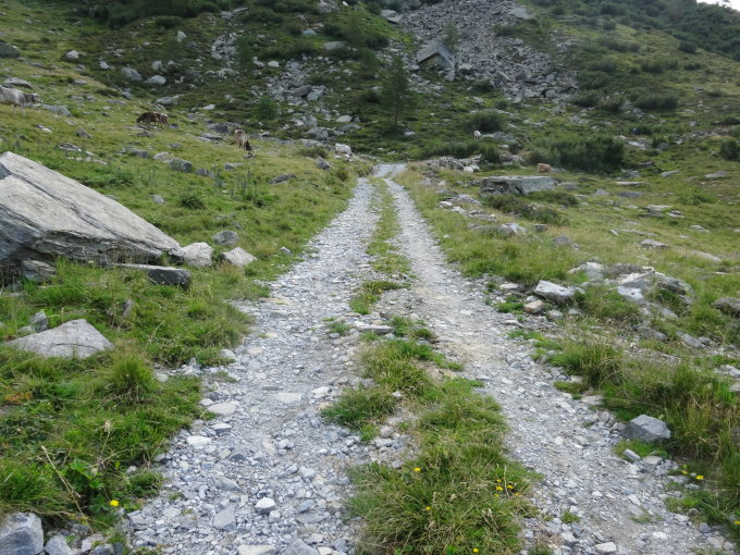 Ab Laghetto die Cadabi ist die Route mit blauen Punkten durchgehend markiert bis 3220 HM. Das Blockfeld im unteren Bereich ist kompakt. Man befindet sich im unteren Bereich auf der nördlichen Seite des Grats in der Flanke. Später erfolgt ein Wechsel auf die südliche Seite. Hier grasdurchsetztes, steiles Gelände, mit einem Drahtseil versichert. Nach einer Schulter geht es für wenige Stellen leicht ausgesetzt wieder auf der nördlichen Seite des Grates weiter. Hier folgt die strengste Stelle, gut mit einer Kette versichert. Senkrechte, gut gestufte IIer Kletterstelle für etwa fünf Meter. Danach geht es einfach weiter vorbei an Pkt. 3206.