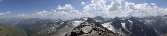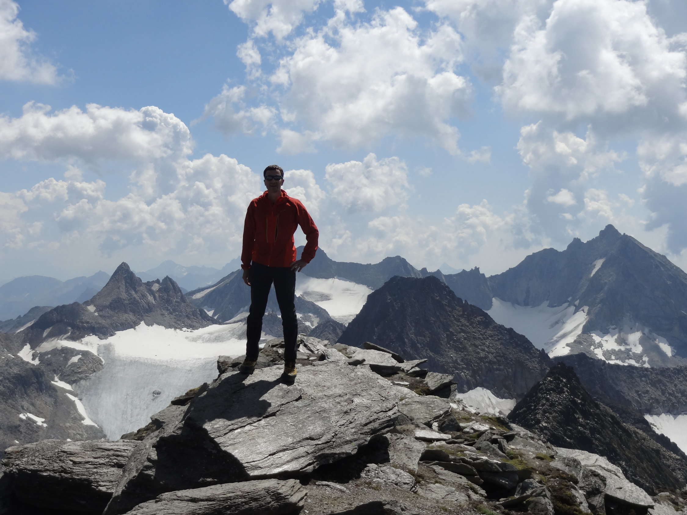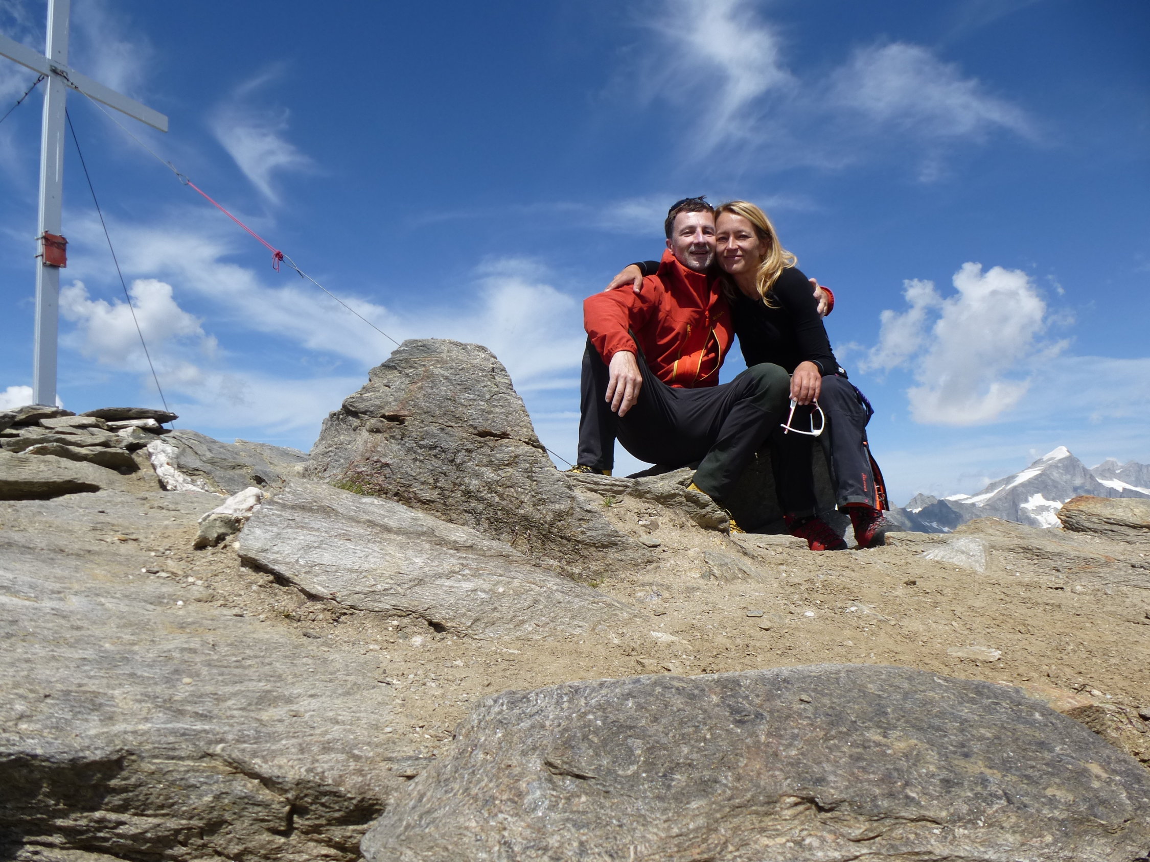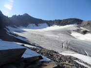 Ausstieg über rechten oberen Teil Gletscher auf Westgrat, Rückweg über Seil-versicherte Direktvariante. Beide Varianten sind momentan nicht ganz unproblematisch. Mehrere spontane Steinrutsche ohne Fremdeinwirkung in beiden Varianten. deutlicher Steinschlag aus dem Westgrat zwischen beiden Varianten