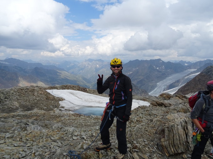 sind auf die südliche Sexegertenspitze auch noch rauf, aber nicht über den bröseligen Grat, sondern östlich eine Eisflanke (ca. 45°) hinauf;