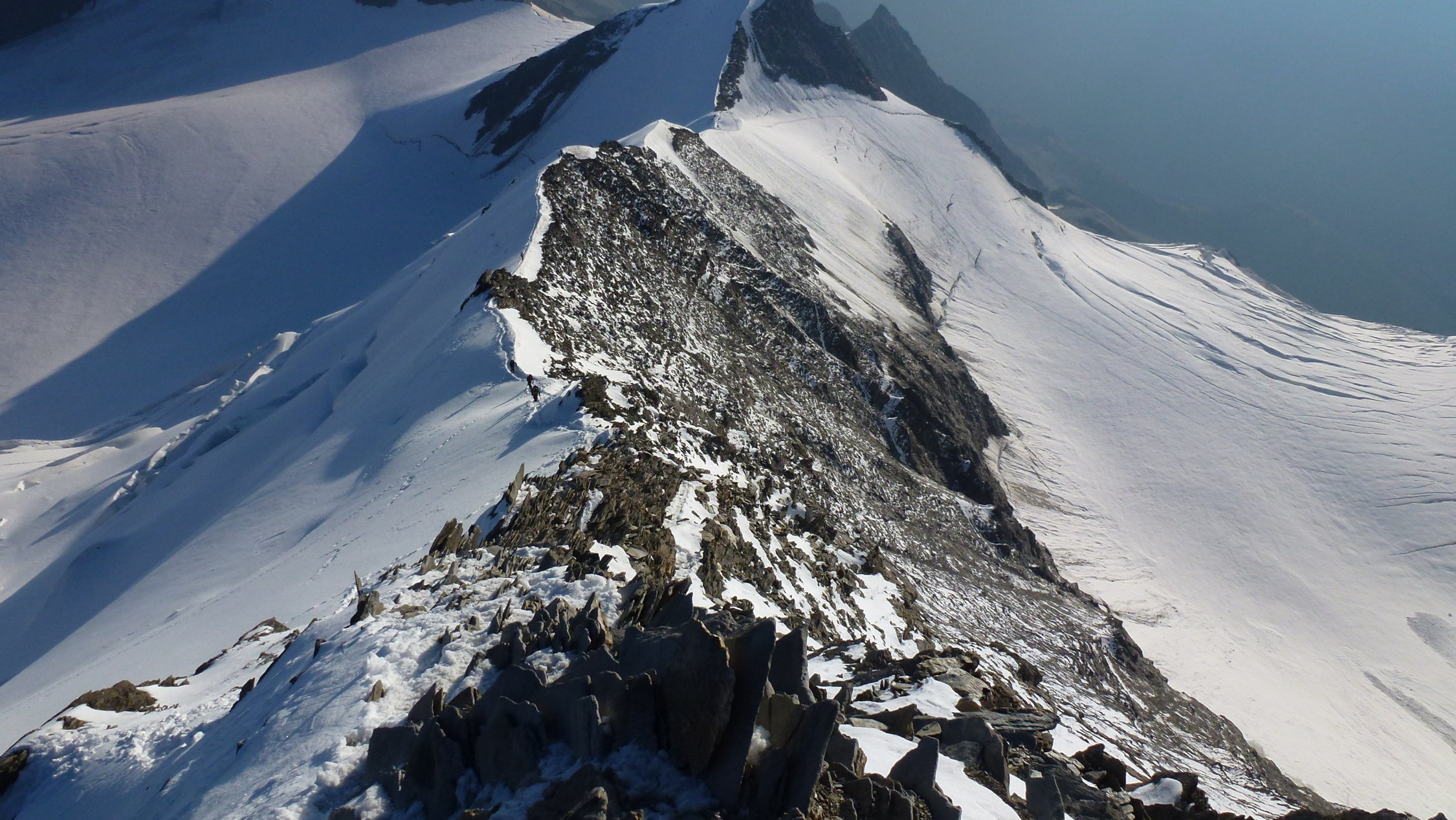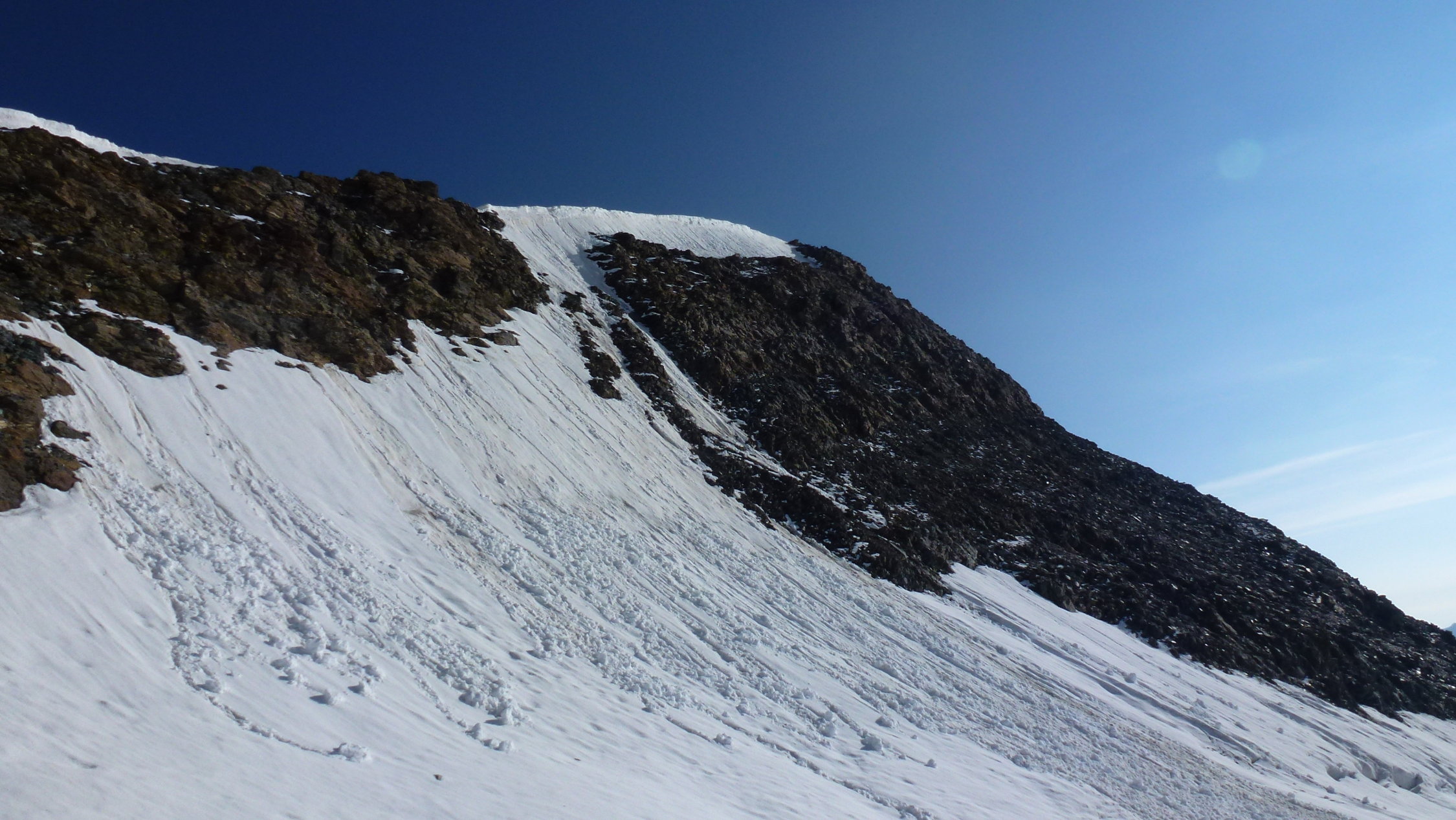 Auf dem Grat guter Tritt im Schnee, teilweise zeigen sich schon das Blankeisstellen.