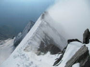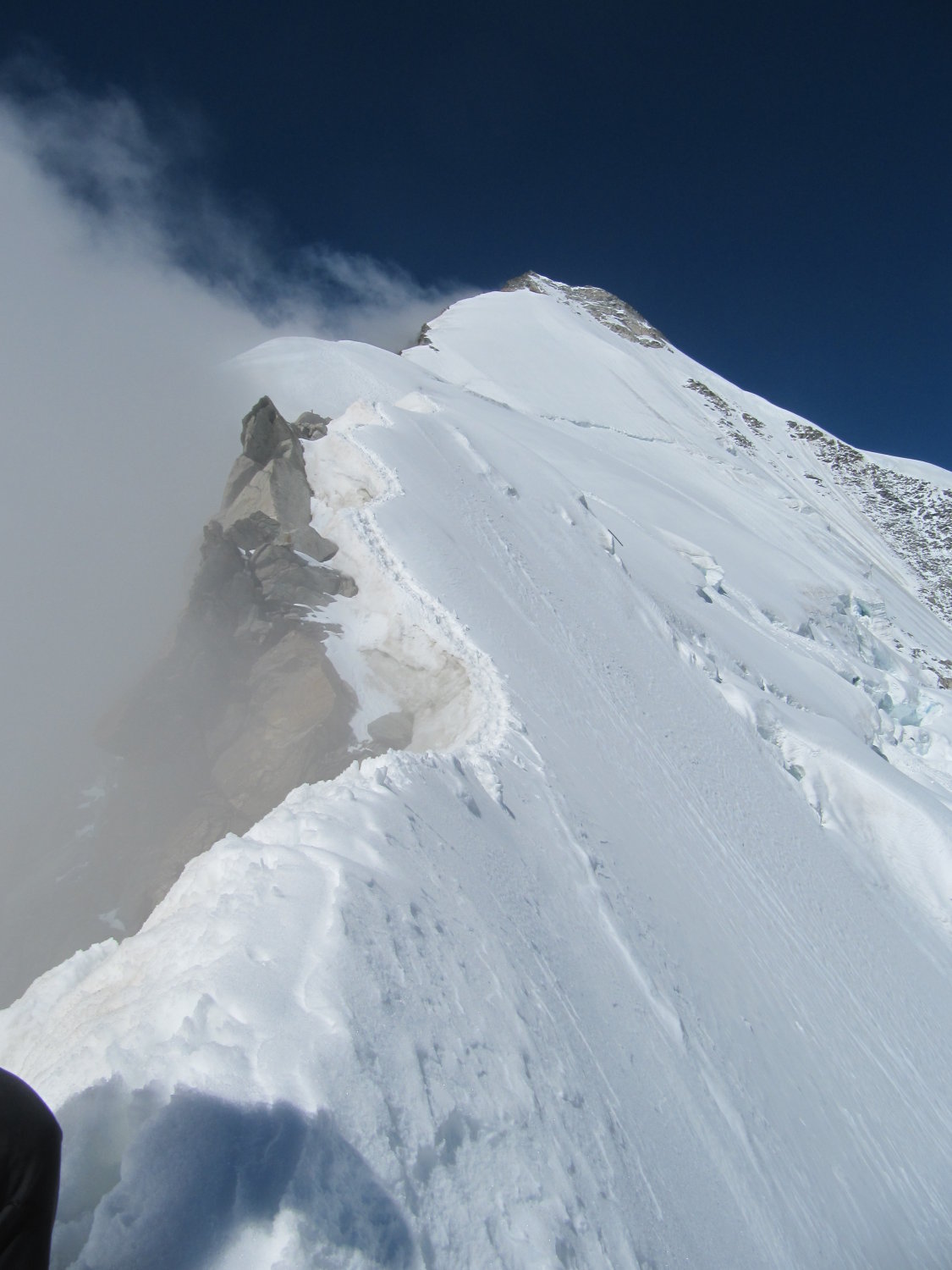 Sehr gute Verhältnisse. Im Gratbereich ist der Niederschlag von Sonntag/Montag als Schnee gefallen, aber auf dem Felsgrat größtenteils schon wieder weggetaut. Bis kurz vor Ende des Felsgrates konnte auf Steigeisen verzichtet werden. Firngrat gespurt, kein Blankeis. Dort liegen ca. 20cm gesetzter Neuschnee auf einer harten bzw. grobkörnigen Unterlage, beim Abstieg deshalb aufpassen. Weg von der Weisshornhütte zum Frühstücksplatz fast durchgehend mit kleinen Steinmännern markiert. Trotzdem ist der Weg auf die mittlere Rippe, welche zum Frühstücksplatz führt, für nicht im Detail Ortskundige im Dunkeln an der entscheidenden Stelle auf ca. 3400m leicht zu verfehlen. Entweder oberhalb des P3145 (nach dem Wasserloch) stur den Steinmännern oben entlang des kleinen Grates bis 3410m folgen und nicht nach links in Richtung großes unteres Firnfeld abdrängen lassen. Alternative: Im unteren Firnfeld links neben Schutt/Fels aufsteigen, bis man bei ca. 3400m rechterhand an die Felsen stößt und hier wenige Höhenmeter über Platten auf den kleinen erwähnten Grat steigen (3410m). Für beide Varianten ab hier dann knapp rechts unterhalb des wenig ausgeprägten Grates auf der Abbruchseite halten um den Durchschlupf auf die obere markante Schneeschulter nicht zu verpassen. Die obere Schneeschulter und folgender Schutt/Felsbereich nach NW überqueren bis man auf eine kurze nach W gerichtete Rinne trifft, welche direkt zu einem in vielen Berichten erwähnten "großen Steinmann" führt (Bohrhaken, 3549m). Von hier weiter den Wegspuren und Steinmännern auf die mittlere Rippe folgen. Von da ist der Weg weiterhin gut mit Steinmännern markiert und kaum noch zu verfehlen, solange man sich nicht in eines der Coloirs abdrängen lässt.