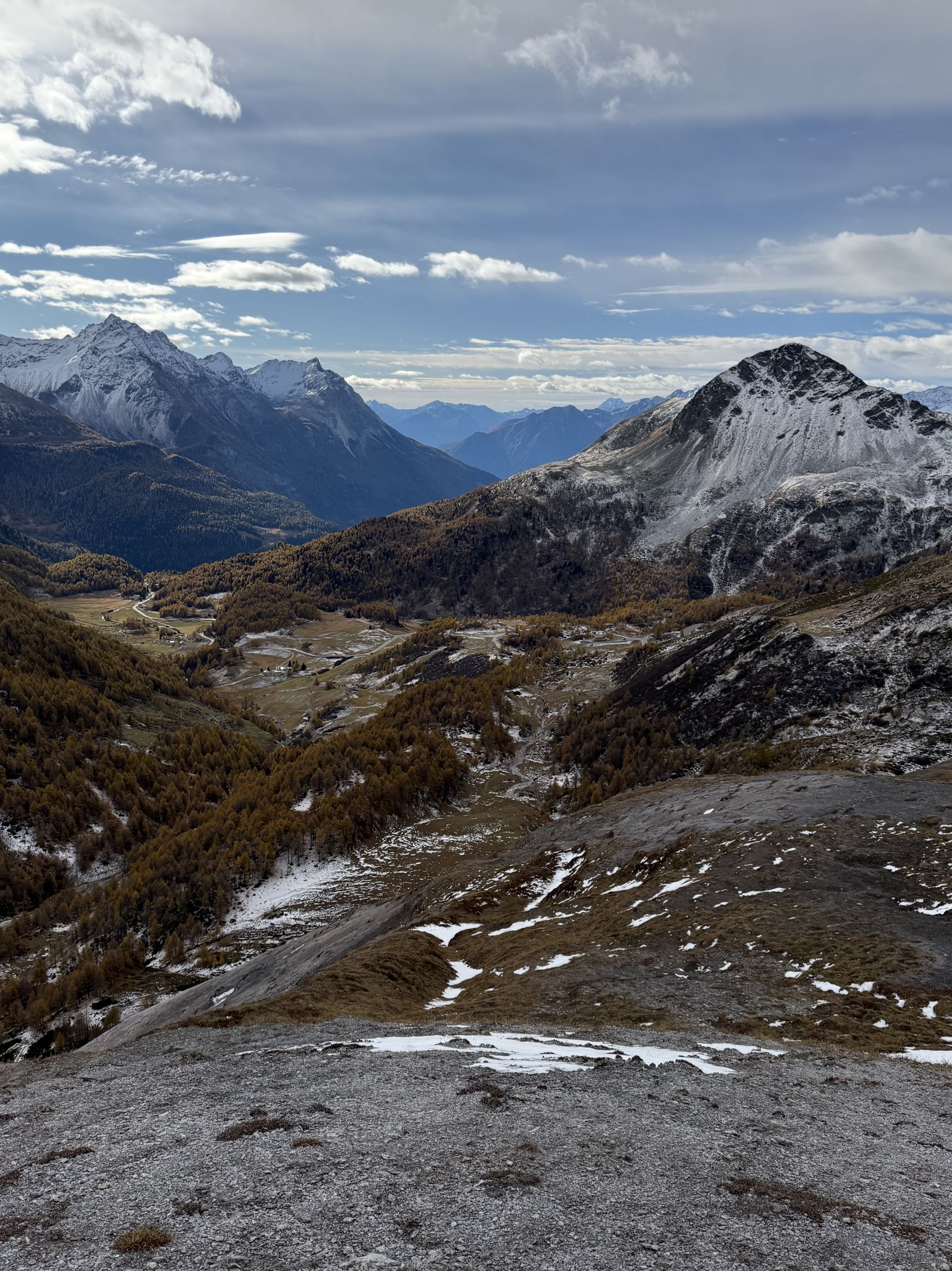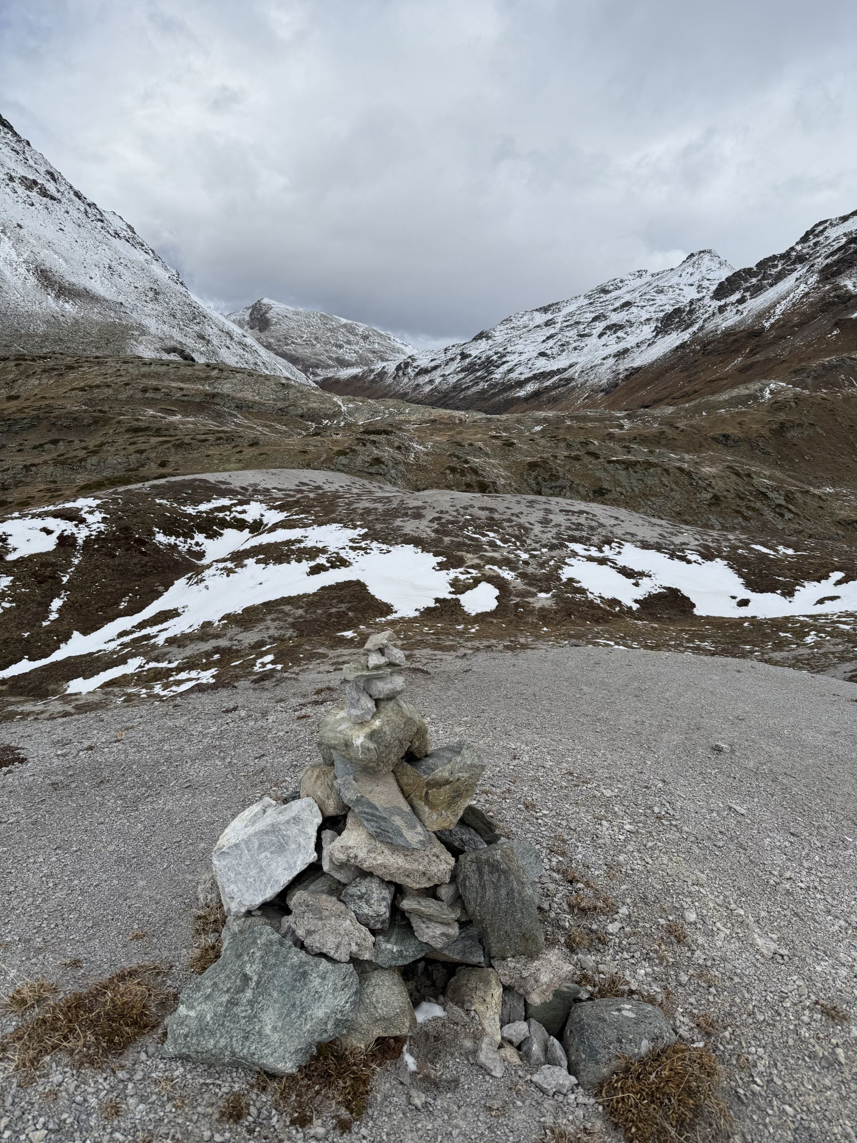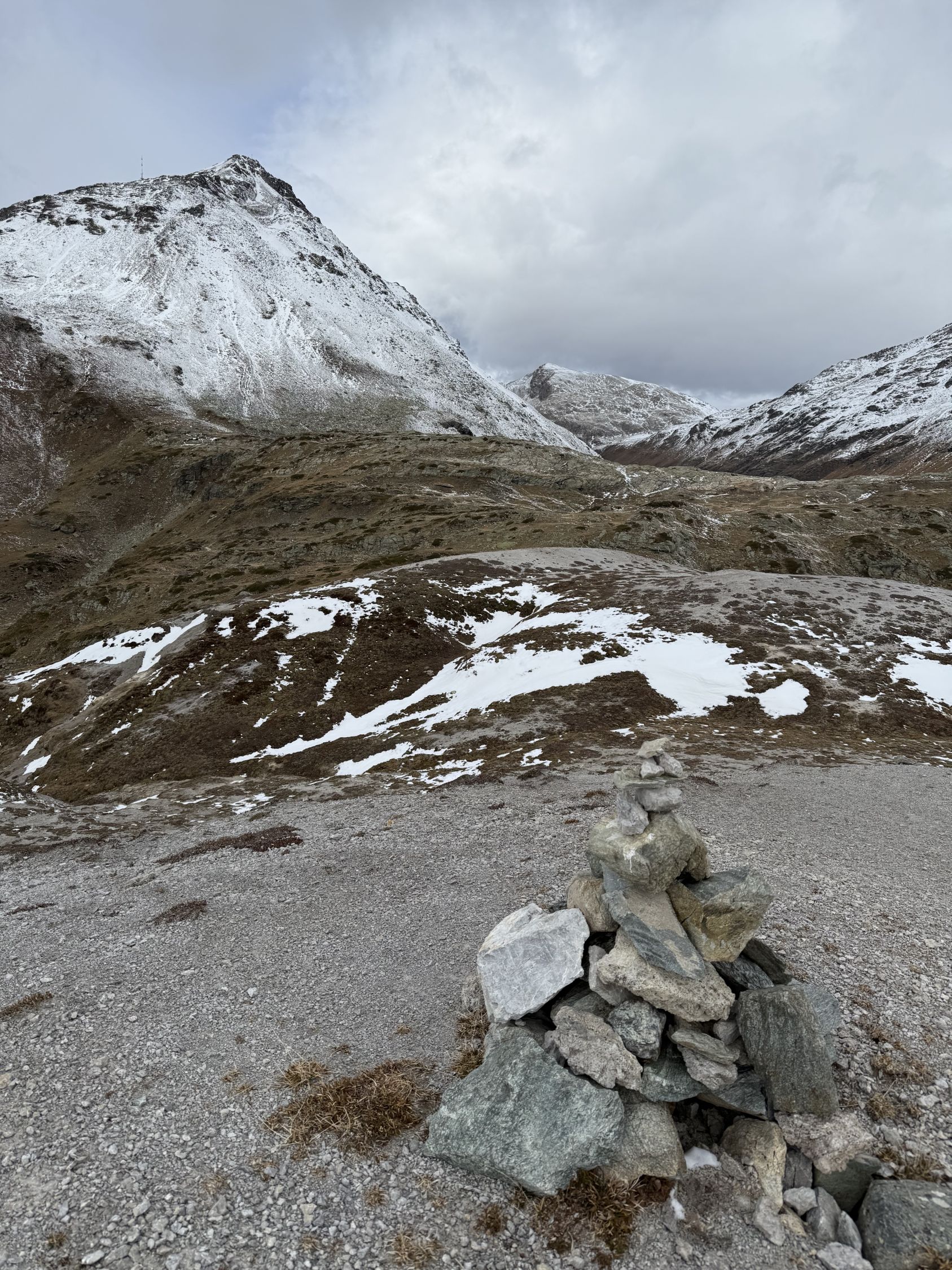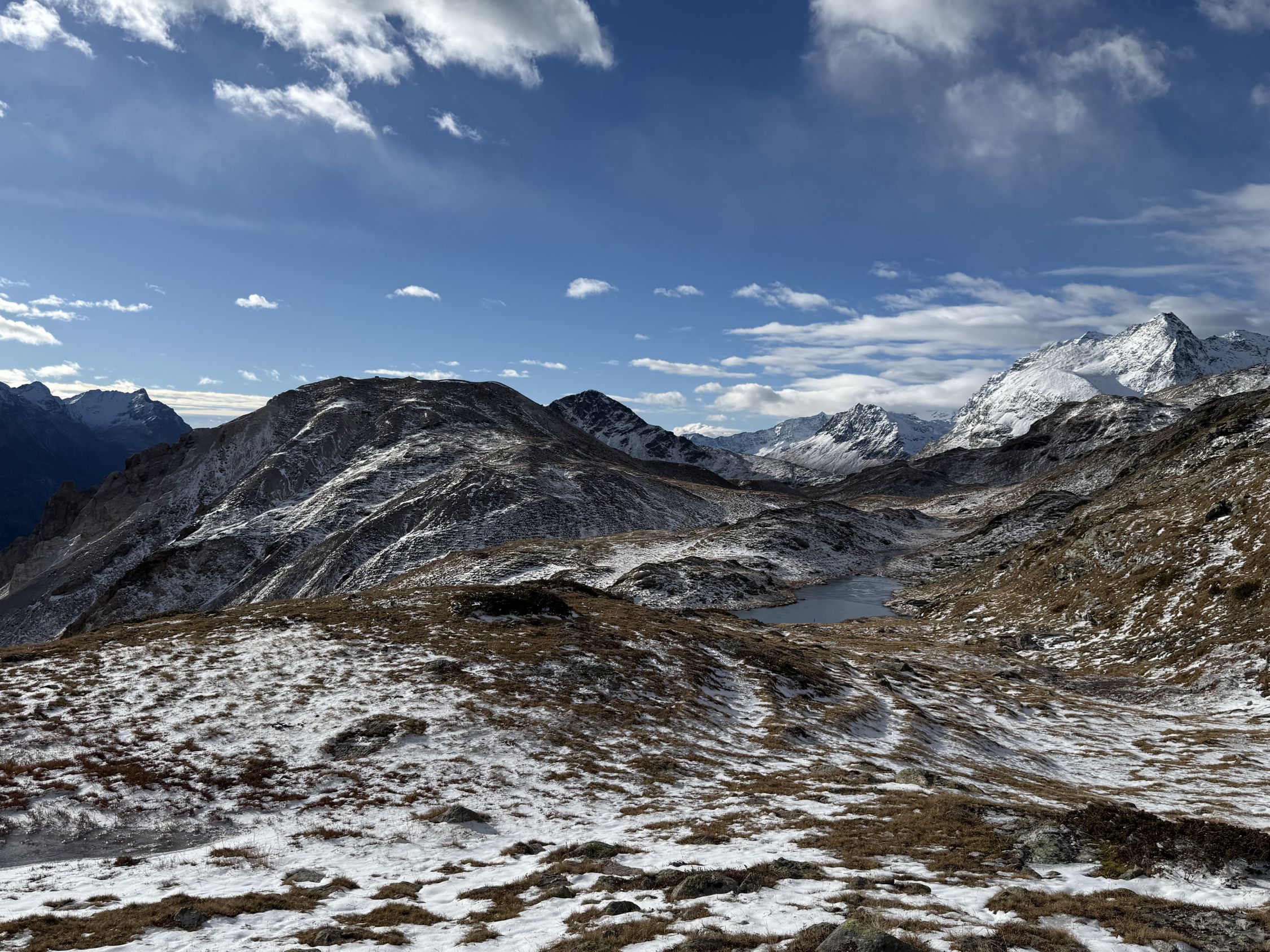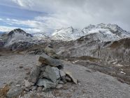 Frostige kurze und einfacheTour auf den markanten Gipsberg südöstlich Fuorcla Minor. T3+. ÖV Tour, Start 9 Uhr Forcola di Livigno, erster Bus ab Bernina Albergo, minus 4 Grad, starker Westwind, leicht bewölkt. Der rotweiss markierte Wanderweg hatte stellenweise Eis und Schnee, ab Höhe 2415 runter zum Seelein und unschwierig die Westflanke hoch zum Gipfel. Abstieg mit Grödel wegen Eis. Mittagessen im Tridentina Forcola di Livigno, hervorragend und preiswert, inkl. Sforzato und Panna Cotta. Rückfahrt mit Bus alle zwei Stunden noch bis Sonntag, 26.10.25.