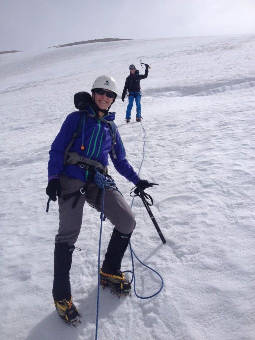 Insgesamt noch sehr gut Bedingungen, mit zunehmender Steilheit wird der Gletscher langsam aper, und wenig Blankeis sichtbar im oberen Teil der NW-Flanke.