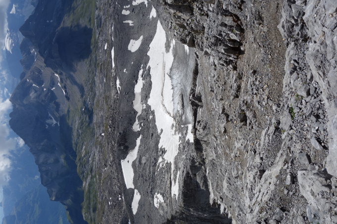 Perfekte Verhältnisse, alle Schneefelder und der kleine Firn können problemlos umgehen werden; deshalb Steigeisen und Pickel nicht notwendig. Helm sehr empfehlenswert, vor allem wenn mehr als eine Gruppe sich im Gipfelaufstieg (Band) befindet.