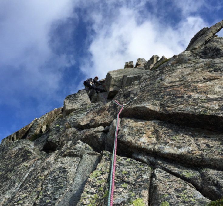 Kurz vor 7Uhr beim Stausee los. Auf gutem Wanderweg in schönster Morgenstimmung, mit Blick zur Dammagruppe, hoch zur Bergseehütte. Kurz vor der Hütte gerade weiter zum Einstieg des Vorbau. In schöner gut gesicherter Kletterei in 3SL zum ersten Turm hoch. Dann locker absteigend dem Klettersteig entlang zum zweiten Turm. In weiteren netten 2SL auf diesen Gipfel. Nun einmal 50m nach Westen abseilend hinunter. Nun in 2Min Fussaufstieg zum Einstieg der Route Tonis Lust in der S-Wand. Nun in toller Kletterei über diese Route hoch. Sie wurde gerade neu saniert, der Bohrstaub ist noch sichtbar. In den ersten beiden Längen wurden zusätzliche Haken angebracht, da kommt man nun etwas entspannter über die schwierigen Plattenstellen hoch. Am Schluss nach der Route Tonis Lust, natürlich noch weiter über die letzten Längen des S-Grates zum Gipfel. Dies ist immer wieder eine herrliche, lohnende Routen-Kombination zum Gipfel des Bergseeschijen.