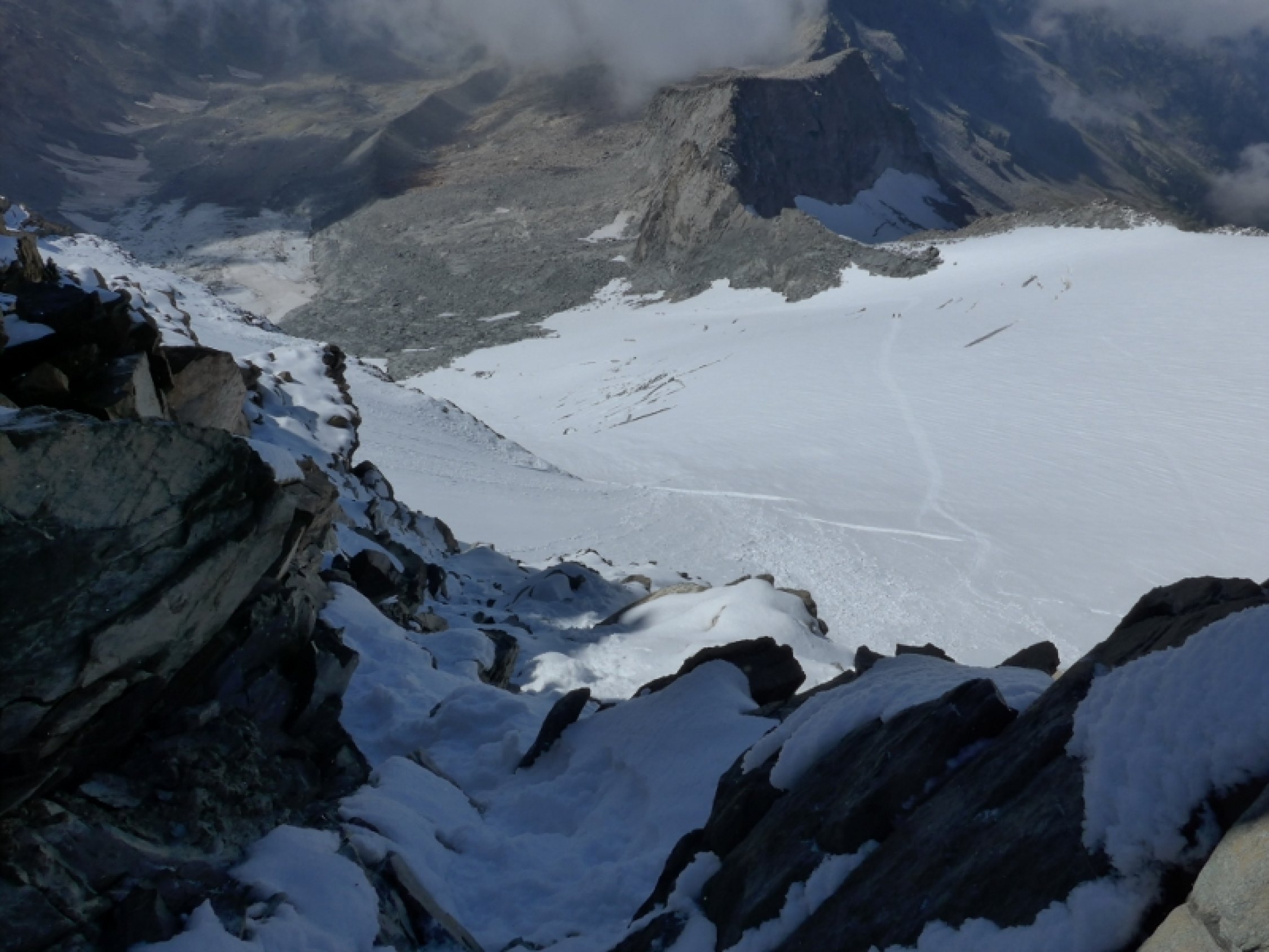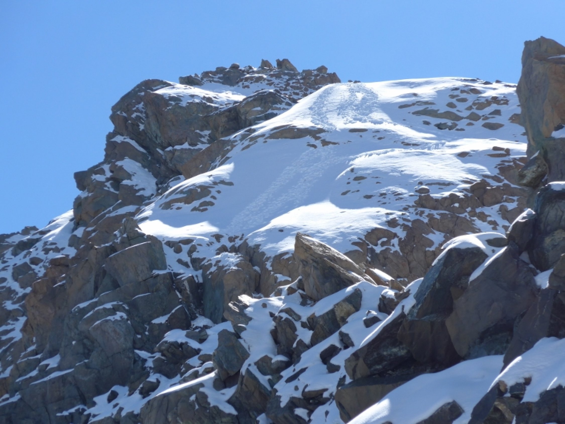 Gute Verhältnisse. Zwar auf Gletscher und Grat einiges an Neuschnee, der sich jedoch bereits gut gesetzt hat. Felsen nicht vereist, Cavallo di bronzo trocken.