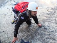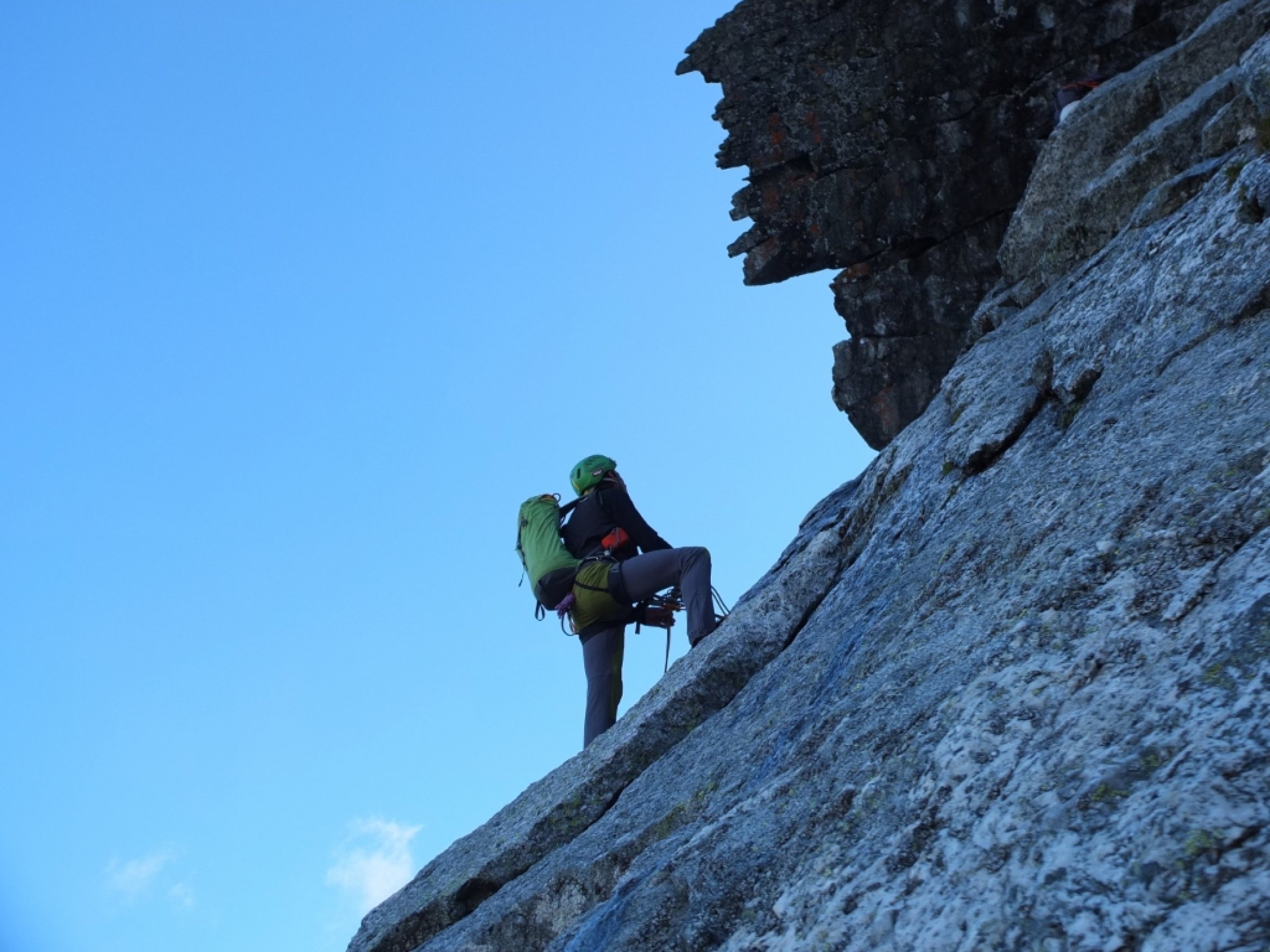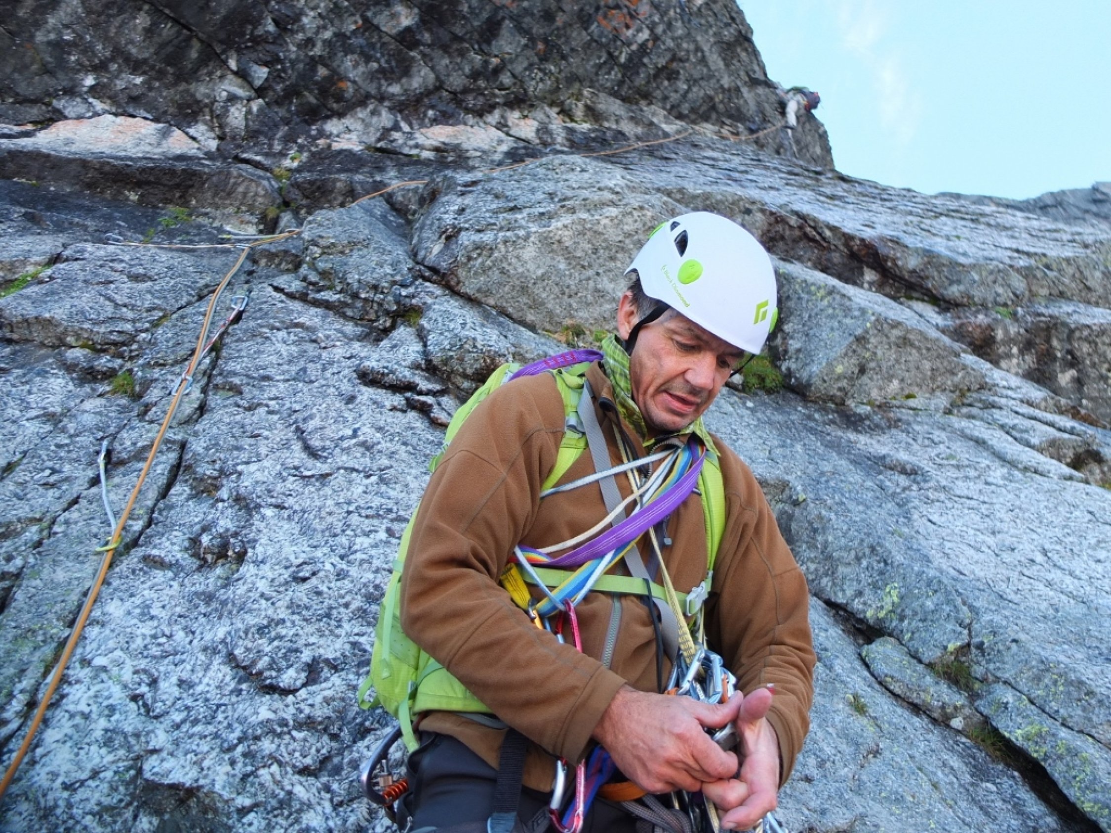 Es stecken jedoch viele Haken, was Balsam für die Psyche ist. Über dem Überhang können wir feines Plattenklettern bei Sonnenschein und milden Temperaturen geniessen. Nach erreichen des Gipfels, haben wir dann alles abgeseilt über Route. Die erste Abseilstelle ist ca. 20 m nördlich vom höchsten Gipfel, an alten verbleichten Schlingen, in der Westwand, etwa 4 m unter Grat. In der ersten Abseil-SL muss der nächste Muniring-Stand etwa 10 m nördlich von der Fallinie gesucht werden. Danach folgen nach jeweils 50 m die soliden Muniringe. Seil abziehen ging jeweils problemlos. Lange Tour, beim letzten mal Abseilen bereits wieder dunkel!