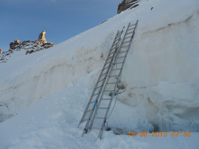 Top.Am Gipfelbergschrund stehen 2 Leitern.