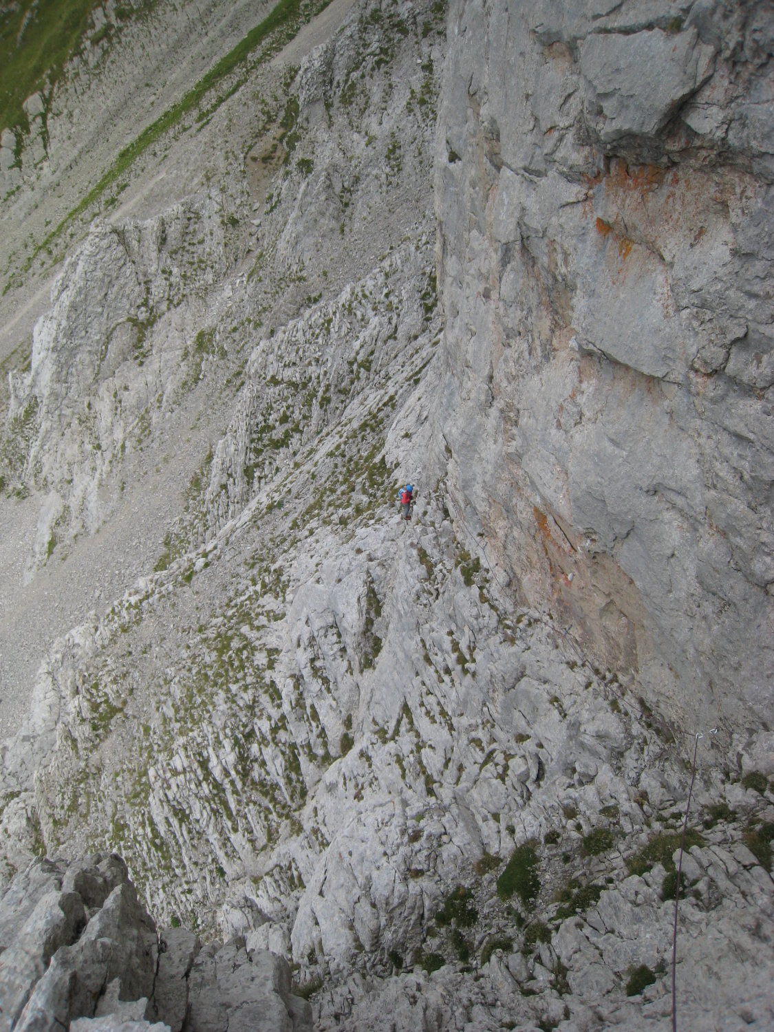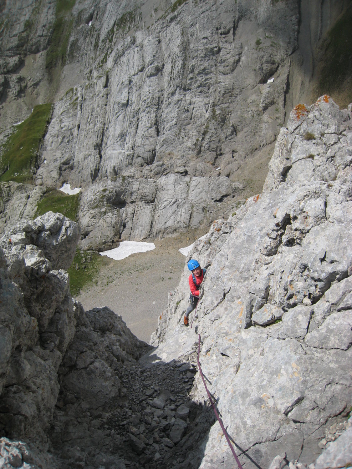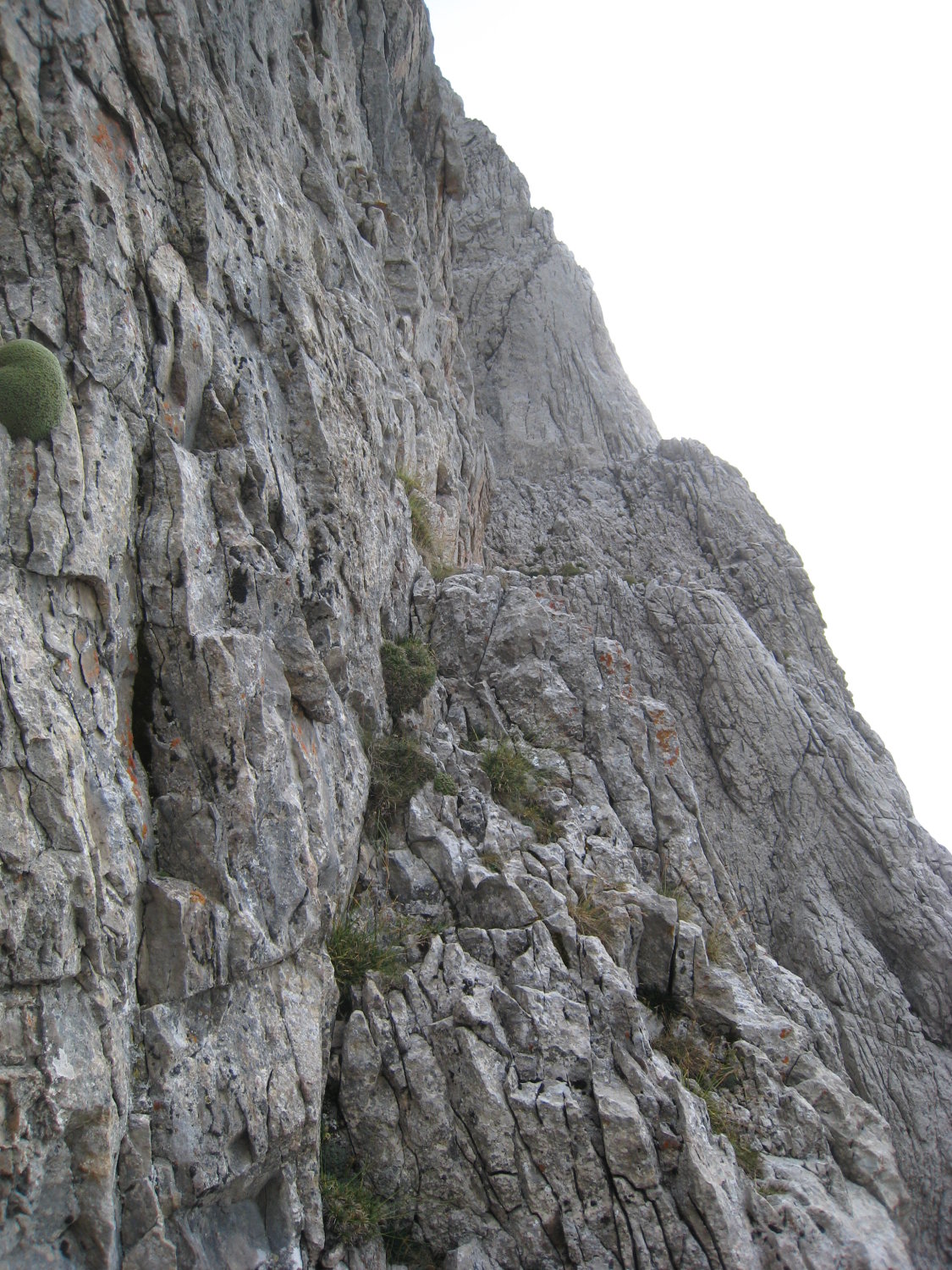Dem Wetter entflohen, hat grad am Abstieg des Normalwegs zum Tröpfeln angefangen, aber alles noch gehalten - Dank dem Fön! Haben SL 4+5 mit 70m Seil aneinandergehängt, geht einwandfrei auf 65m, sonst kann man das eh auch dezent frei gehen. SS in SL 3 einzige schwere Stelle (de facto 4c) in der sonst wunderschönen SL, k.A. wieso man das A0 gehen sollte, weil hochgreifen muss man sowieso ;). Eigentlich sollte die Route aus 7 solchen SL bestehen, dann wäre es ein Top-Klassiker. Stand SL6 um die Ecke...fast vorbeigerauscht...also es verleitet quasi dazu :)